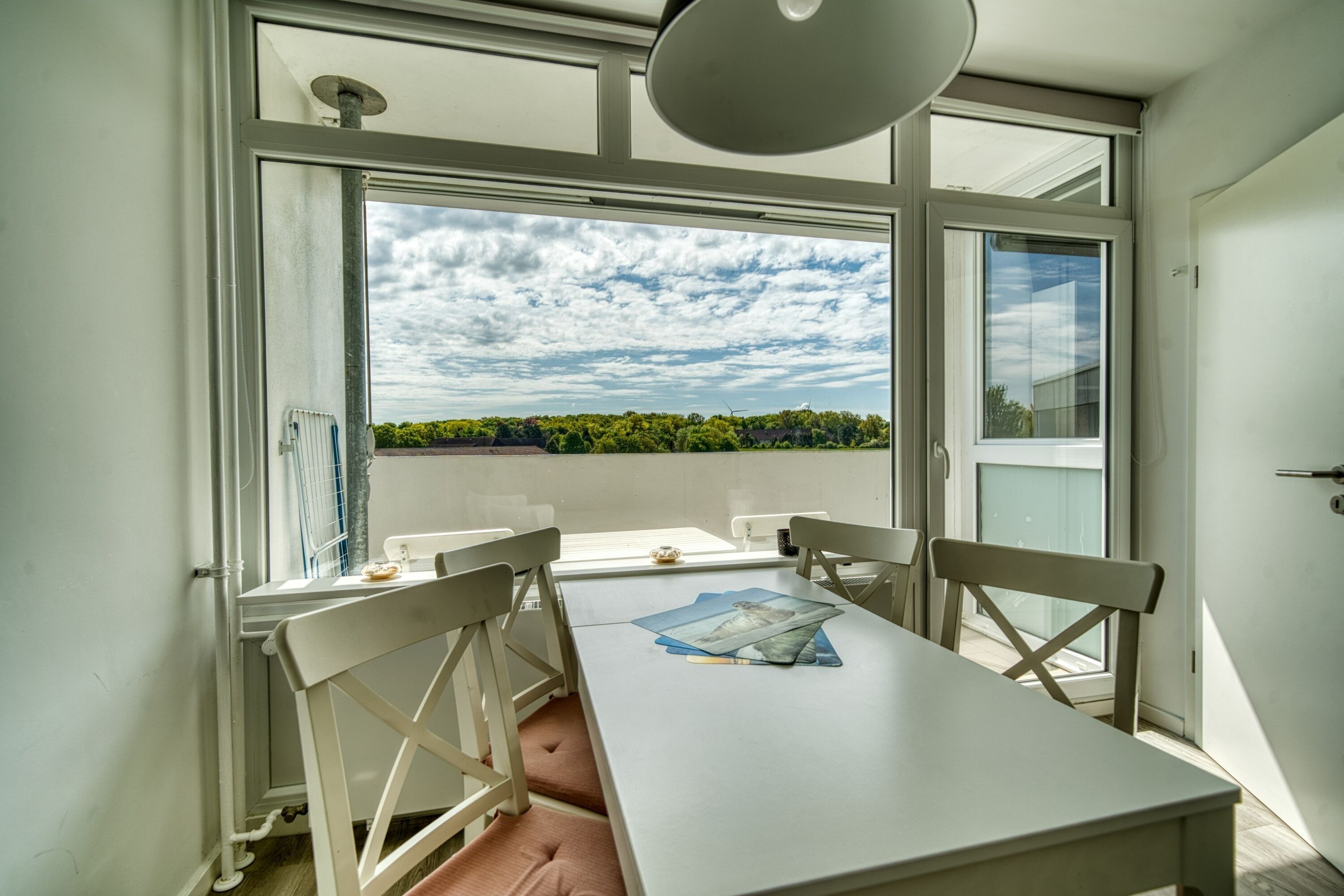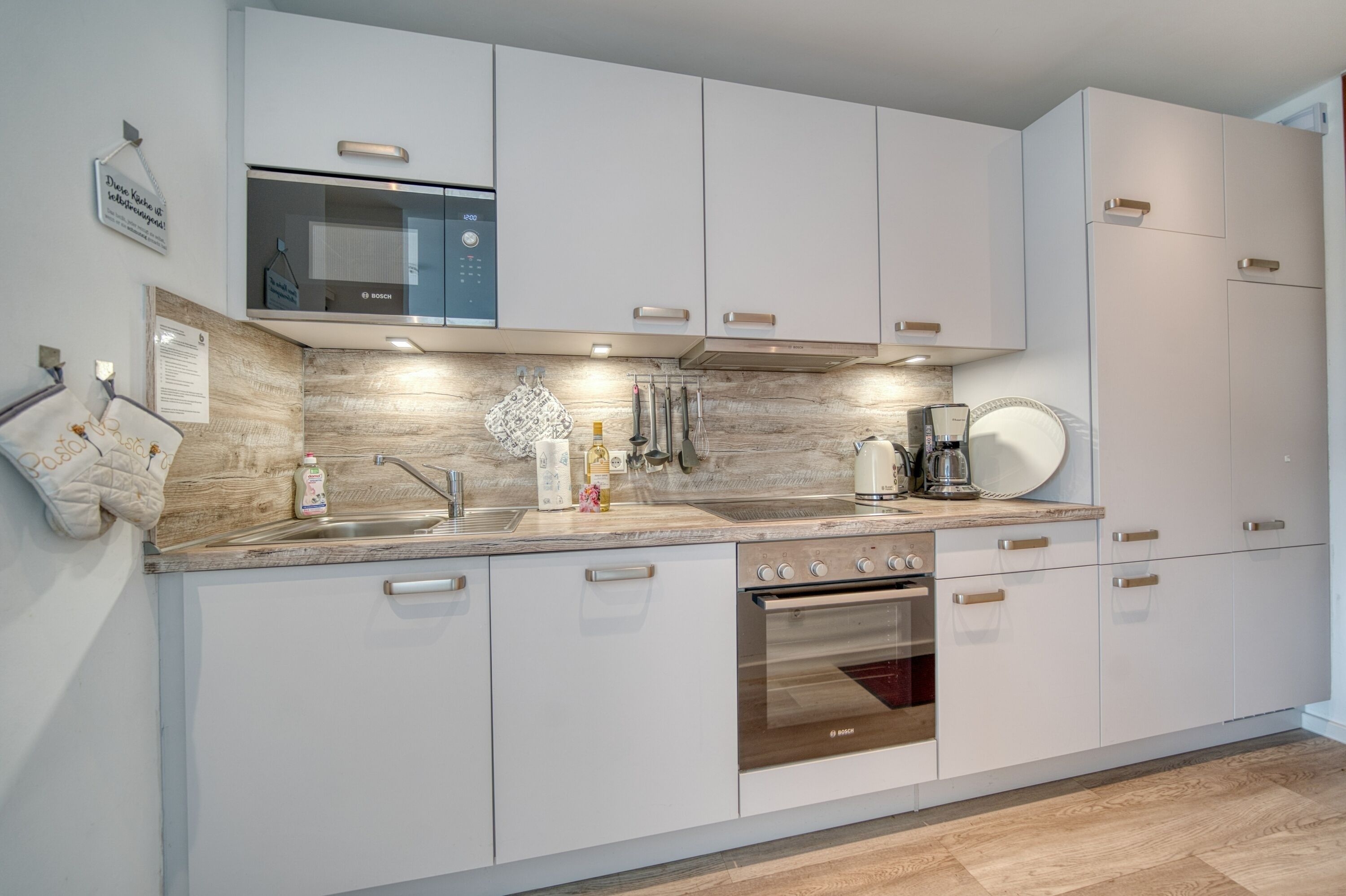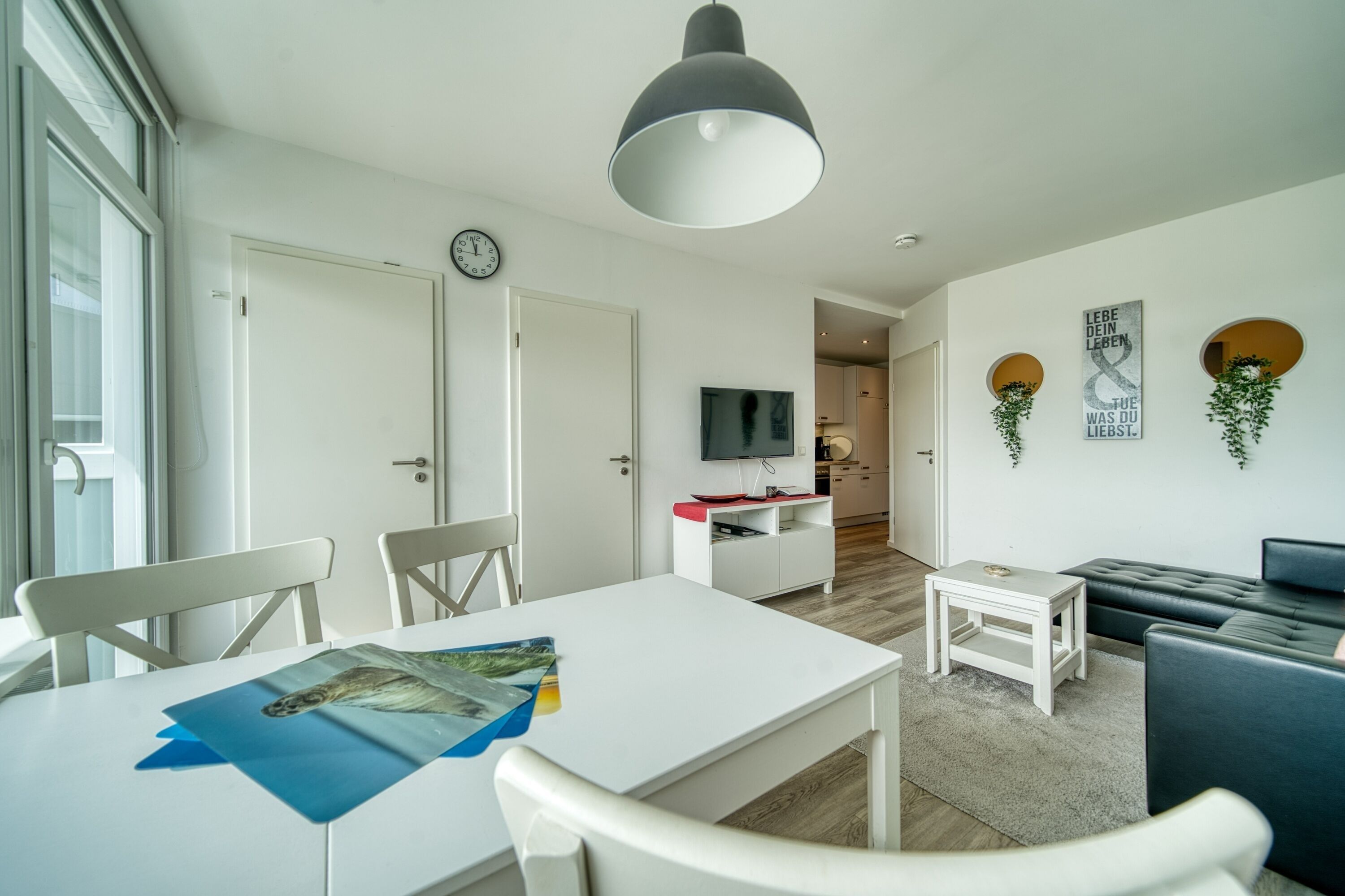 Liebevoll eingerichtete 45 m² Ferienwohnung im 5. OG des Hauses O für bis zu 4 Personen. Wohnbereich mit Sofa, Flachbild-TV und Esstisch vor dem Südbalkon. Separates Schlafzimmer mit Doppelbett und TV, Kinderzimmer mit Etagenbett und TV. Küche mit Ceranherd, Kühlschrank mit Gefrierfach, Backofen, Mikrowelle, Toaster, Wasserkocher. Modernes Bad mit Duschkabine und Handtuchtrockner. Vinylboden in der gesamten Wohnung.