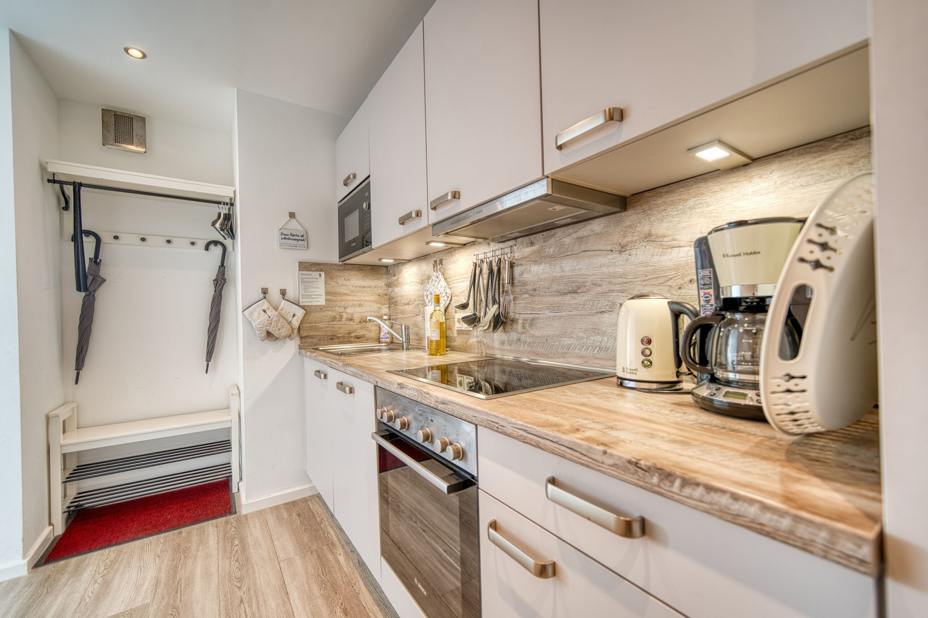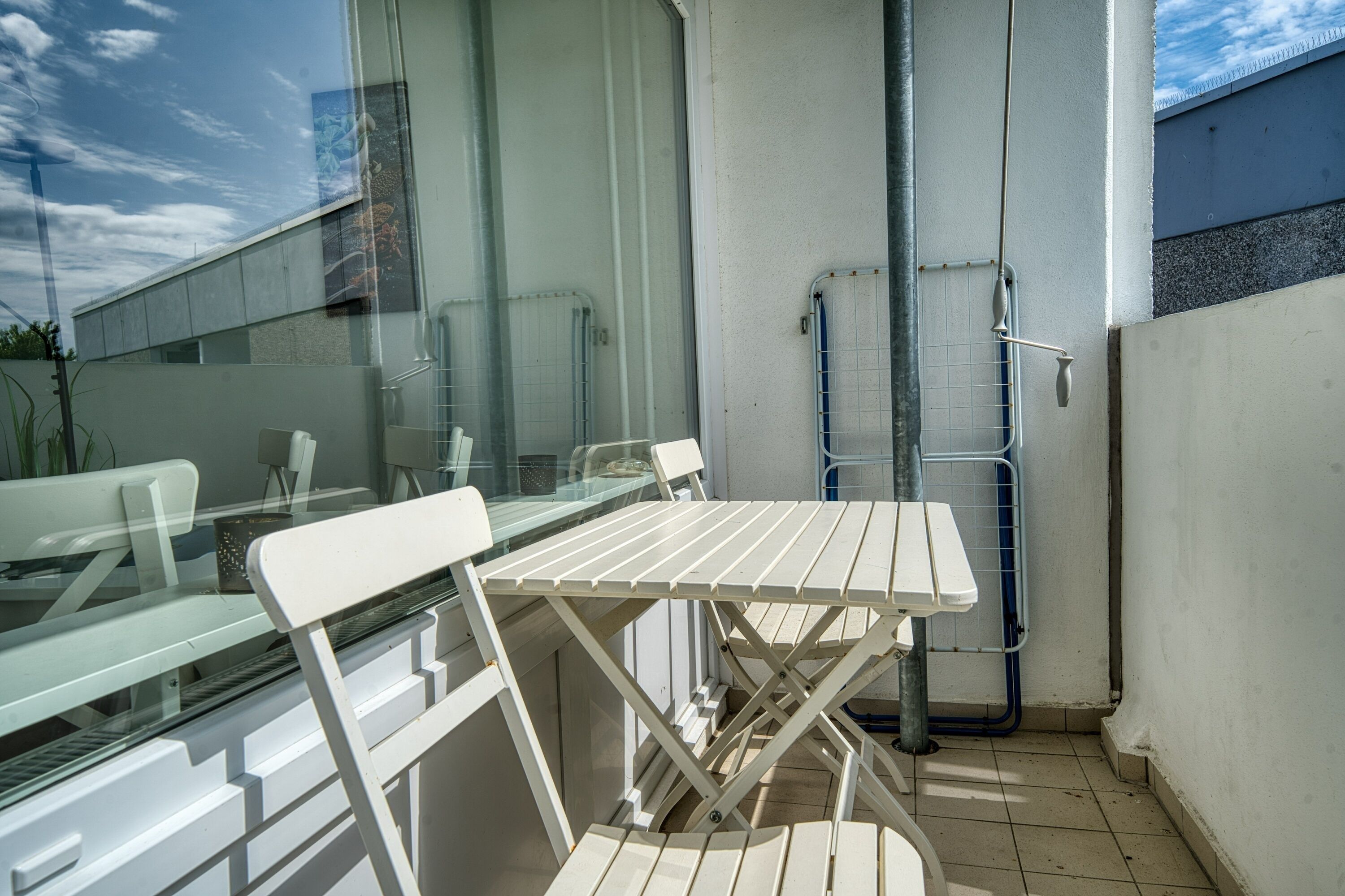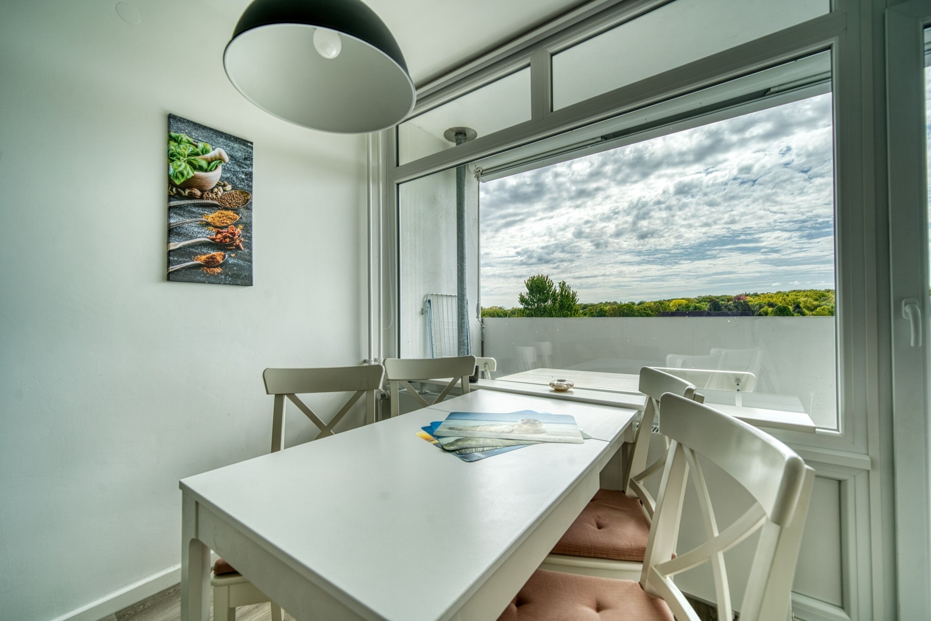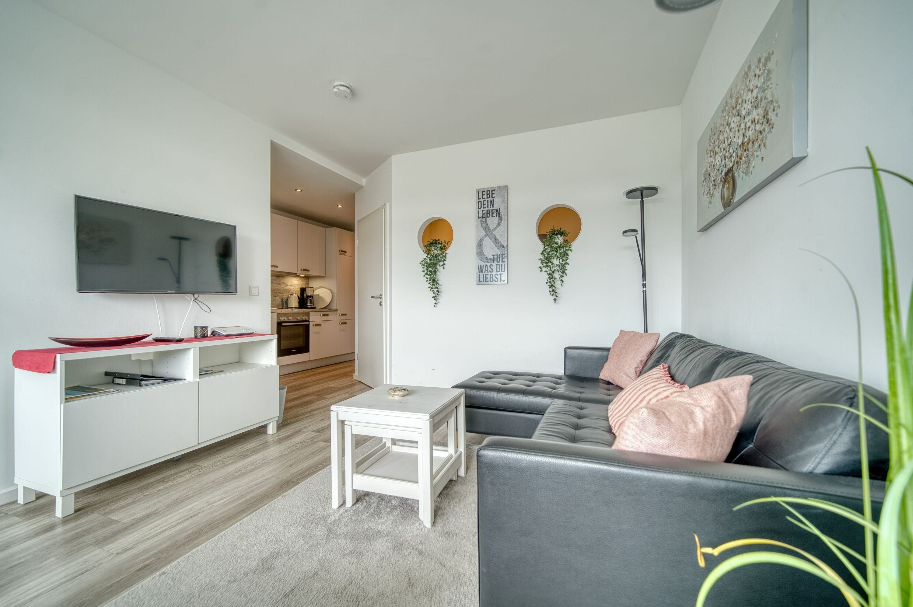 Liebevoll eingerichtete 45 m² Ferienwohnung im 5. OG des Hauses O für bis zu 4 Personen. Wohnbereich mit Sofa, Flachbild-TV und Esstisch vor dem Südbalkon. Separates Schlafzimmer mit Doppelbett und TV, Kinderzimmer mit Etagenbett und TV. Küche mit Ceranherd, Kühlschrank mit Gefrierfach, Backofen, Mikrowelle, Toaster, Wasserkocher. Modernes Bad mit Duschkabine und Handtuchtrockner. Vinylboden in der gesamten Wohnung.