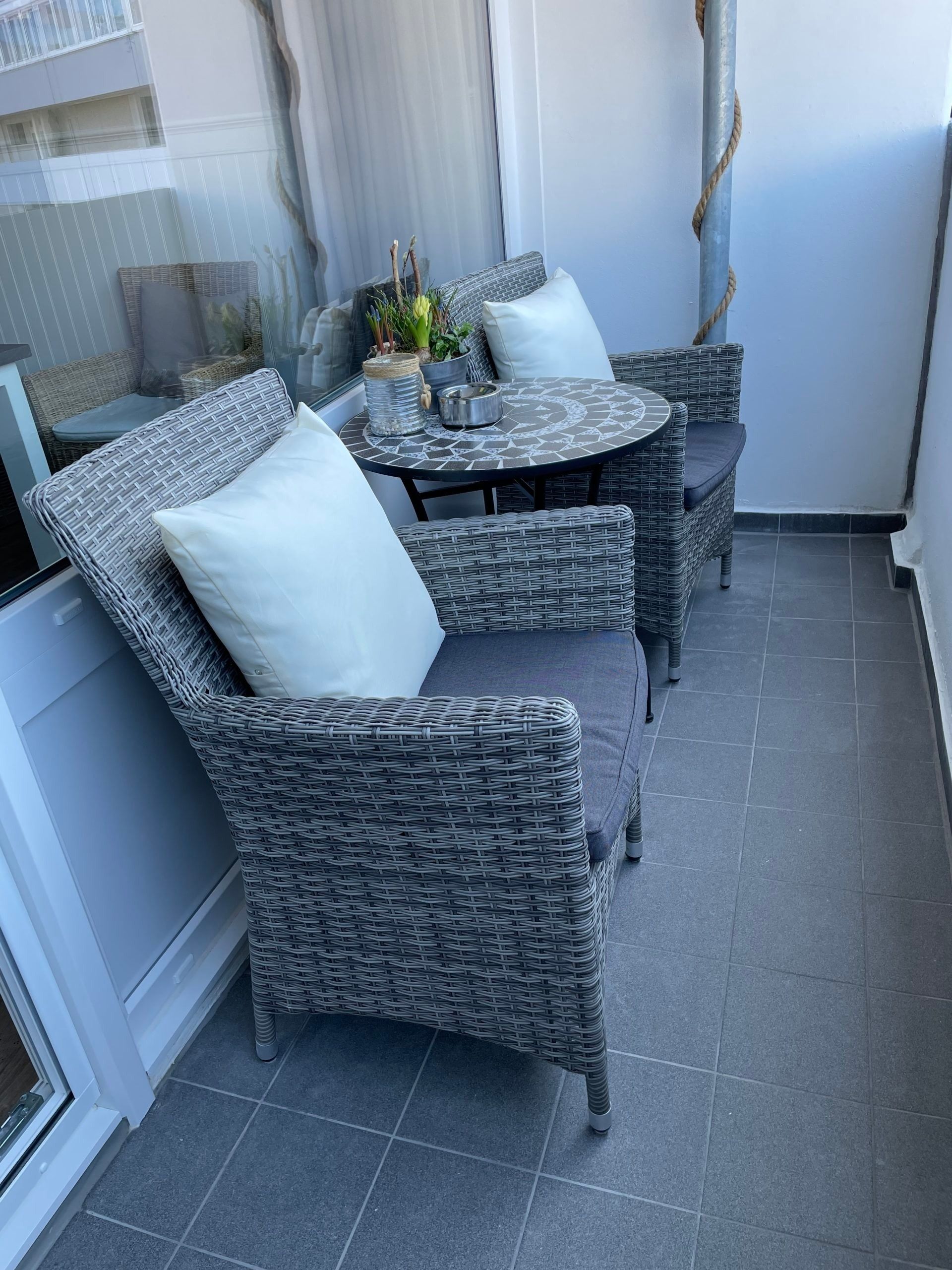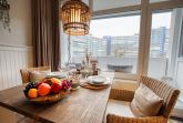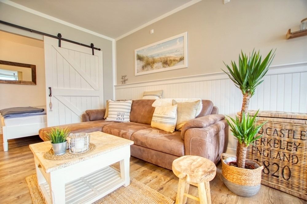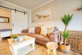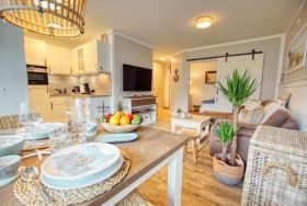 Diese modern eingerichtete Ferienwohnung im Haus Q des Ferienparks Heiligenhafen bietet auf 45 m² komfortablen Platz für 2 Personen im maritimen Beachstyle. Der ruhige Balkon mit Blick auf den grünen Innenhof lädt zum Entspannen ein.