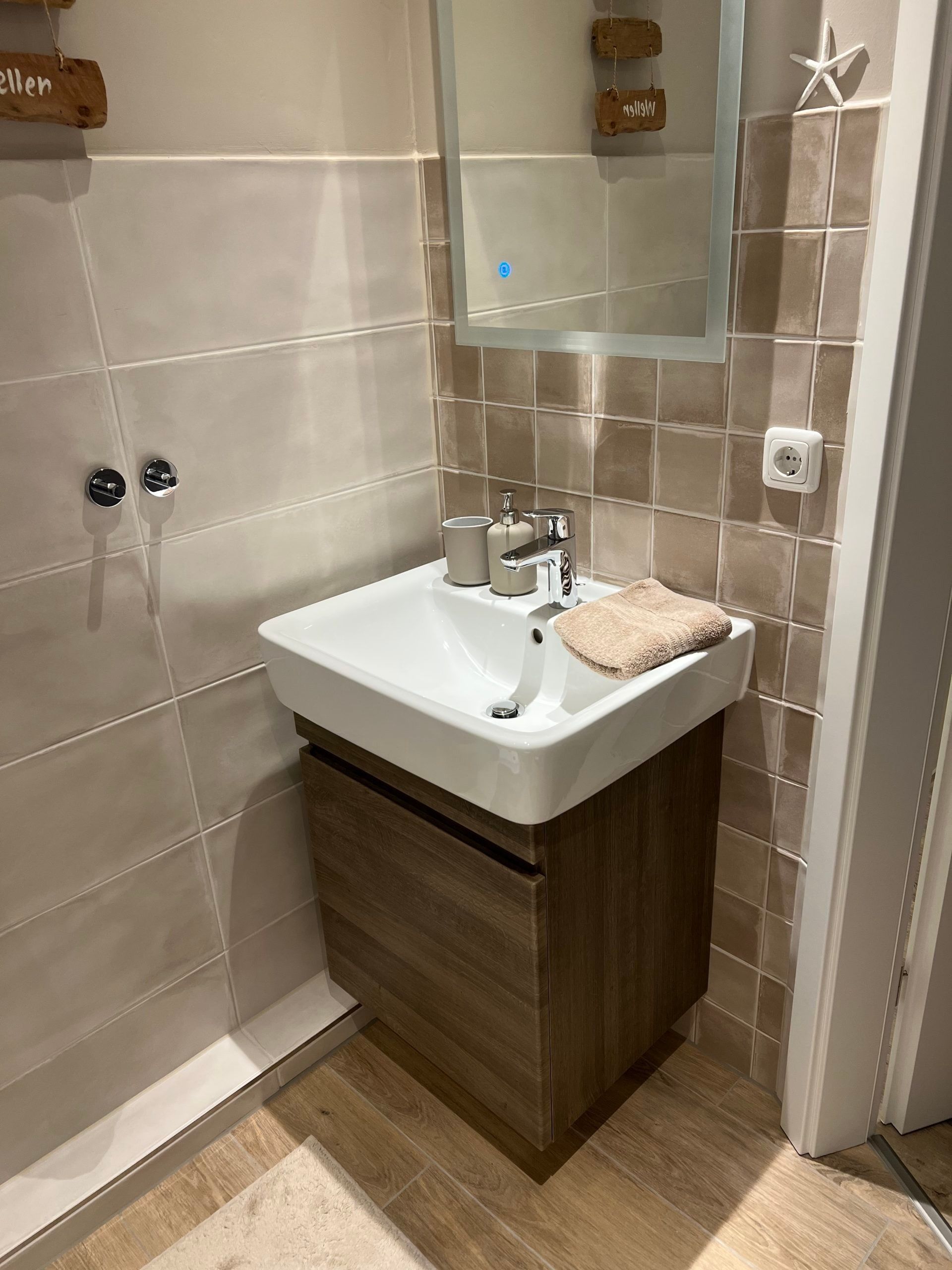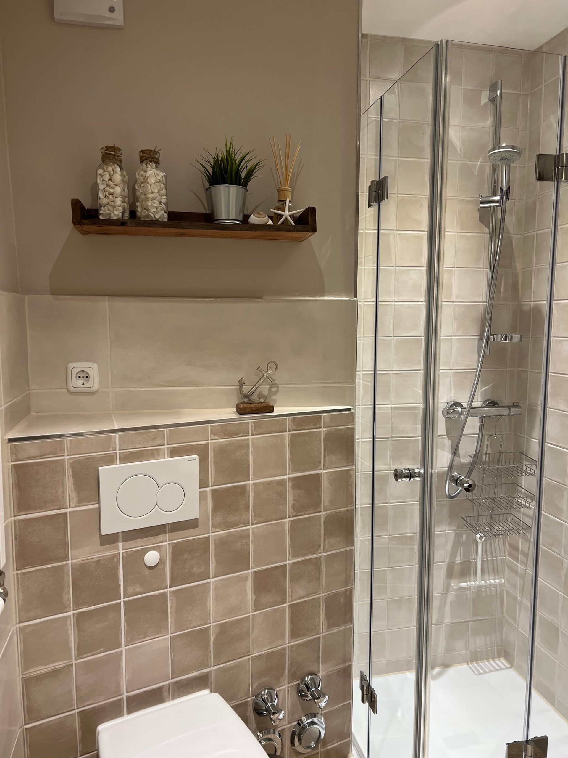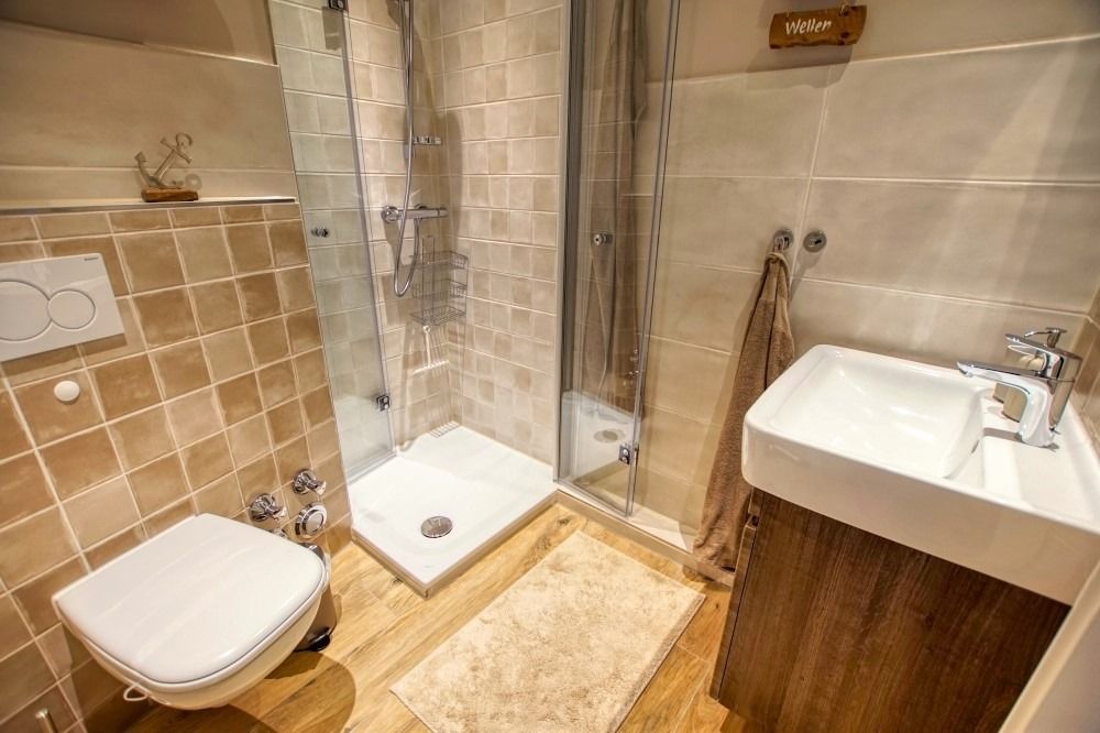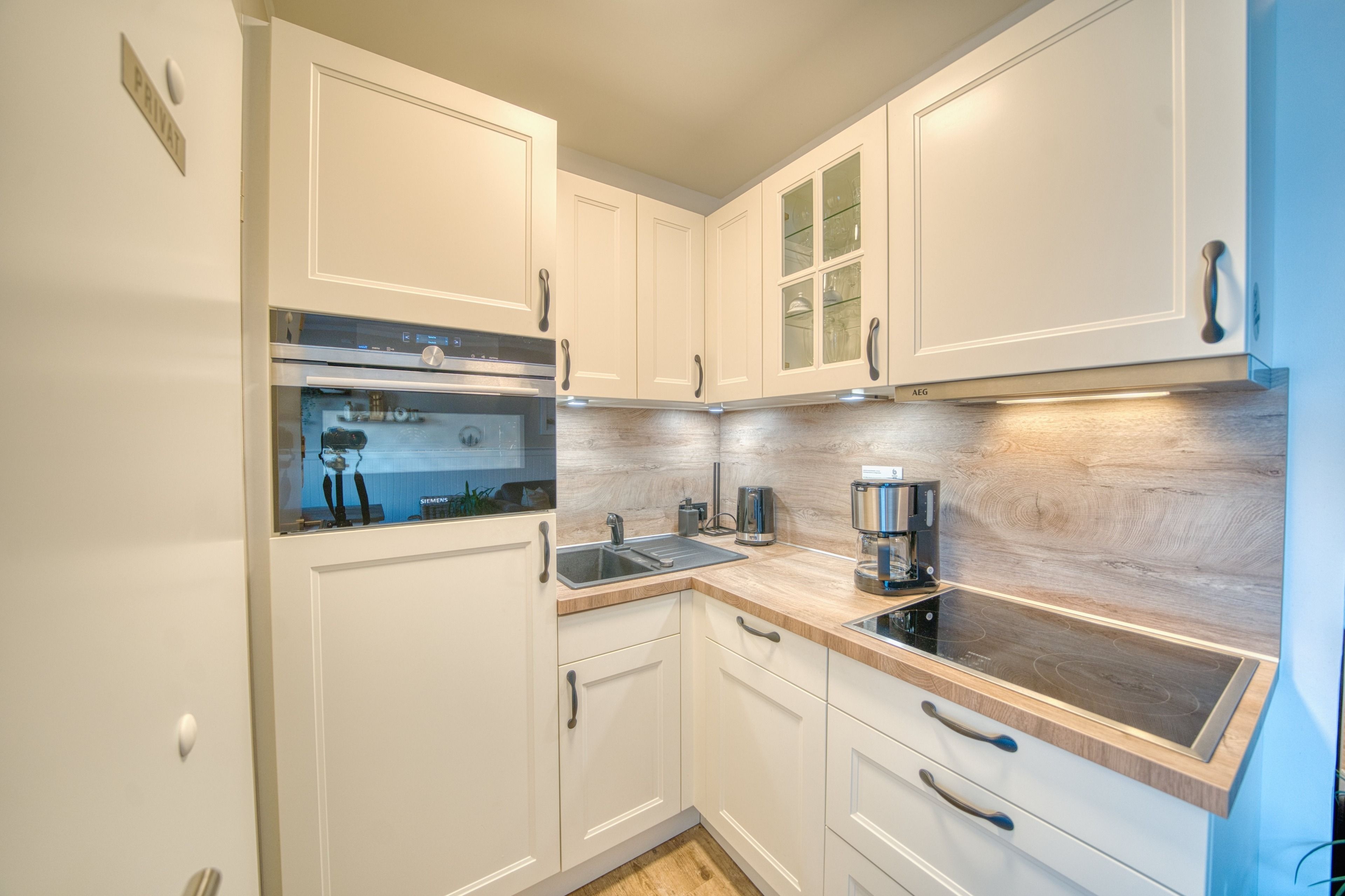 Die hochwertige Küche bietet Induktionsherd, Backofen, Geschirrspüler, Kühlschrank mit Gefrierfach sowie Toaster, Kaffeemaschine und Wasserkocher. Das vergrößerte Bad ist mit niedriger Duschtasse, Duschkabine und WC ausgestattet.