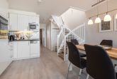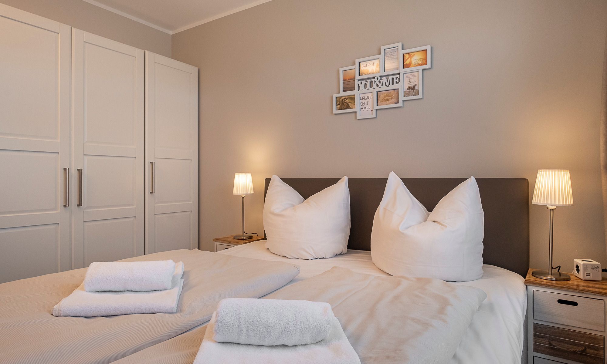 Im ersten Bereich erwartet Sie schon beim Betreten der Wohnung ein traumhafter Meerblick. Der Balkon mit weitem Blick über die Lübecker Bucht lädt zum Verweilen ein. Die Küchenzeile enthält alles, was Sie für einen bequemen Aufenthalt benötigen. Auch das Essen am großen Esstisch ist mit Meerblick zu genießen. Das Duschbad ist hell und freundlich. Auch haben Sie auf dieser Ebene ein Schlafzimmer mit Doppelbett (1,80 x 2,00 m) und Kleiderschrank. Über eine bequeme Treppe erreichen Sie das Obergeschoss. Hier sind zwei weitere Schlafzimmer mit einem Doppelbett (1,80 x 2,00 m) bzw. zwei Einzelbetten (0,90 x 2,00 m). Das Wannenbad ist in heller, freundlicher Optik gestaltet. Angrenzend an dem Elternschlafzimmer befindet sich die sehr schöne Dachterrasse nach Westen – hier stehen Ihnen eine Markise, Tisch und Stühle zur Verfügung. Das zweite Schlafzimmer auf dieser Ebene hat zwei Einzelbetten, die auch zusammengestellt werden können. Aus diesem Zimmer haben Sie einen weiten Meerblick. Alle Schlafzimmer lassen sich verdunkeln.