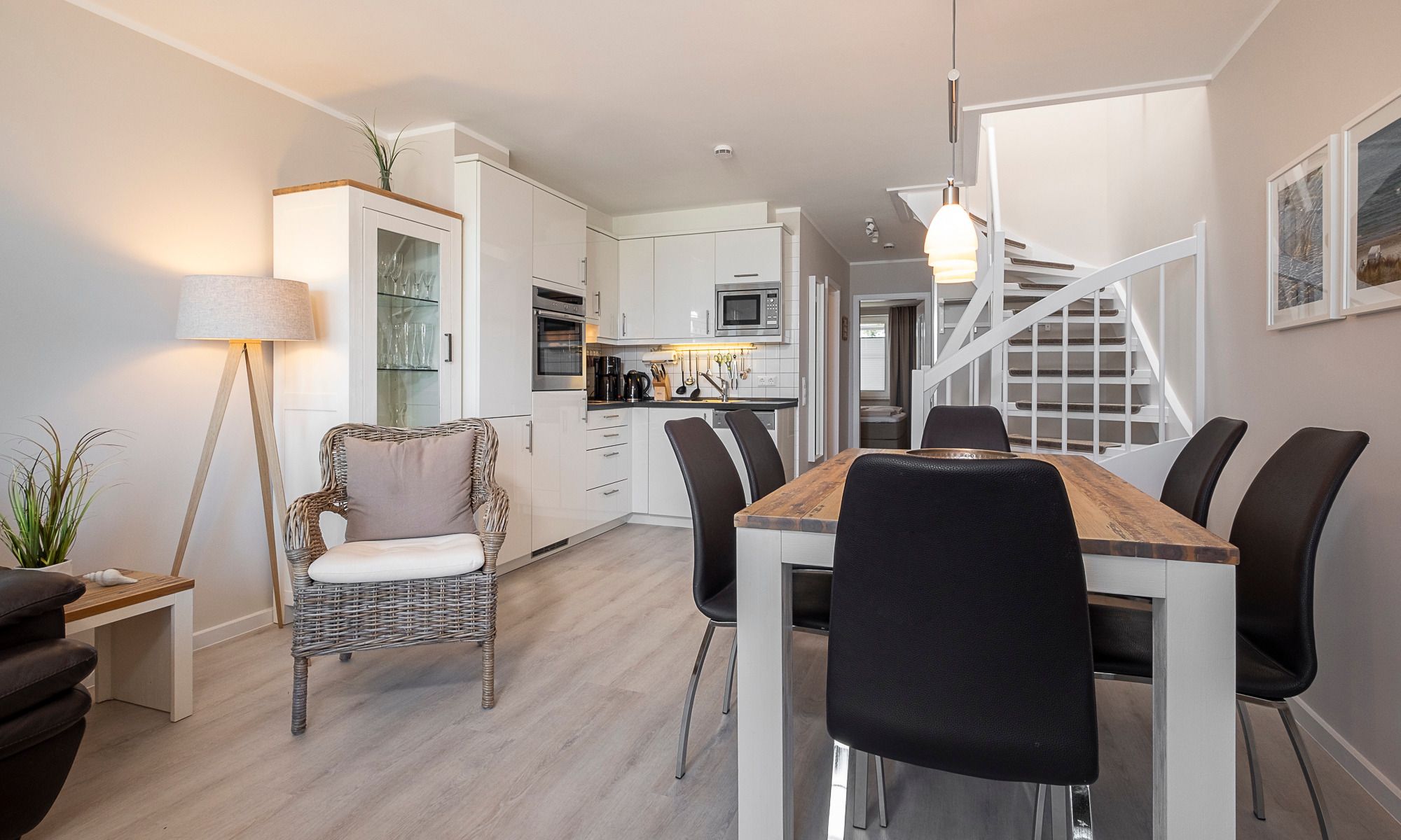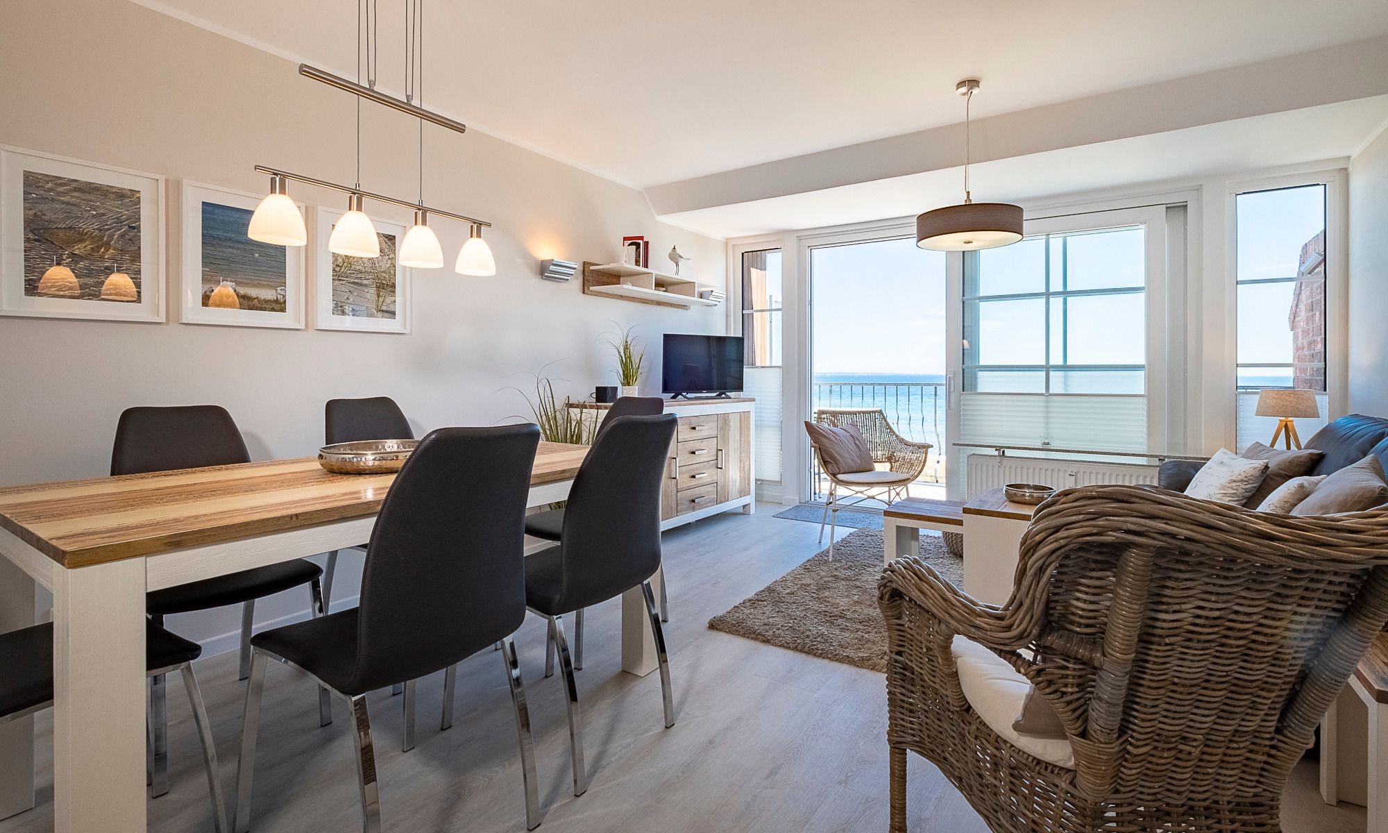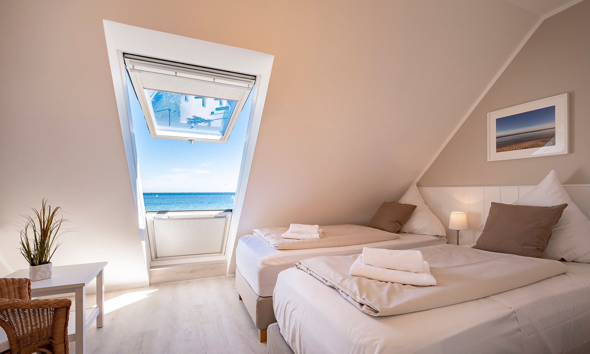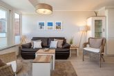 Meereszauber im Hause Windrose. 4-Zimmer-Ferienwohnung, ca. 80 m², über 2 Ebenen, drei Schlafzimmer, 2 Balkone, zwei Bäder und ein PKW-Stellplatz, für bis zu 4 Personen, plus 2 Personen gegen einen Aufpreis von 20,– € pro Tag und Person.