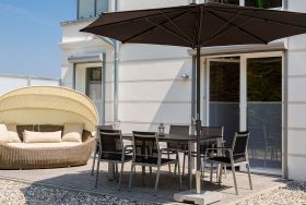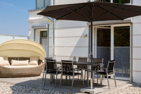 Auf der Terrasse stehen für Sie ein Gartentisch mit sechs Stühlen, eine Lounge-Insel Paradiso sowie ein Sonnenschirm zur Verfügung.
