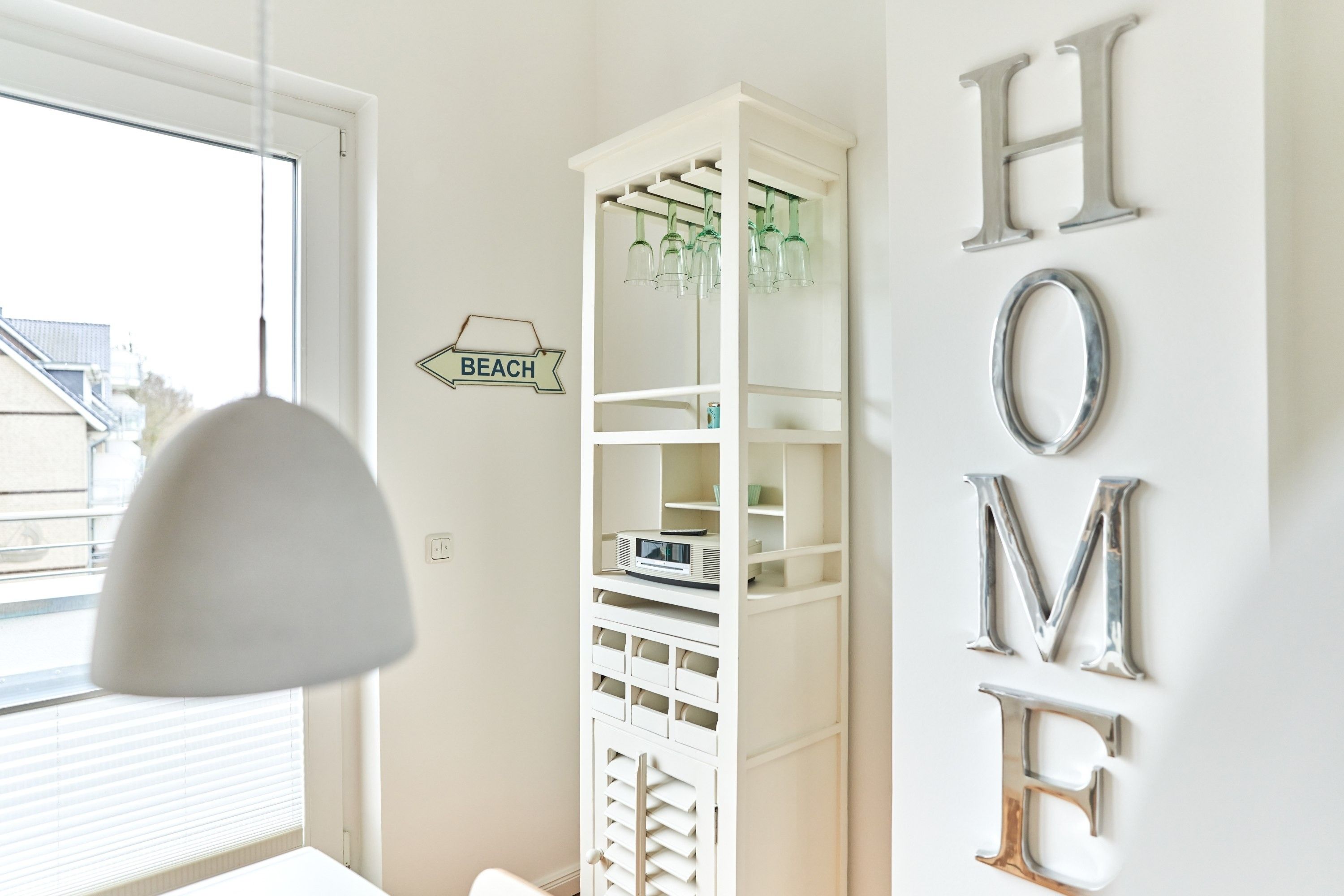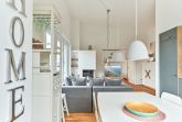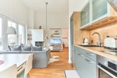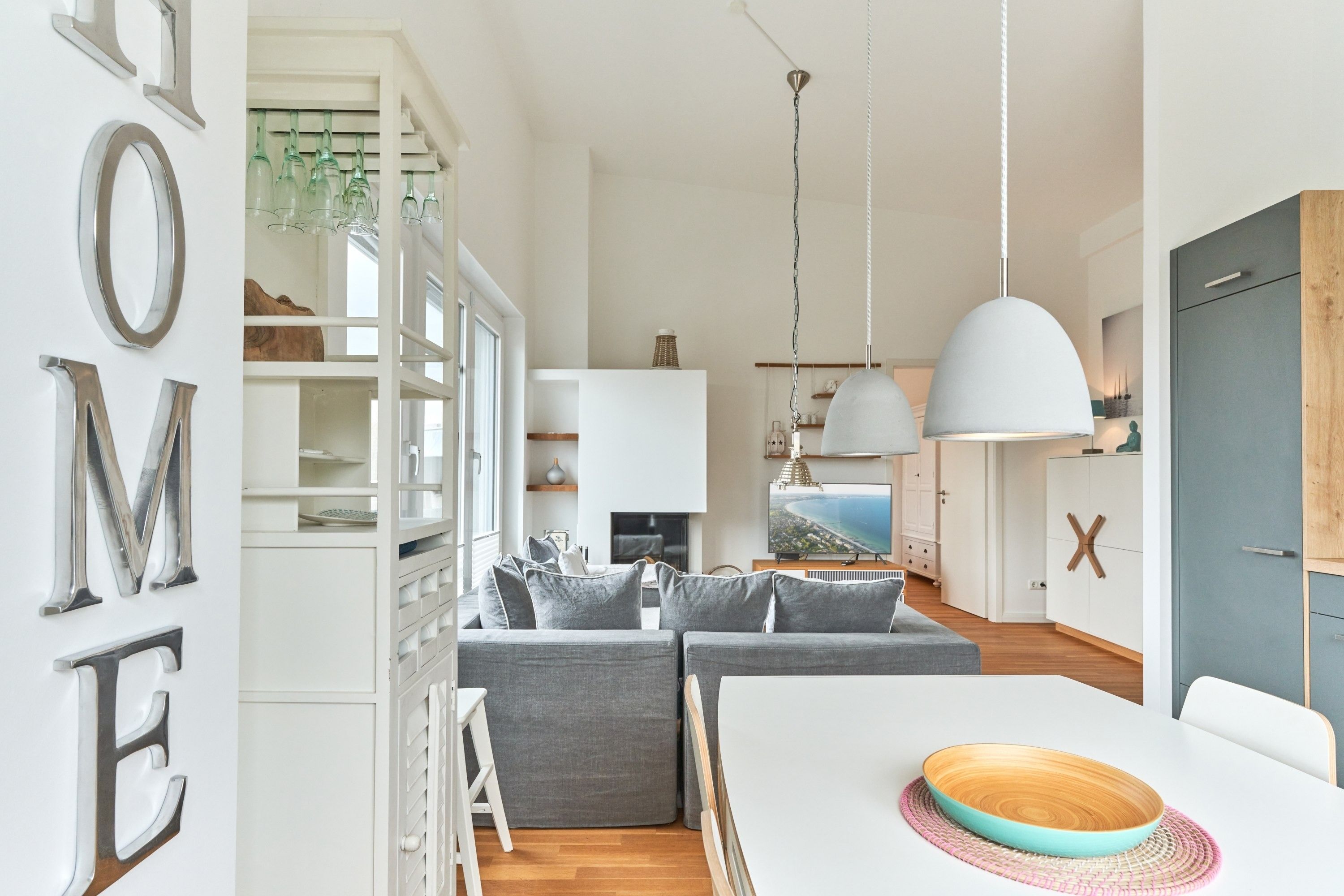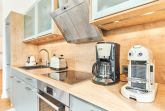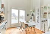 Die Wohnung strahlt eine helle, behagliche Gemütlichkeit aus. Der wohlig warme Holzkamin verzaubert Sie in der Winterzeit mit dem leisen Knistern und Knacken. Die Einbauküche im Wohn-Essbereich ist komplett ausgestattet und lässt keine Wünsche offen; Küchenzeile mit Backofen, Ceran-Kochfeld, Elektroherd, Geschirrspüler, Kühlschrank und Gefrierschrank, Filterkaffeemaschine, Nespresso-Maschine. Der angrenzende Essbereich bietet Platz für bis zu 4 Personen. Der Wohnbereich ist mit einem Sofa, einem Wohnzimmertisch und einem großen TV ausgestattet. Aus allen Räumen gelangen Sie auf die herrliche Dachterrasse nach Südwesten. Hier stehen Ihnen ein Strandkorb, Tisch und Stühle sowie zwei Liegen zur Verfügung.