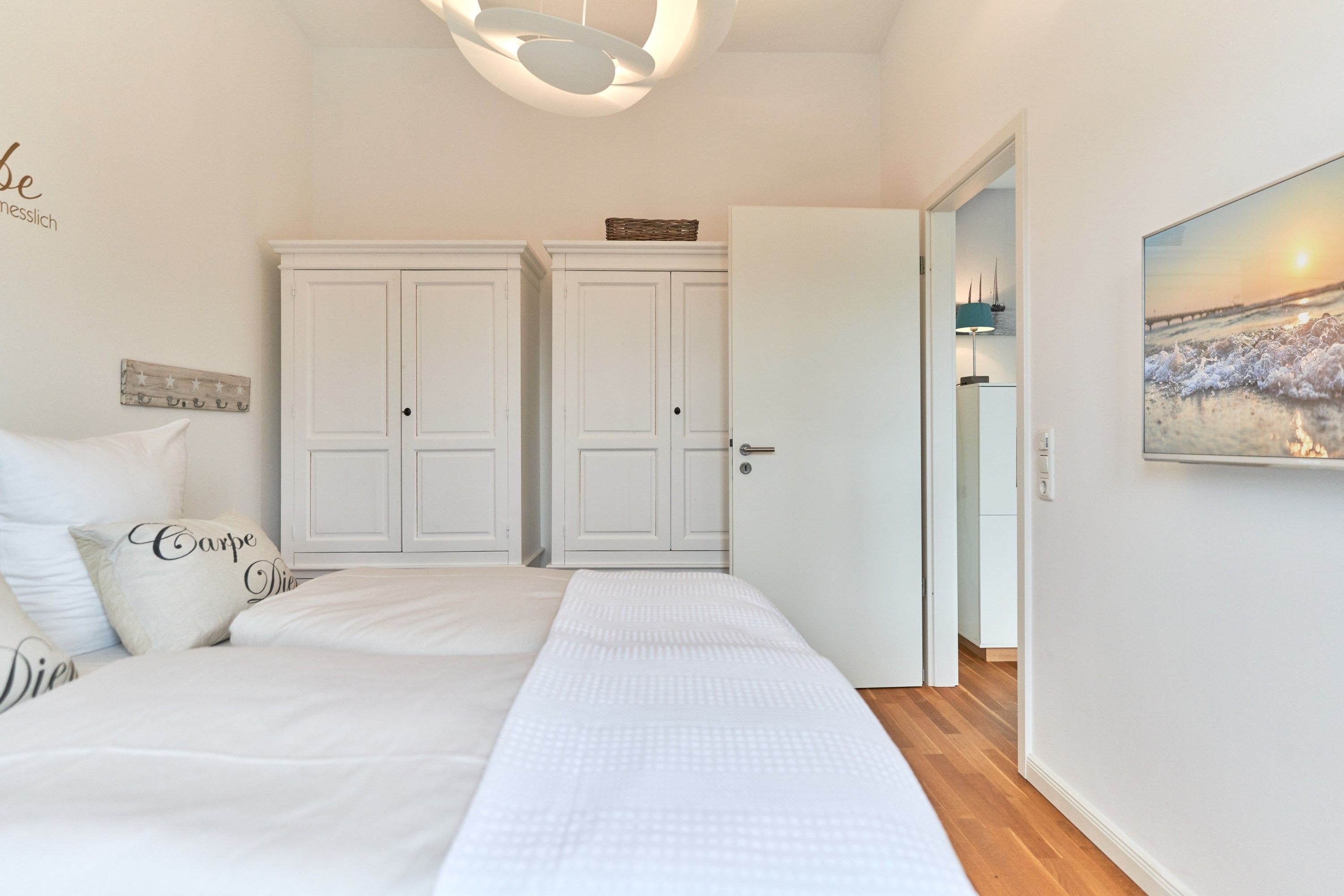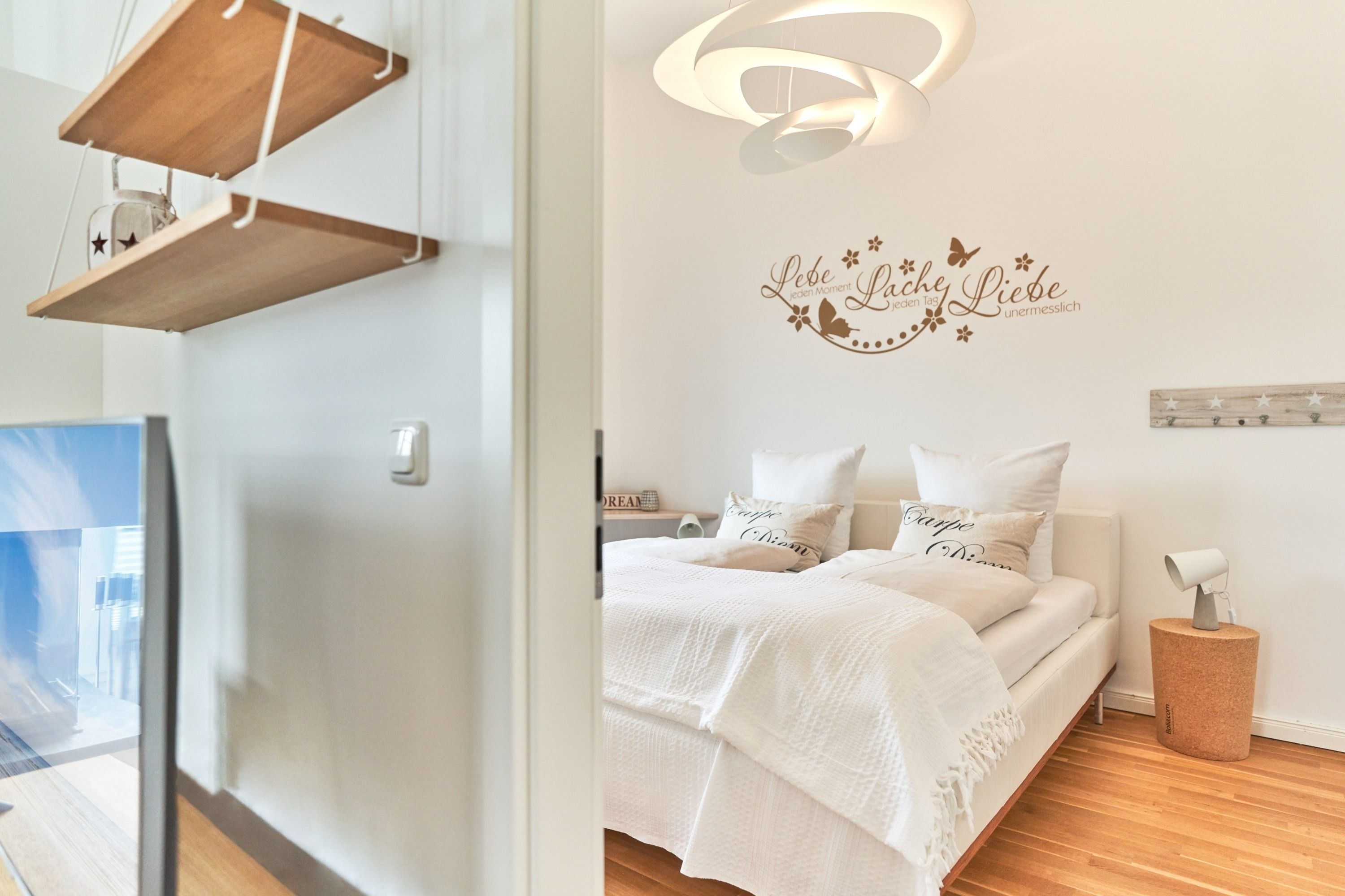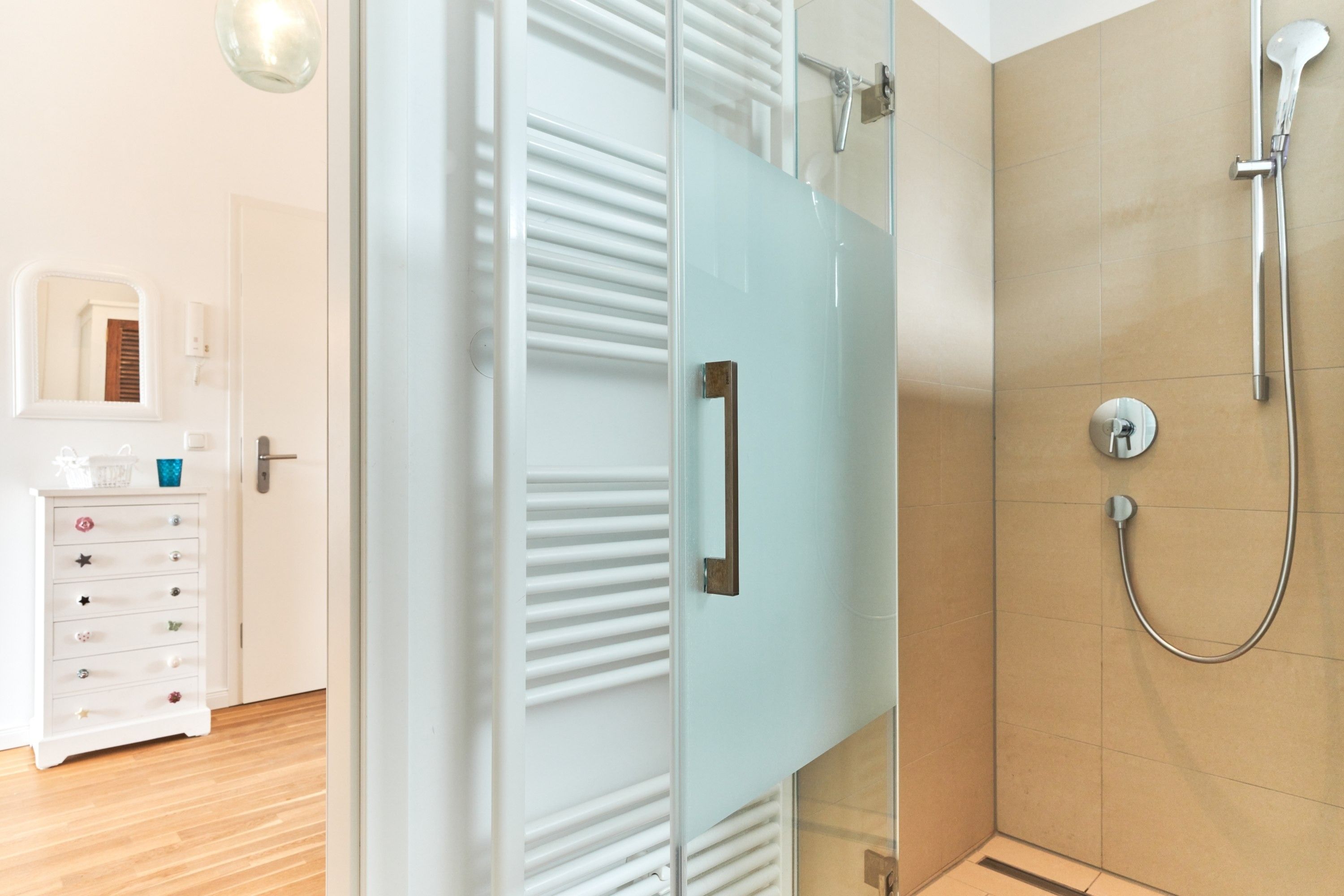 Das 1. Schlafzimmer ist mit einem Polsterbett (1,80 x 2,00m) ausgestattet und verfügt über einen Kleiderschrank, 2 Nachttische und einen TV. Im 2. Schlafzimmer stehen Ihnen ein Polsterdoppelbett (1,60 x 2,00m) und ein Kleiderschrank zur Verfügung. Sind Sie es gewohnt, im Dunkeln zu schlafen, kein Problem, die Fenster sind mit Verdunklungsvorhängen ausgestattet. Das Tageslicht-Duschbad in heller Optik mit bodengleicher Dusche und Handtuchheizkörper, Fön, Kosmetikspiegel, Waschmaschine. Die gesamte Wohnung ist mit einer Fußbodenheizung ausgestattet.