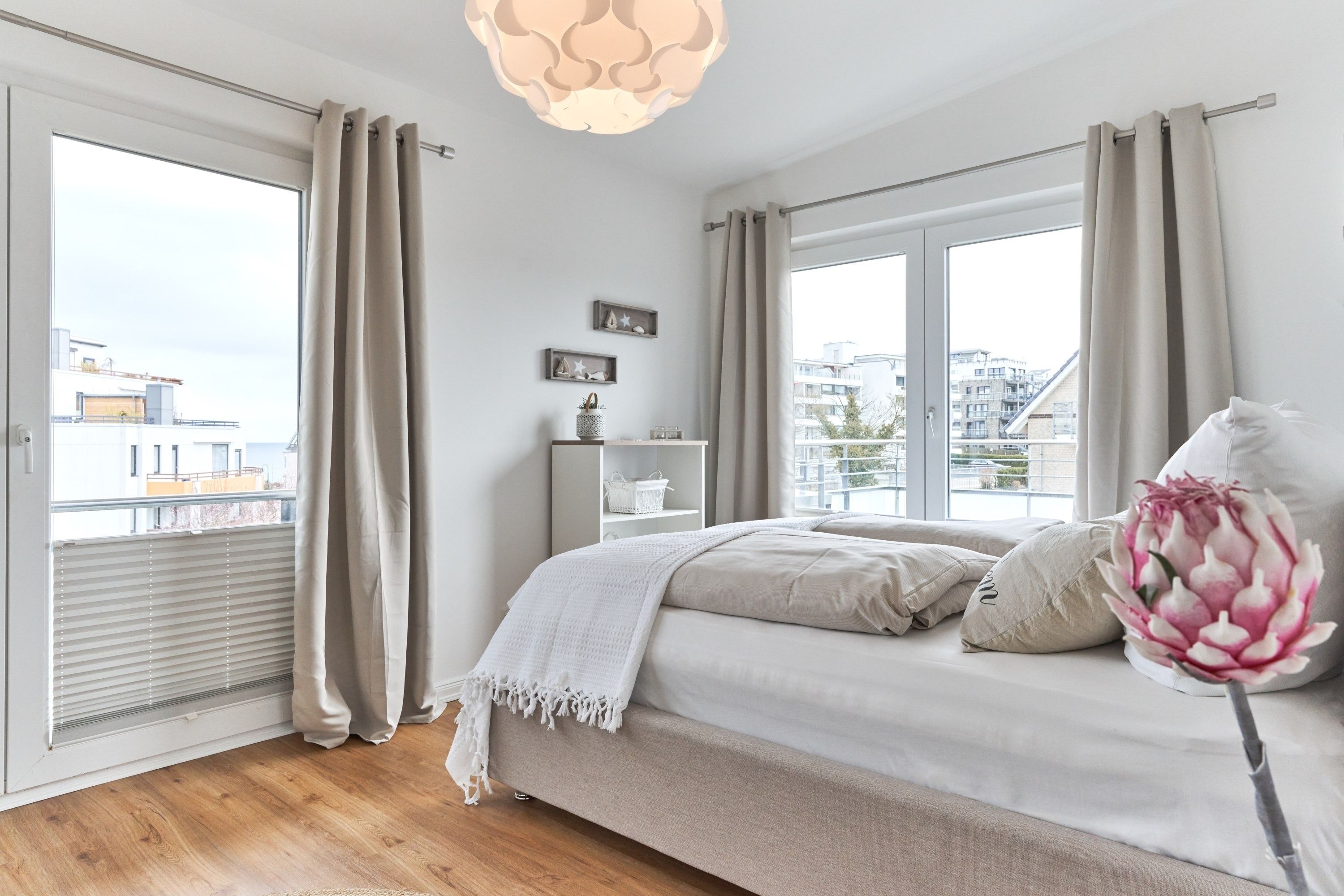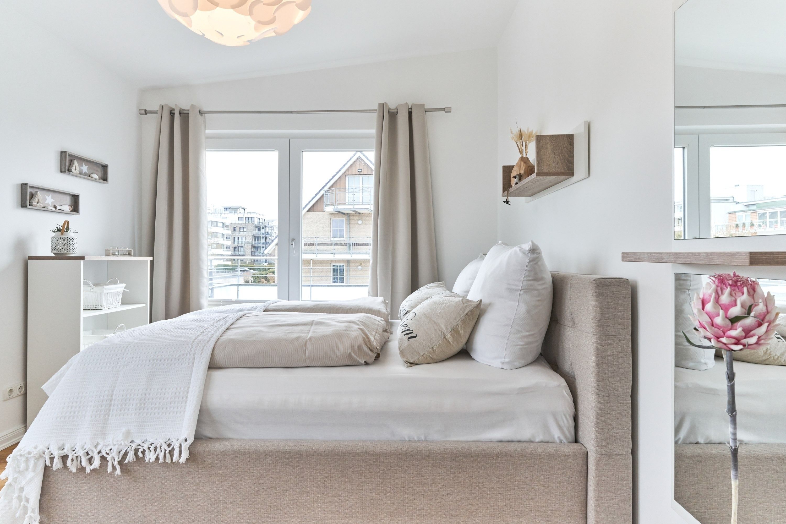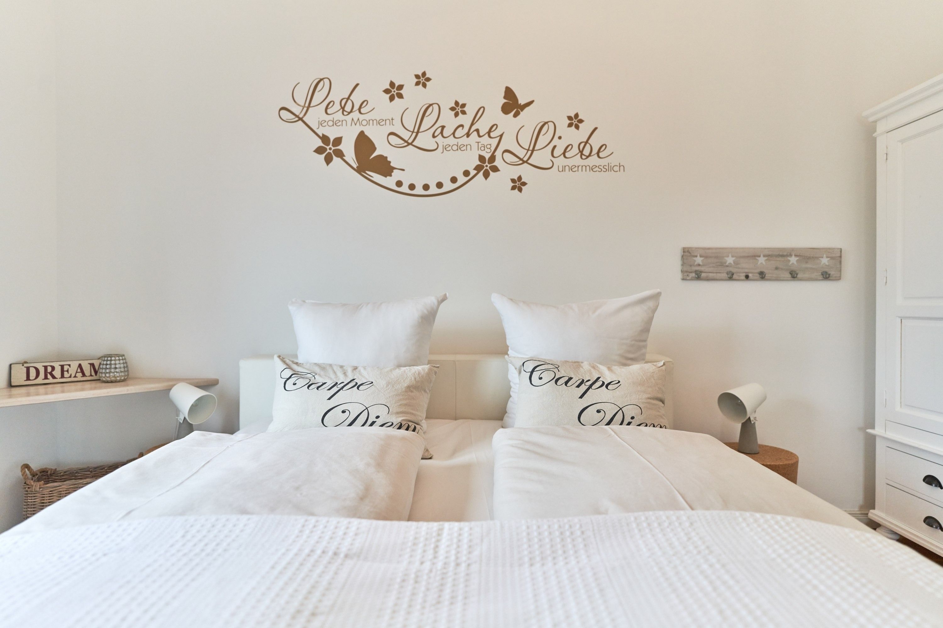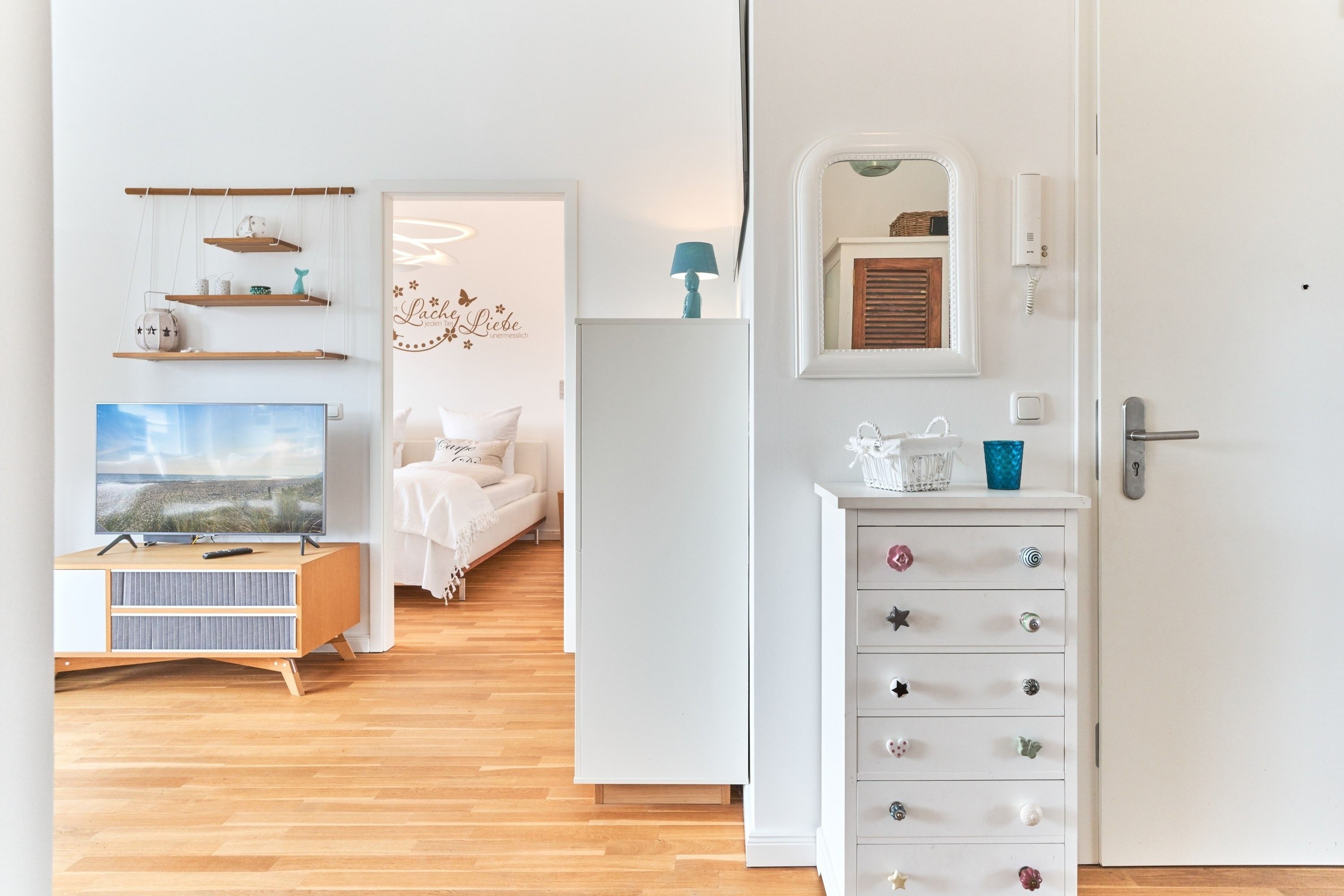 Das 1. Schlafzimmer ist mit einem Polsterbett (1,80 x 2,00m) ausgestattet und verfügt über einen Kleiderschrank, 2 Nachttische und einen TV. Im 2. Schlafzimmer stehen Ihnen ein Polsterdoppelbett (1,60 x 2,00m) und ein Kleiderschrank zur Verfügung. Sind Sie es gewohnt, im Dunkeln zu schlafen, kein Problem, die Fenster sind mit Verdunklungsvorhängen ausgestattet. Das Tageslicht-Duschbad in heller Optik mit bodengleicher Dusche und Handtuchheizkörper, Fön, Kosmetikspiegel, Waschmaschine. Die gesamte Wohnung ist mit einer Fußbodenheizung ausgestattet.