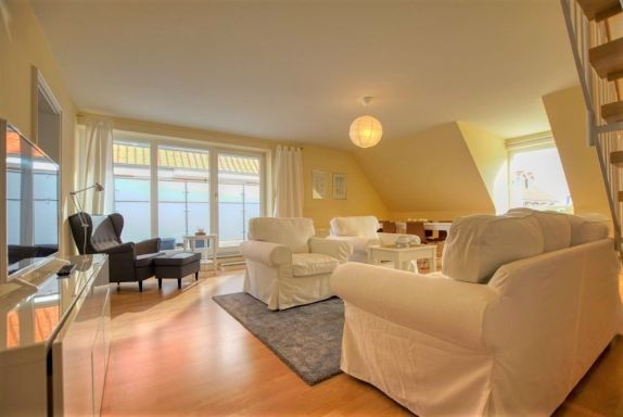Verbringen Sie Ihren Urlaub in dieser großzügigen Dachgeschosswohnung in der Friedrich-Ebert-Straße 16a in Heiligenhafen. Mit 129 m² bietet die Wohnung Platz für 6 bis 8 Personen und einen Ostseefernblick über Fehmarnsundbrücke, Graswarder und Naturschutzgebiet.