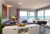 Bereits beim Betreten der Wohnung können Sie vom Flur aus auf die Ostsee schauen. Auch alle weiteren Räume bieten Ihnen einen herrlichen Blick auf die Ostsee. Der Eingangsbereich ist mit einer bequemen Garderobenbank und –panel sowie einem großen Schuhschrank ausgestattet. Der Wohnbereich ist großzügig eingerichtet und durch die bodentiefen Fenster mit Südausrichtung sehr hell. Ein Sicht- bzw. Lichtschutz ist ebenso vorhanden wie elektrische Rollläden. Von der sehr komfortablen Leder-Eckcouch  können Sie den herrlichen Meerblick genießen. Ein großer Tisch mit vier bequemen Schalenstühlen bietet ausreichend Platz. Ein drehbarer Flachbildschirm mit Heimkino-Anlage inklusive Blu-ray-Player lässt keine Wünsche offen. Per Smartphone direkt via Bluetooth verbinden und eigene Musik hören oder auch nur das Radio einschalten. Der Wohnbereich wird geschickt durch ein Sideboard von der Küche optisch getrennt. Die offene Designerküche mit weißer Mattlackoberfläche ist mit hochwertigen Elektrogeräten von Siemens ausgestattet: Induktionsherd, Backofen mit integrierter Mikrowelle, Geschirrspüler, Kühl-/Gefrierkombination, Wasserkocher, Toaster, Filter- und Kapsel-Kaffeemaschine.