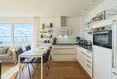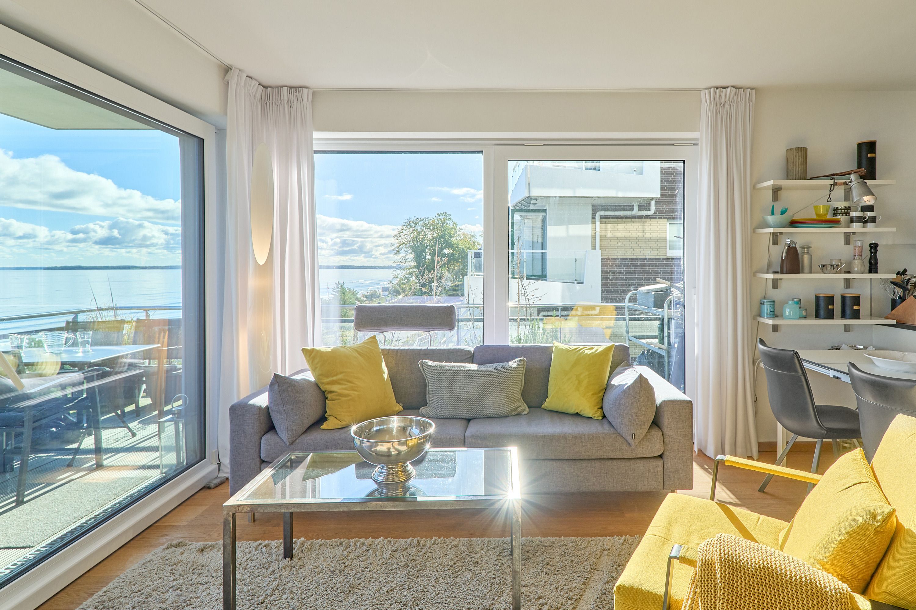 Bereits im Flur können Sie schon auf die Ostsee blicken und weiter … Aus allen Räumen haben Sie Ostseeblick! In dieser traumhaften Wohnung werden Sie sich gleich wohlfühlen. Das Sofa bietet Ihnen einen besonderen Sitzkomfort. Ihr Heimkinosystem bietet Ihnen Blu-ray, TV in 55 Zoll und ein 3-D-Soundsystem. Der Essbereich hat genügend Platz für vier Personen. Die anspruchsvolle Küche ist mit hochwertigen Elektrogeräten ausgestattet. Geschirrspülmaschine, Induktionsherd, Mikrowelle, Backofen, Wasserkocher, Kaffeemaschine, Pad-Kaffeemaschine und vieles mehr. Der halbumlaufende Balkon ist mit Loungemöbeln ausgestattet – träumen Sie schon?