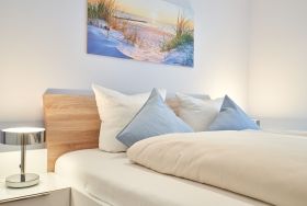 Die 2-Zimmer-Ferienwohnung ist mit bodentiefen Fenstern ausgestattet. An allen Fenstern befinden sich Licht- und Sichtschutz sowie Außenrollläden. Die hochwertige Nobilia-Einbauküche im Wohn-Essbereich ist komplett ausgestattet und lässt keine Wünsche offen; Küchenzeile mit erhöhtem Backofen, Ceran-Kochfeld, Mikrowelle, Geschirrspüler, Kühlschrank mit Gefrierfach, Filterkaffeemaschine mit Thermoskanne, Senseo-Kaffeemaschine, Senseo-Milchaufschäumer, Eierkocher, Mixer, Toaster und Wasserkocher. Der Wohnbereich ist mit einem hochwertigen Sofa, einem Wohnzimmertisch, einem schwenkbaren Smart-TV sowie einem Essbereich ausgestattet. Aus dem Wohnbereich gelangen Sie auf den herrlichen, überdachten Süd-Ost-Balkon. Hier stehen Ihnen Tisch und Stühle zur Verfügung. Das Schlafzimmer ist mit einer hochwertigen Nolte-Bettanlage, Bettengröße 1,80mx2,00m, einzelnen Schlaraffia-Matratzen in H2 und H3 ausgestattet. Kleiderschrank, 2 Nachttische sowie ein Wand-TV. Sind Sie es gewohnt, im Dunkeln zu schlafen? Kein Problem, denn es stehen Ihnen elektrische Außenrollläden zur Verfügung. Das Duschbad in heller Optik mit bodengleicher Dusche / Regendusche, mit separater Handbrause, Handtuchheizkörper, Fön, Kosmetikspiegel, Bad-WLAN-Radio. Die gesamte Wohnung ist mit einer Fußbodenheizung ausgestattet.