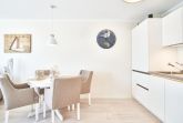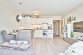 Das Duschbad ist in heller Optik gehalten. Der ansprechende Wohnbereich ist mit einer schönen Küchenzeile, einem Essbereich sowie einem gemütlichen Wohnbereich mit einer Sofaecke (Schlafsofa) ausgestattet. Neben einem Flachbildfernseher steht Ihnen selbstverständlich kostenloses WLAN zur Verfügung. Vom Wohnbereich aus gelangen Sie auf den Balkon. Von hier haben Sie einen schönen Ostseeblick. Die helle Küche lässt keine Wünsche offen. Der Esstisch bietet Ihnen ausreichend Platz für gesellige Stunden.