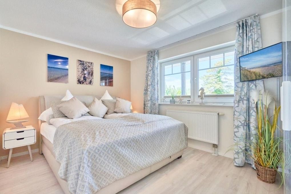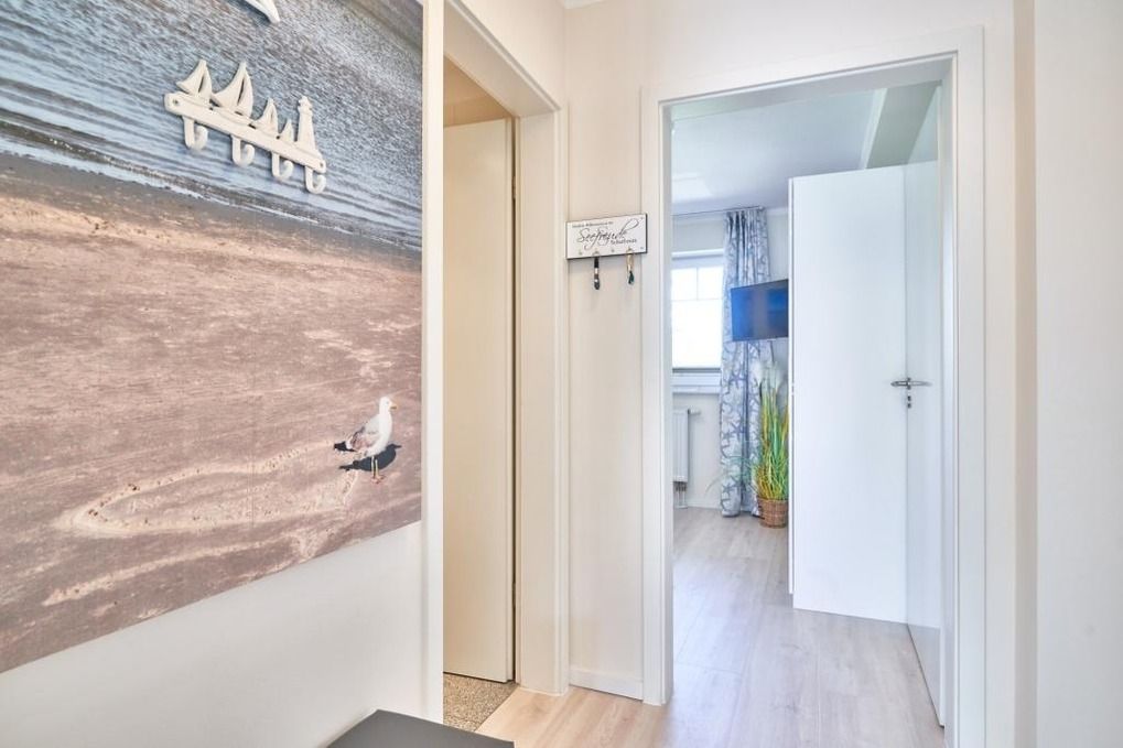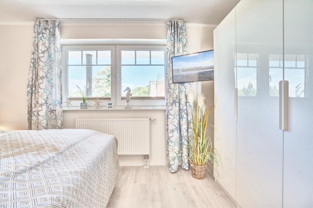 Der Eingangsbereich ist mit einer Garderobe ausgestattet. Das Schlafzimmer hat ein Boxspringbett (180 x 200m), zwei Nachttische sowie einen Kleiderschrank. Verdunkeln lässt sich das Schlafzimmer über ein Verdunklungsrollo sowie einen Verdunklungsvorhang.