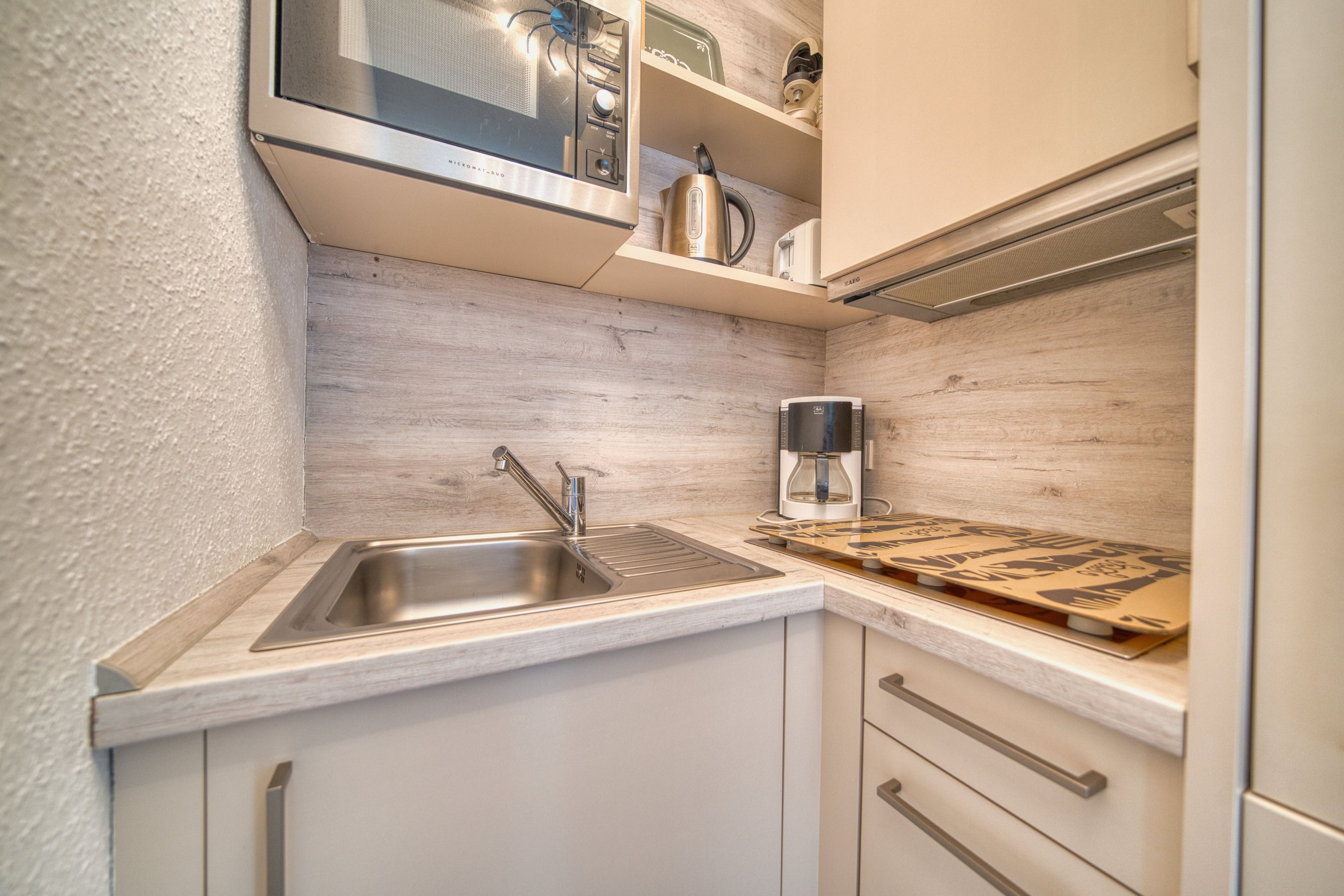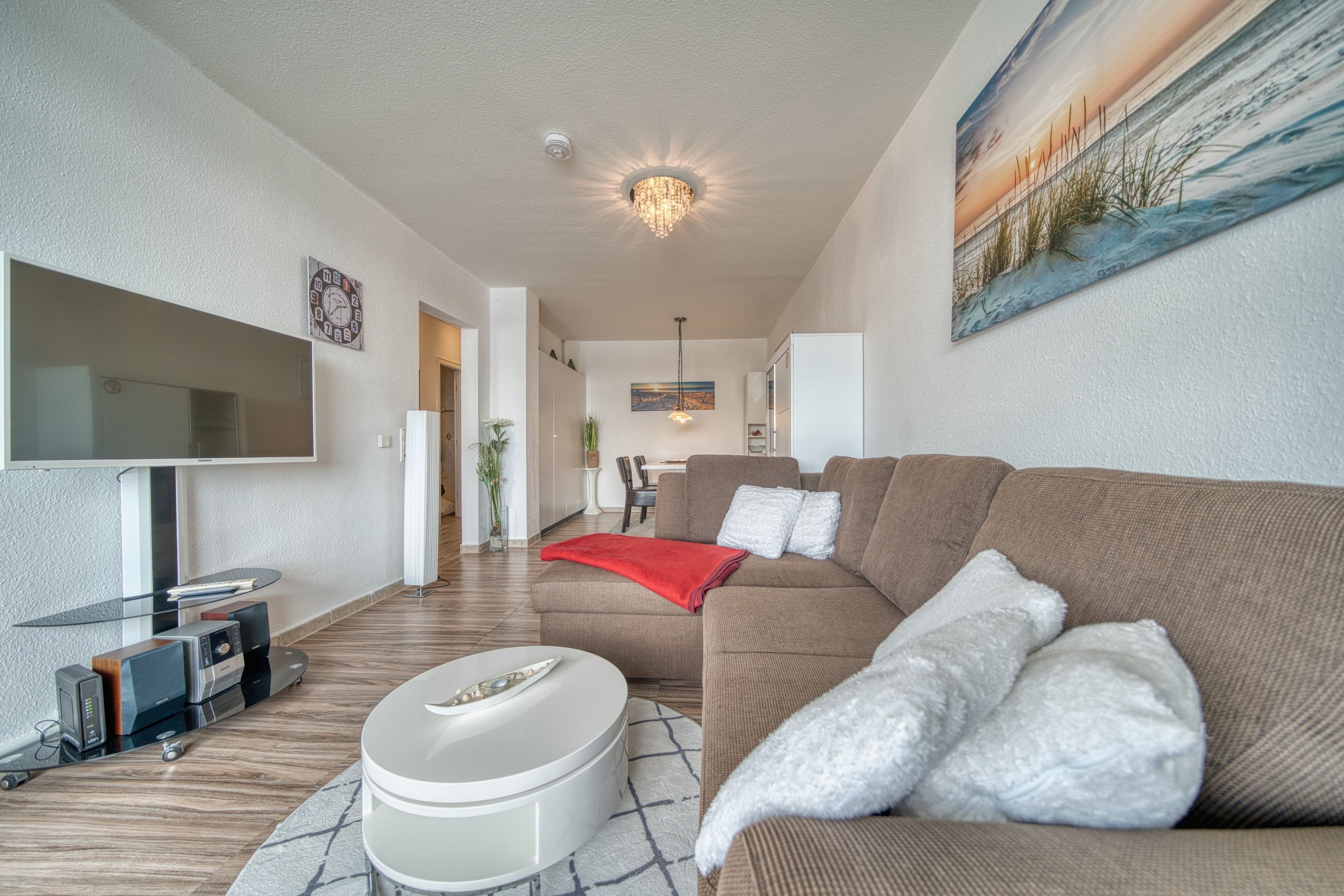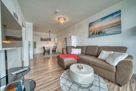 Ausstattung: Wohnbereich mit Schlafcouch, TV, DVD und WLAN, separates Schlafzimmer mit Doppelbett und TV, Küche mit Spülmaschine & Mikrowelle, modernes Bad mit Dusche, Südbalkon mit Markise.