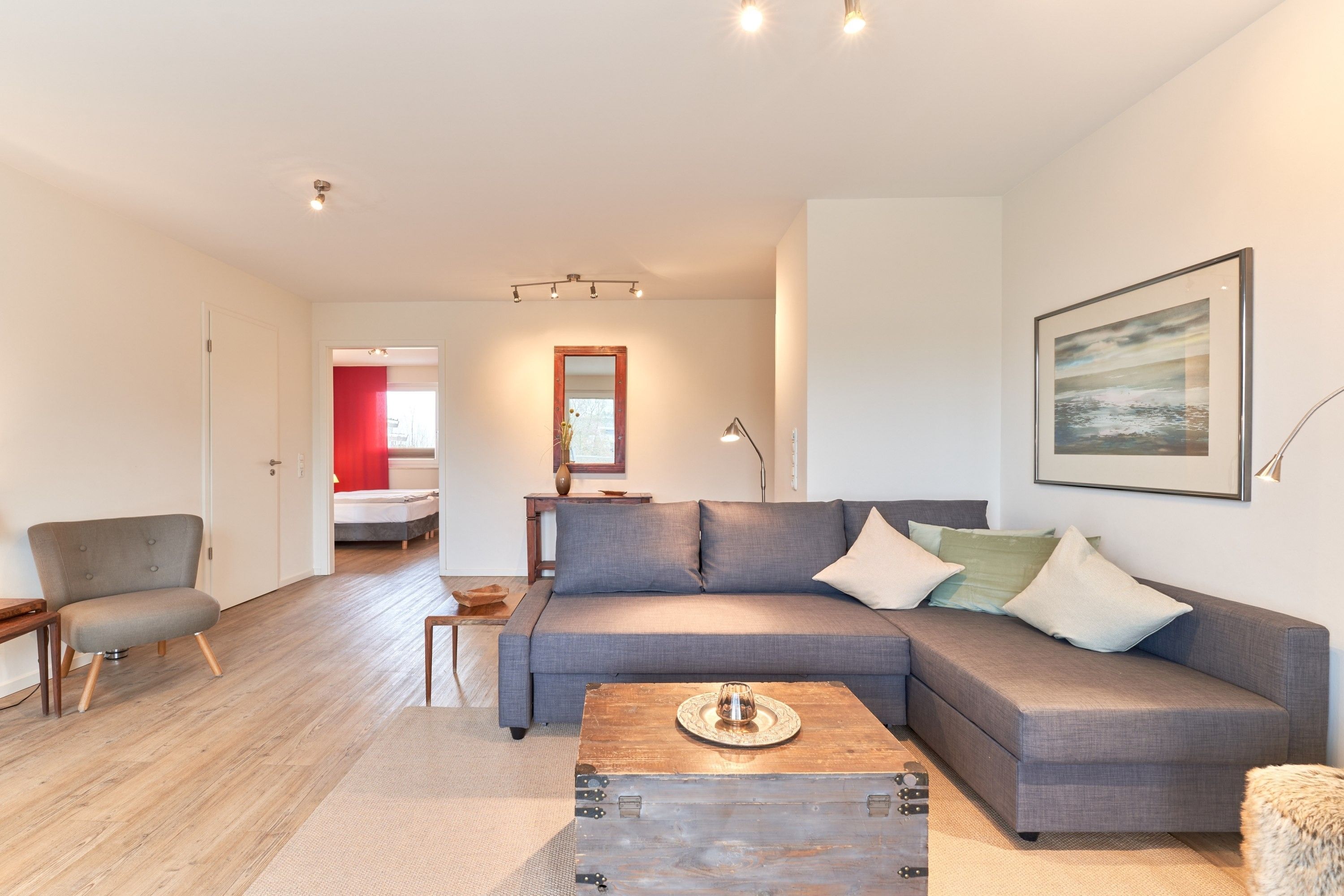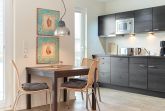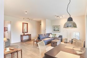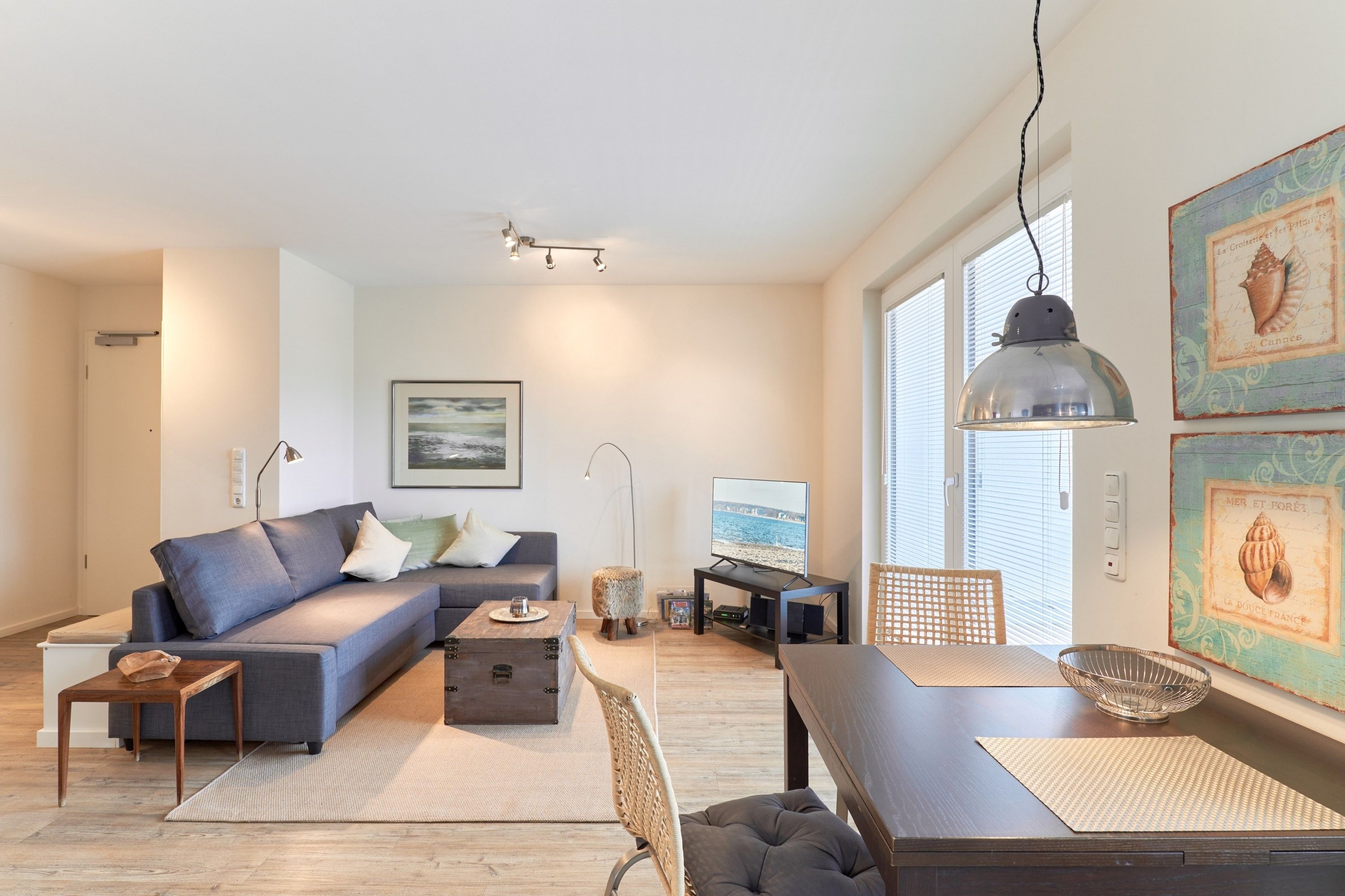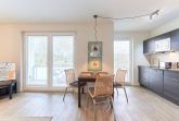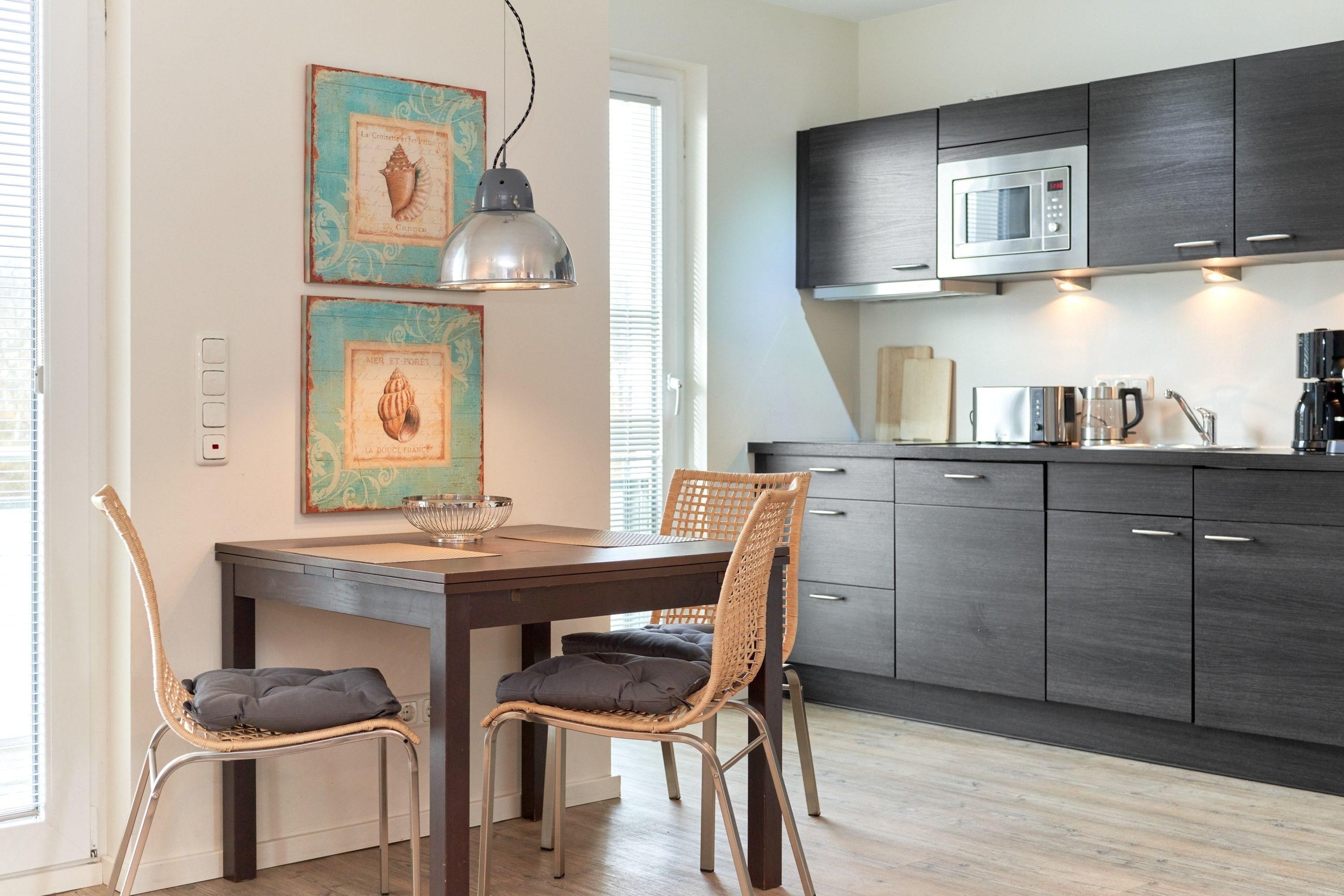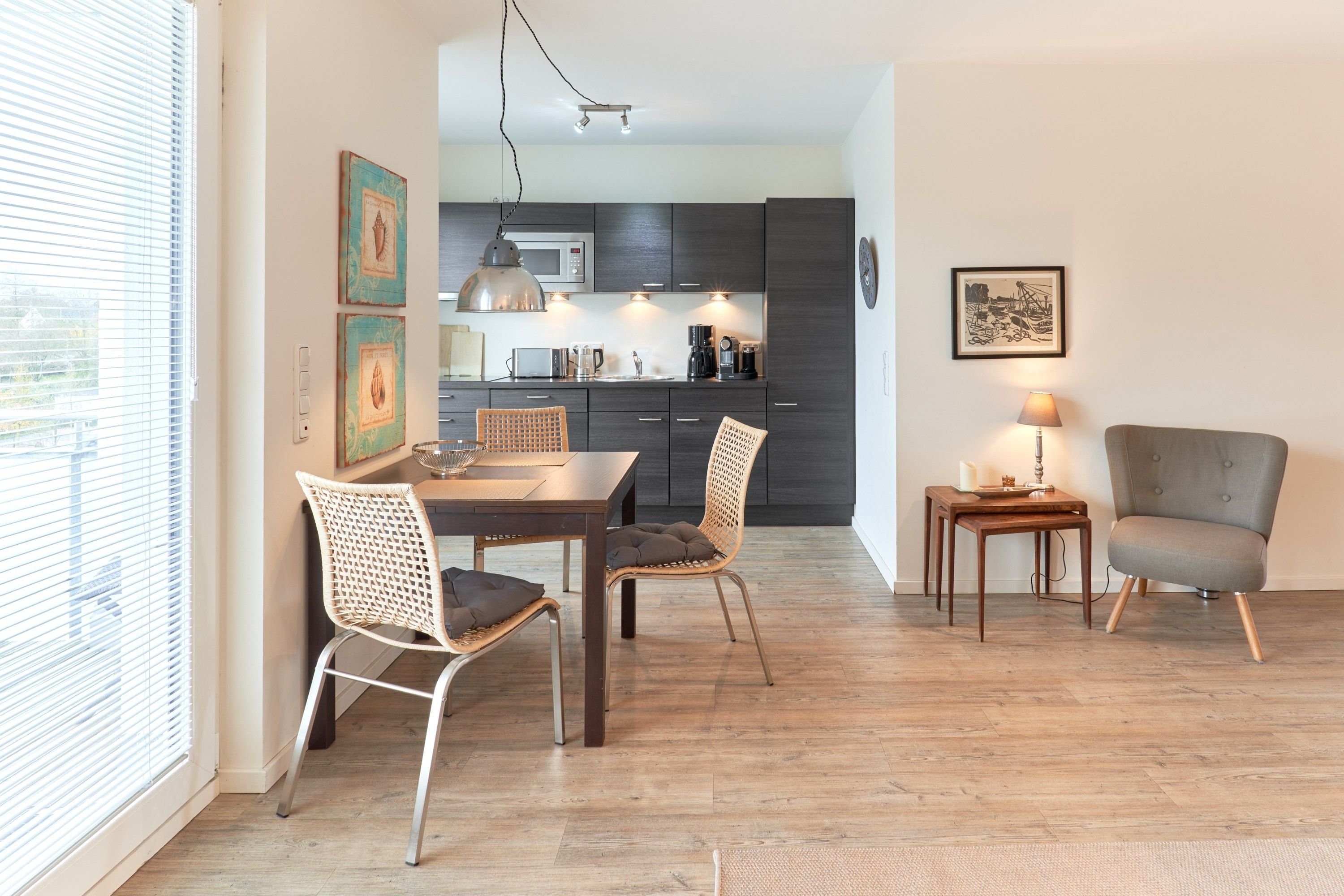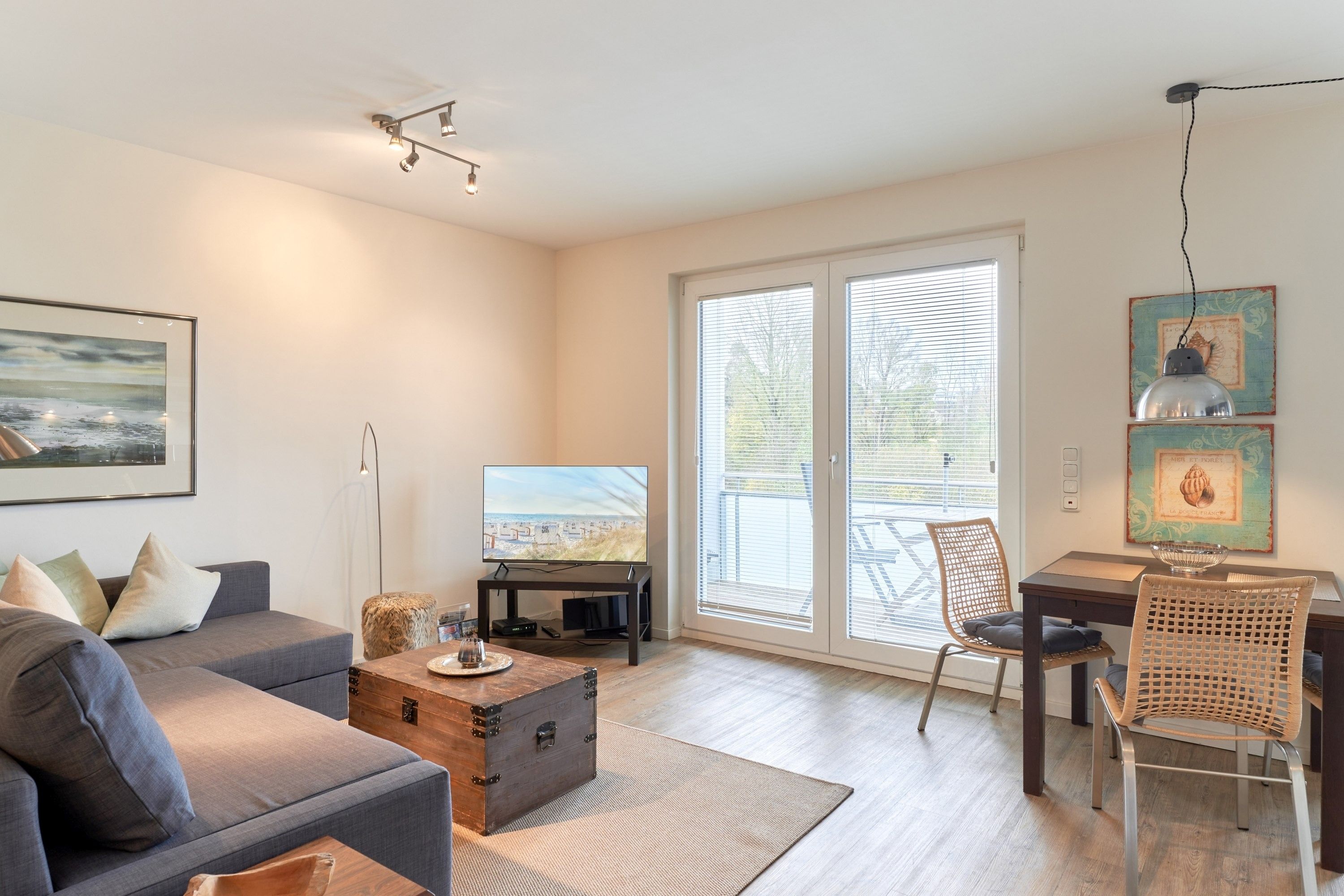 Diese Ferienwohnung bietet Ihnen einen gemütlichen Wohn-Essbereich mit offener Küche. Das gemütliche Sofa lässt sich mit nur wenigen Handgriffen zu einem Schlafsofa umfunktionieren. Neben dem Flachbildfernseher steht Ihnen ein CD-Player zur Verfügung. Kostenloses WLAN ist selbstverständlich. Der überdachte Balkon ist mit Tisch und Stühlen ausgestattet und lädt Sie auf einen Sundowner in der Nachmittag- und Abendsonne ein. Im Schlafzimmer stehen ein bequemes Doppelbett (1,80 x 2,00m) sowie ein geräumiger Schrank. Ein Flachbildfernseher sorgt für Unterhaltung und Verdunkelungsplissees ermöglichen einen erholsamen Schlaf. Das Badezimmer verfügt über eine bodentiefe Dusche und einen großen, beleuchteten Spiegel. Neben der Fußbodenheizung ist hier ein zusätzlicher Handtuchheizkörper angebracht.