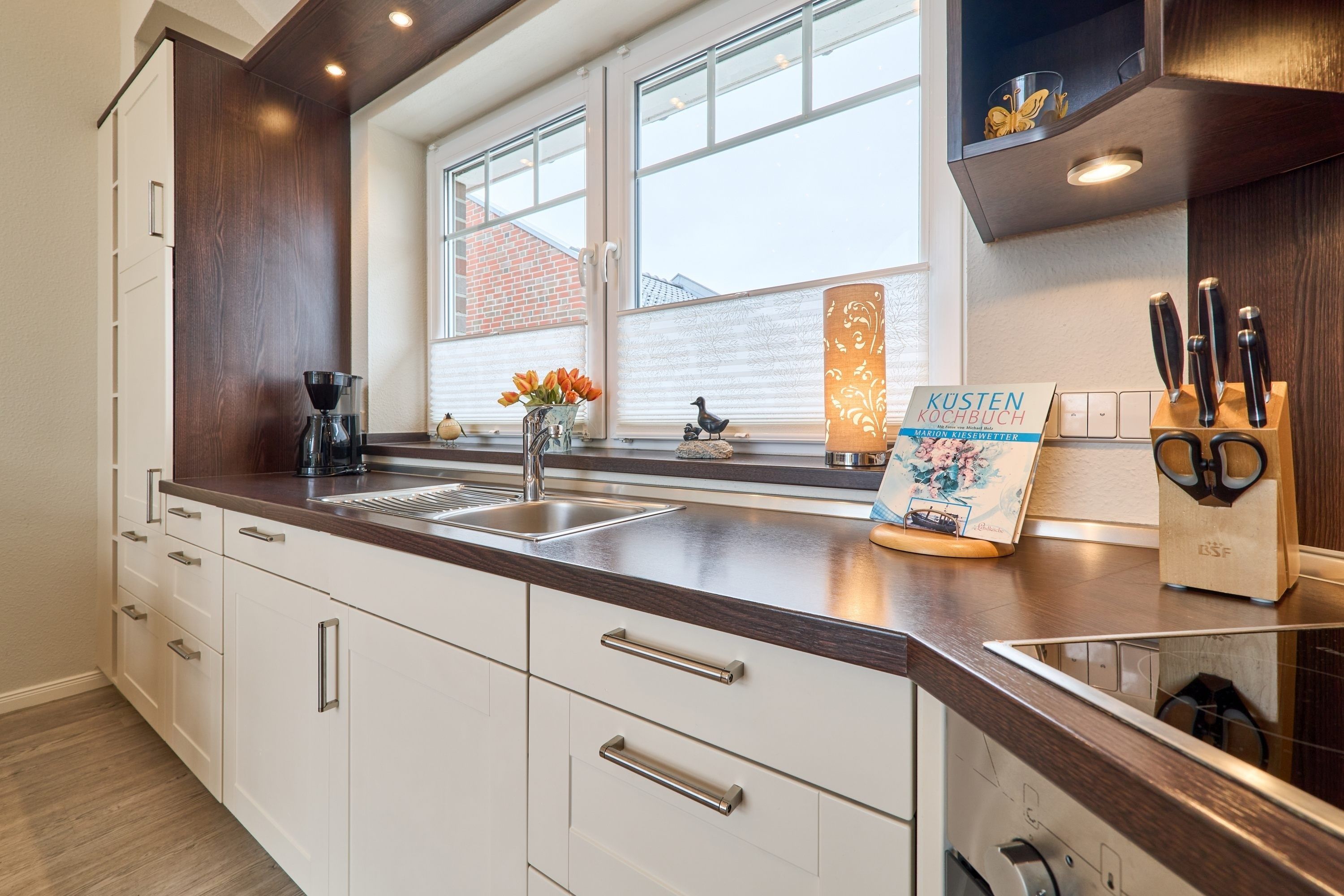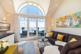 Der ansprechende Wohnbereich mit einem großen Panoramafenster ist mit einer gemütlichen Sofaecke ausgestattet. Neben einem TV-Flachbildfernseher und einer Sono-Anlage steht Ihnen selbstverständlich kostenloses WLAN zur Verfügung. Vom Wohnbereich aus gelangen Sie auf die Dachterrasse Richtung Ostsee. Diese ist mit einem Tisch, Stühlen und einer elektrischen Markise ausgestattet. Die helle Küche lässt keine Wünsche offen. Ein nettes Extra bieten die bereitgestellten Kochbücher mit vielen leckeren Rezepten zum Nachkochen. Der Esstisch bietet Ihnen ausreichend Platz für gesellige Stunden.
