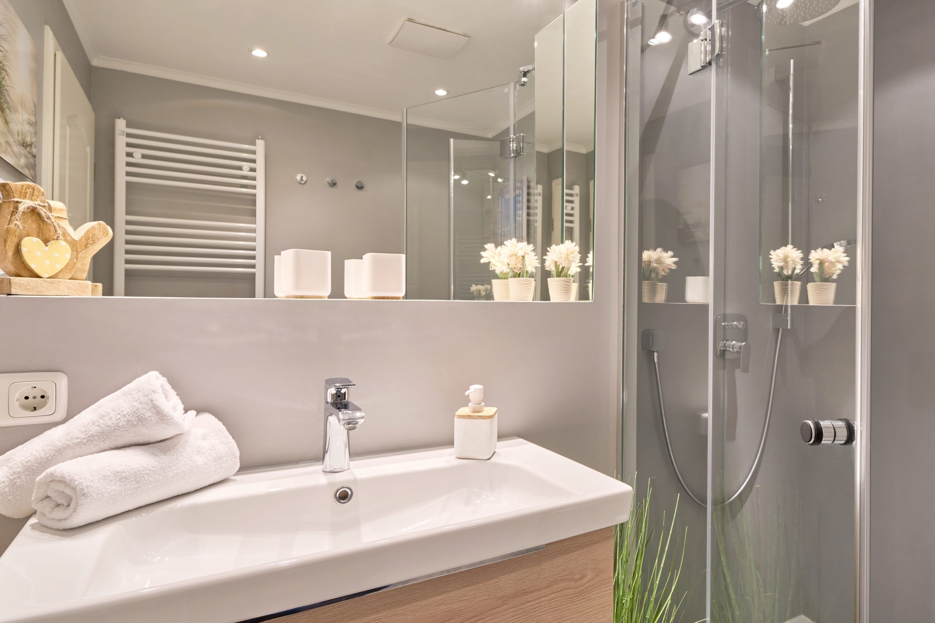 Aufwachen und von der Terrasse auf die Ostsee blicken – dies können Sie vom 1. Schlafzimmer aus. Hier steht ein bequemes Boxspringbett (1,80 x 2,00m) und ein geräumiger Kleiderschrank. Das 2. Schlafzimmer ist mit zwei Einzelbetten (0,90 x 2,00m) sowie einem TV ausgestattet. Das helle Bad verfügt über eine bodentiefe Dusche und einen Handtuchheizkörper.