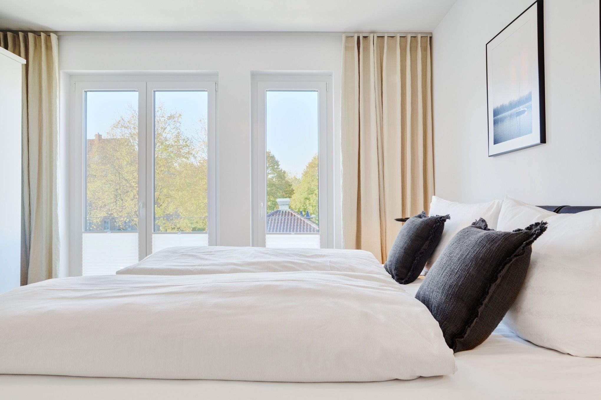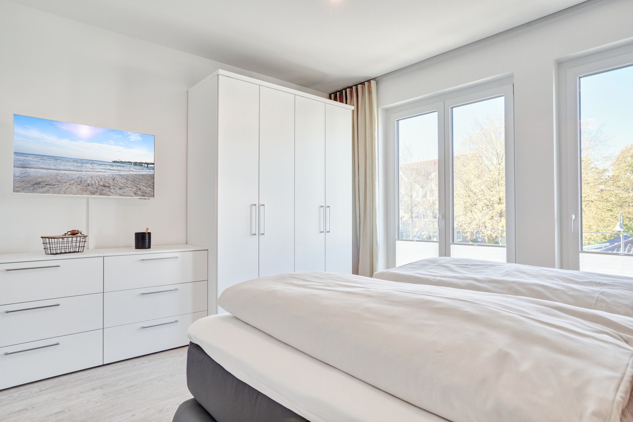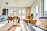 Die Ferienwohnung strahlt mit ihren bodentiefen Fenstern eine helle, behagliche Gemütlichkeit aus. Die Einbauküche im Wohn-Essbereich ist komplett ausgestattet und lässt keine Wünsche offen; Küchenzeile mit Backofen, Ceran-Kochfeld, Elektroherd, Geschirrspüler, Kühlschrank und Gefrierschrank, Filterkaffeemaschine, Krups-Kapsel-Maschine. Der Wohnbereich ist mit einem hochwertigen Sofa (kann mit wenigen leichten Handgriffen zu einem vollwertigen Bett umgebaut werden), einem Wohnzimmertisch, einem großen TV sowie einem Essbereich ausgestattet. Aus dem Wohnbereich gelangen Sie auf den herrlichen Sonnenbalkon nach Südwesten. Hier stehen Ihnen Tisch und Stühle sowie ein Relaxsessel zur Verfügung. Das Schlafzimmer ist mit einem Boxspringbett (180x200) ausgestattet und verfügt über einen Kleiderschrank, 2 Nachttische und einen TV. Sind Sie es gewohnt, im Dunkeln zu schlafen? Kein Problem, denn es stehen Ihnen elektrische Außenrollläden zur Verfügung. Das Duschbad in heller Optik mit bodengleicher Dusche und Handtuchheizkörper, Fön, Kosmetikspiegel. Großer, halb umlaufender Südwestbalkon mit Tisch und Stühlen sowie zwei Relax-Sesseln. Die gesamte Wohnung ist mit einer Fußbodenheizung sowie mit einem Sicht- bzw. Lichtschutz an allen Fenstern und zusätzlichen elektrischen Rollläden ausgestattet.
