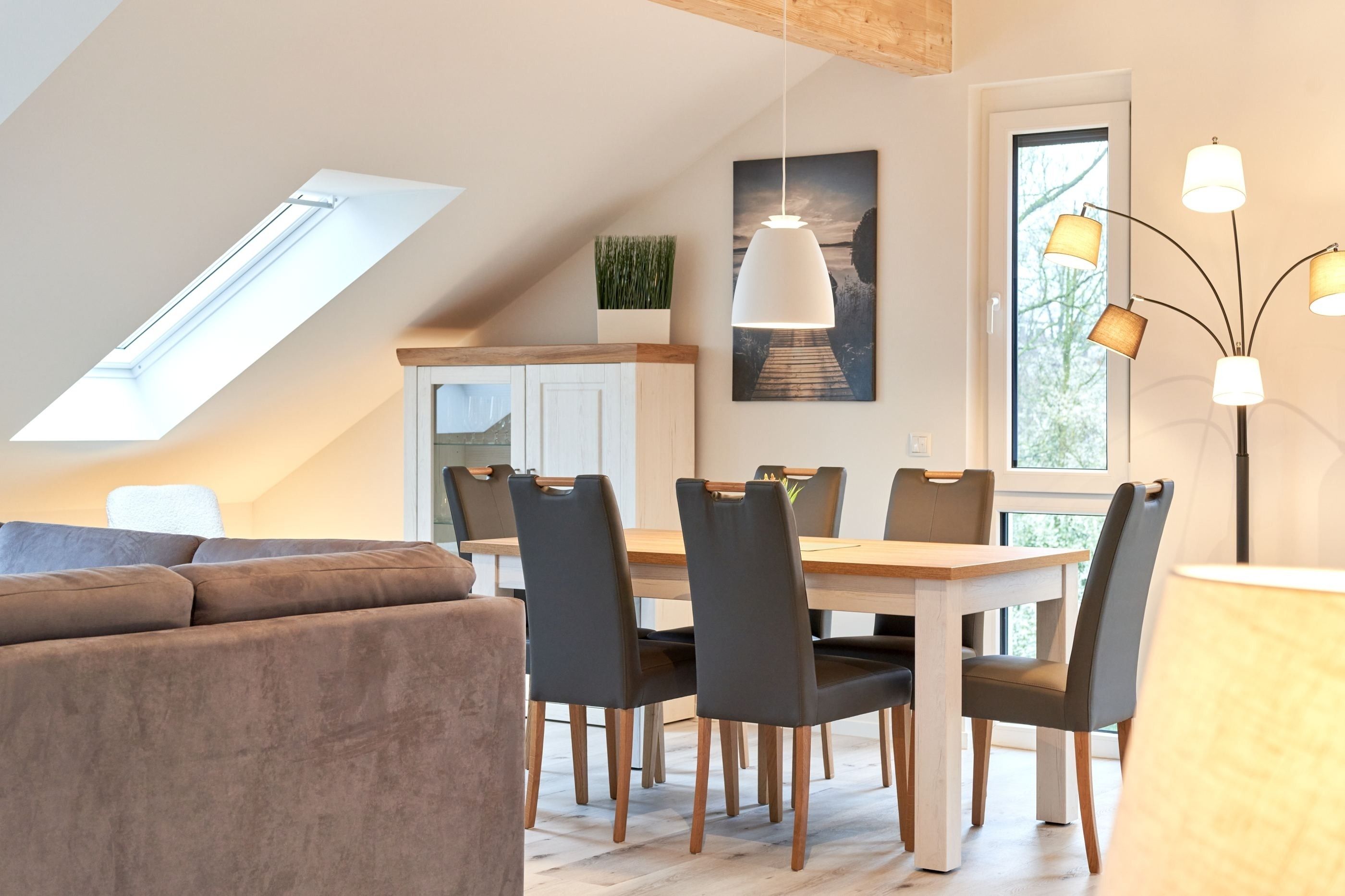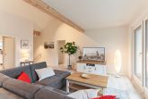 Helles, großes Wohnzimmer mit einer Einbauküche, einem Essbereich mit Tisch und 6 Stühlen. Der Wohnbereich ist mit einem gemütlichen Sofa und einem Smart-TV ausgestattet. Vom Wohnzimmer aus gelangen Sie in das erste Schlafzimmer mit einem Doppelbett mit verstellbarem Kopf- und Fußteil, 2 Nachttischen, Kleiderschrank und einem Smart-TV. Angrenzend das Duschbad mit separatem WC.