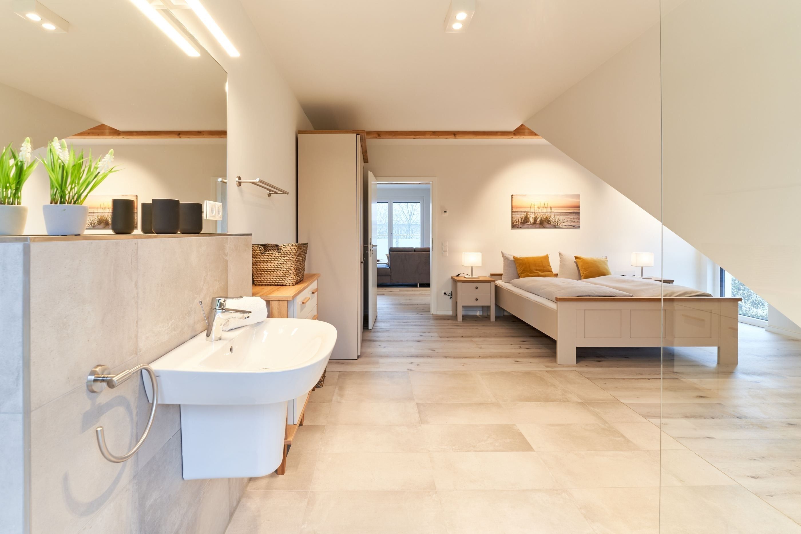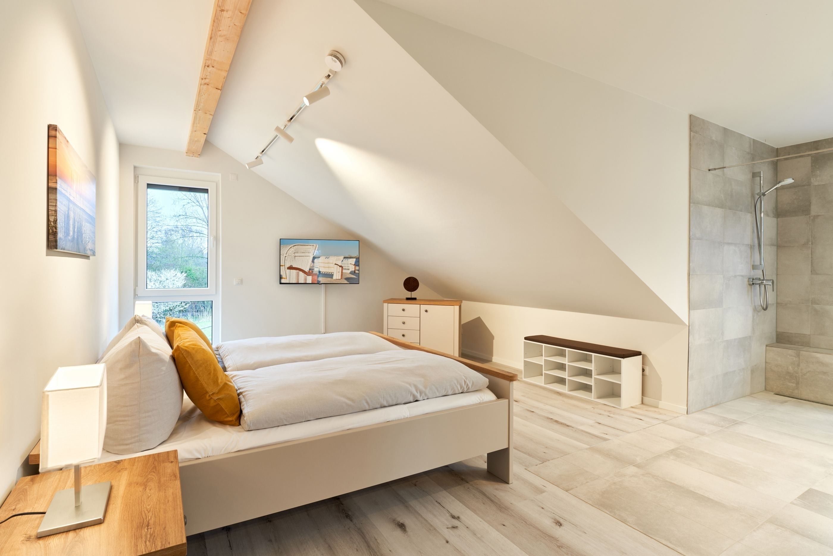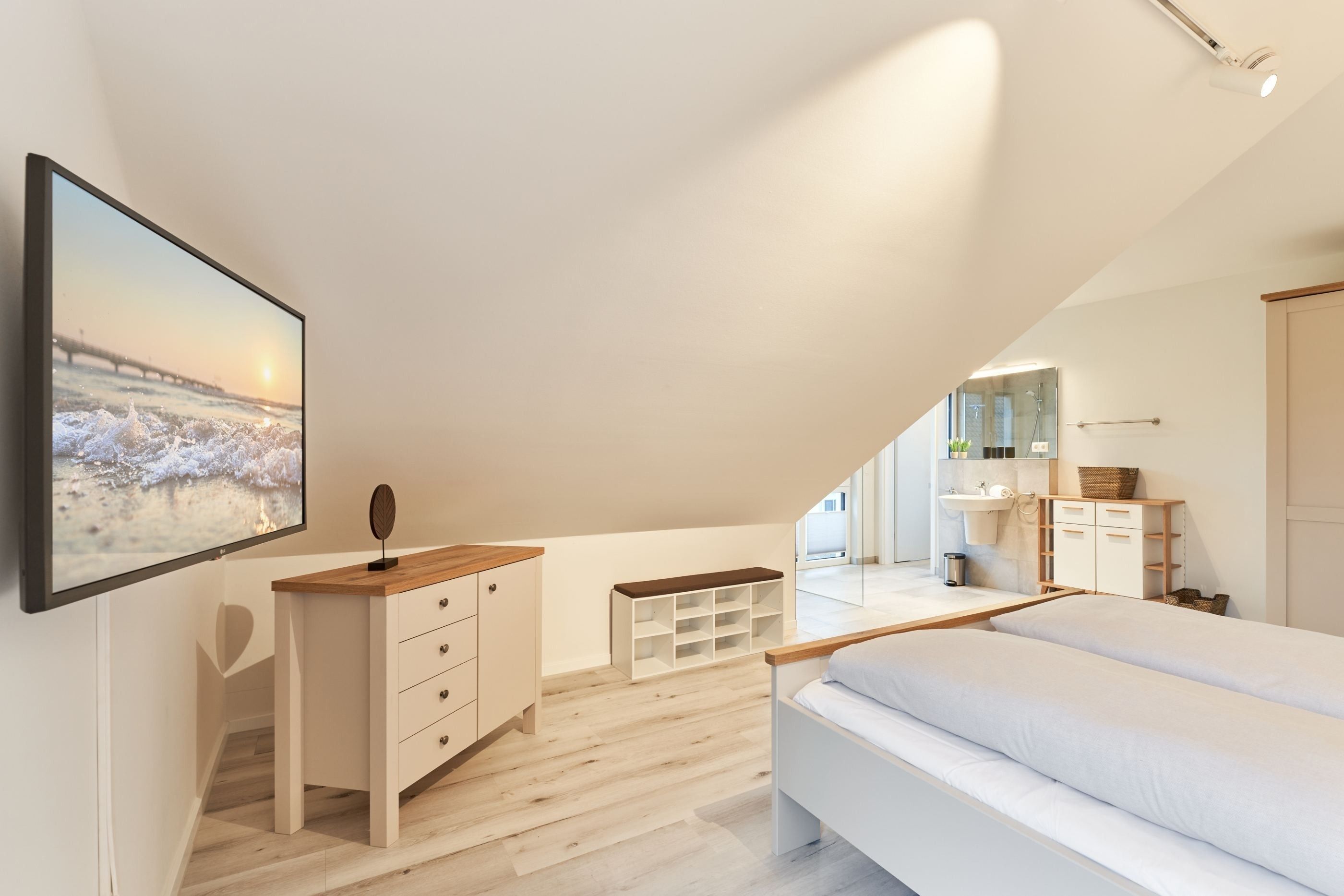 Das zweite Schlafzimmer hat ebenfalls ein Doppelbett mit Einzelmatratzen und verstellbarem Kopf- und Fußteil. Ein Smart-TV ist auch hier vorhanden. Das zweite Tageslichtbad ist mit einer bodengleichen Dusche ausgestattet.