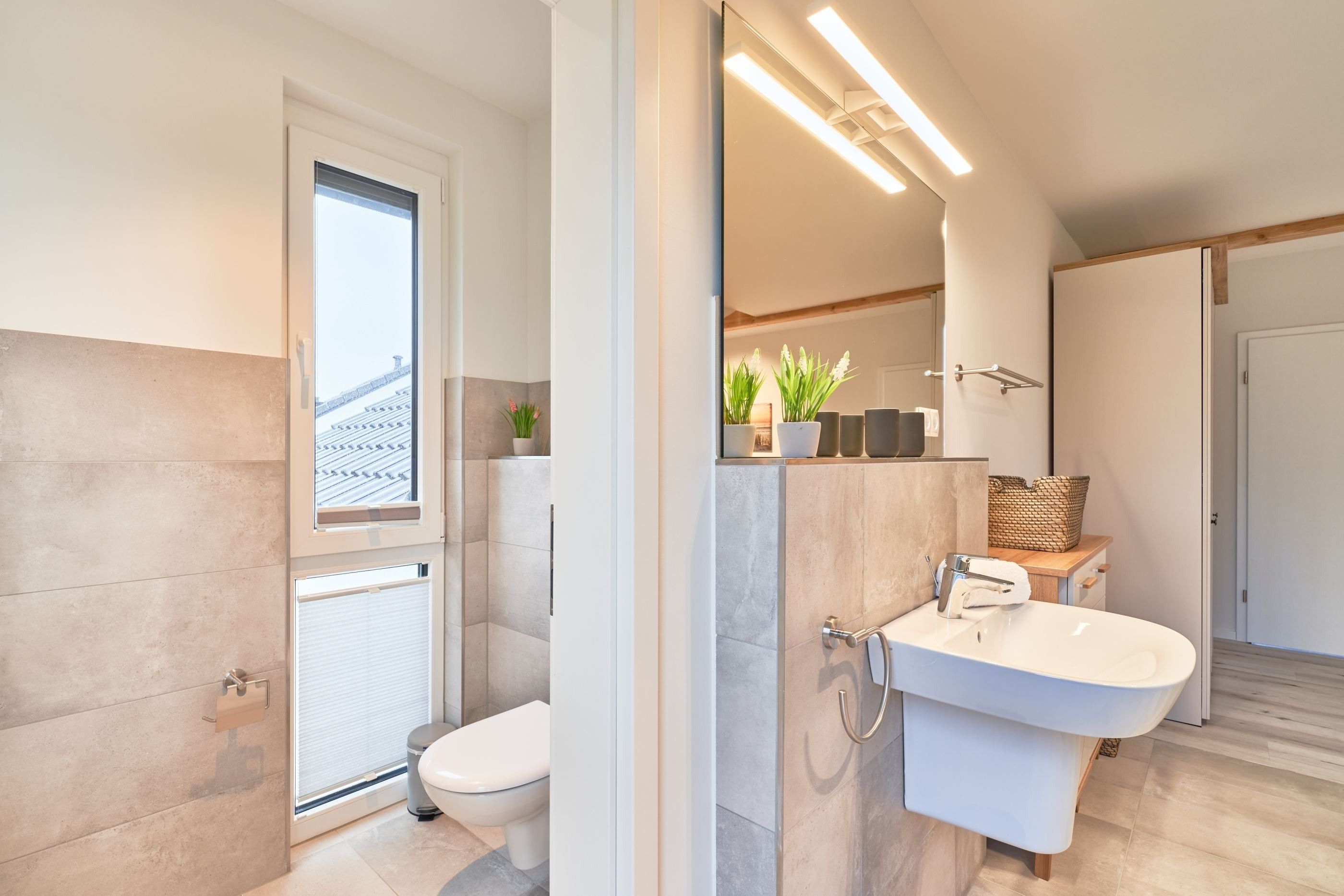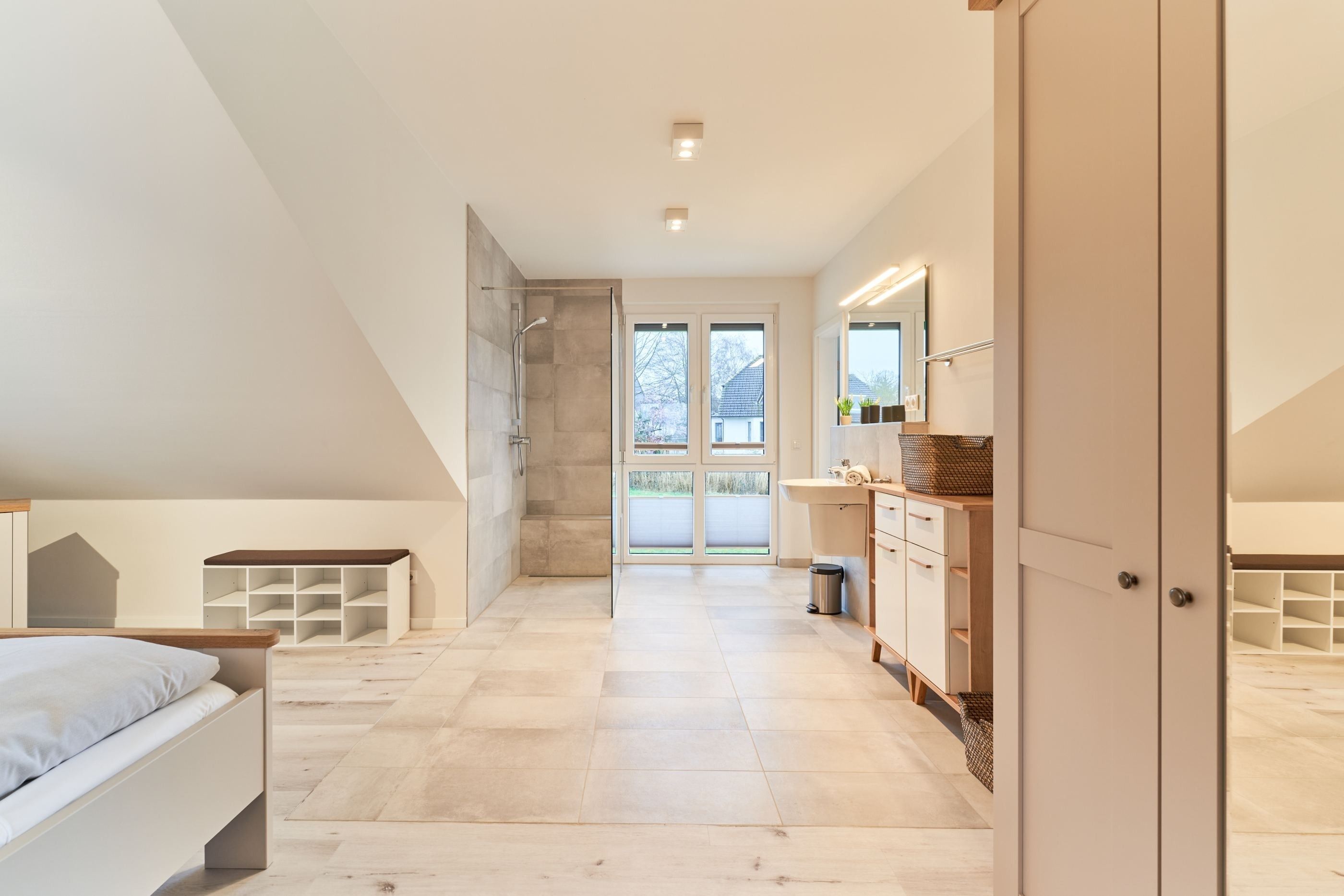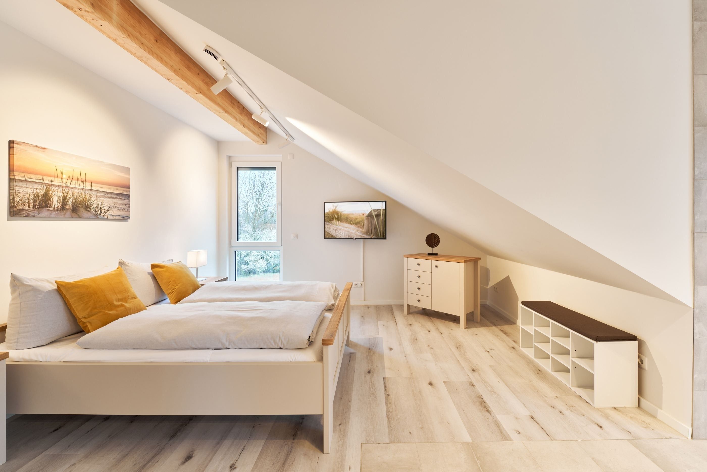 Das zweite Schlafzimmer hat ebenfalls ein Doppelbett mit Einzelmatratzen und verstellbarem Kopf- und Fußteil. Ein Smart-TV ist auch hier vorhanden. Das zweite Tageslichtbad ist mit einer bodengleichen Dusche ausgestattet.