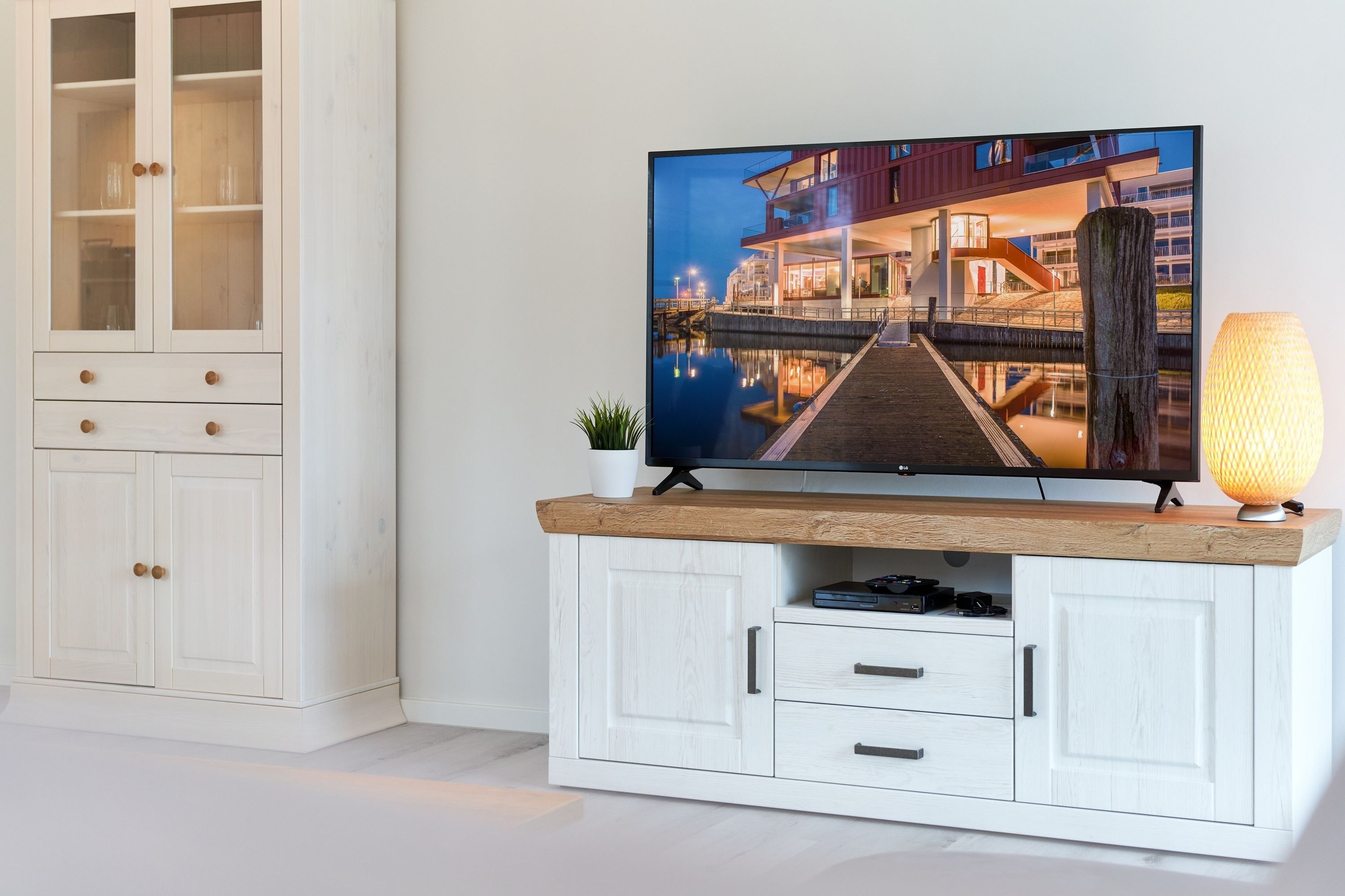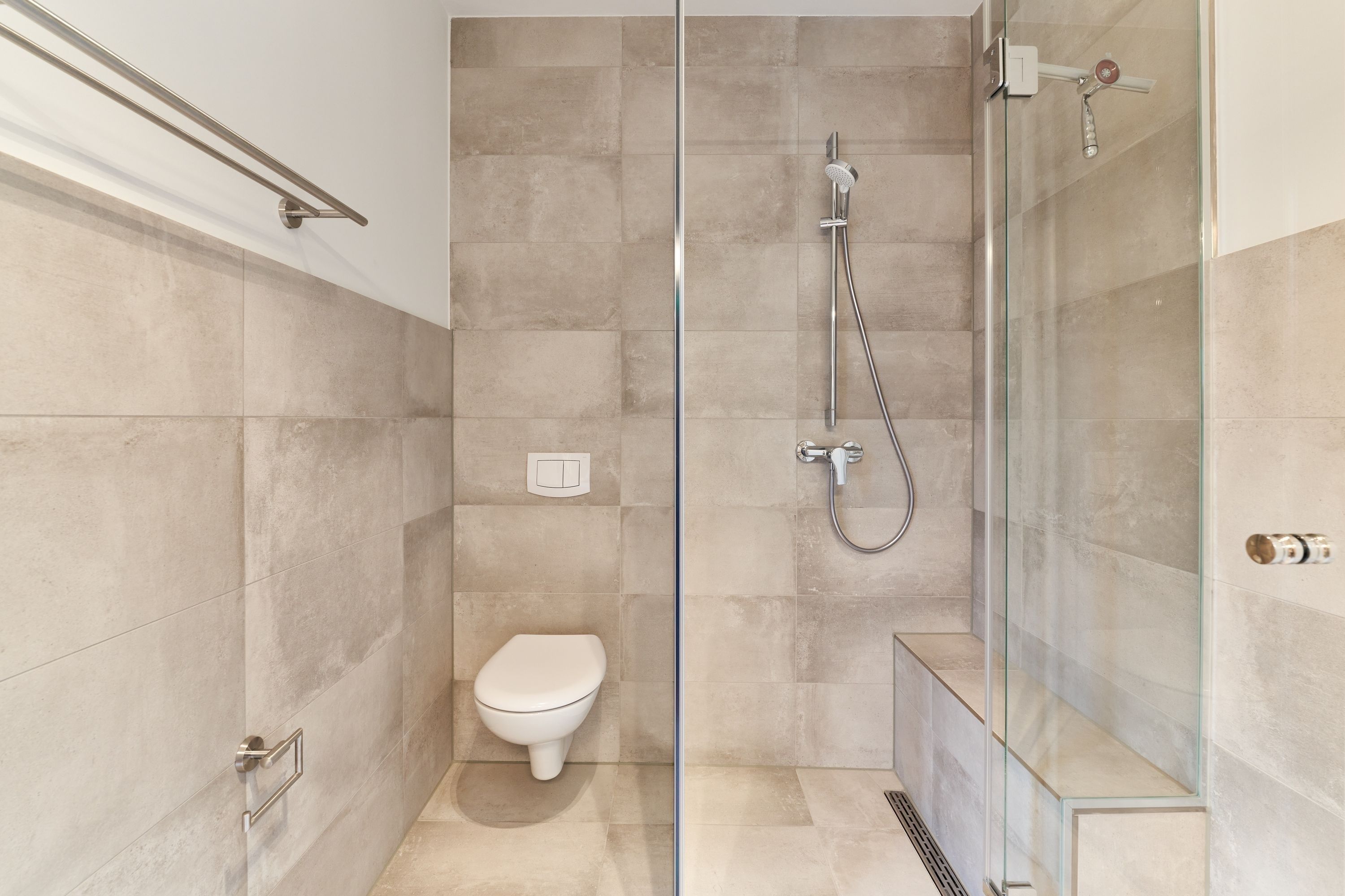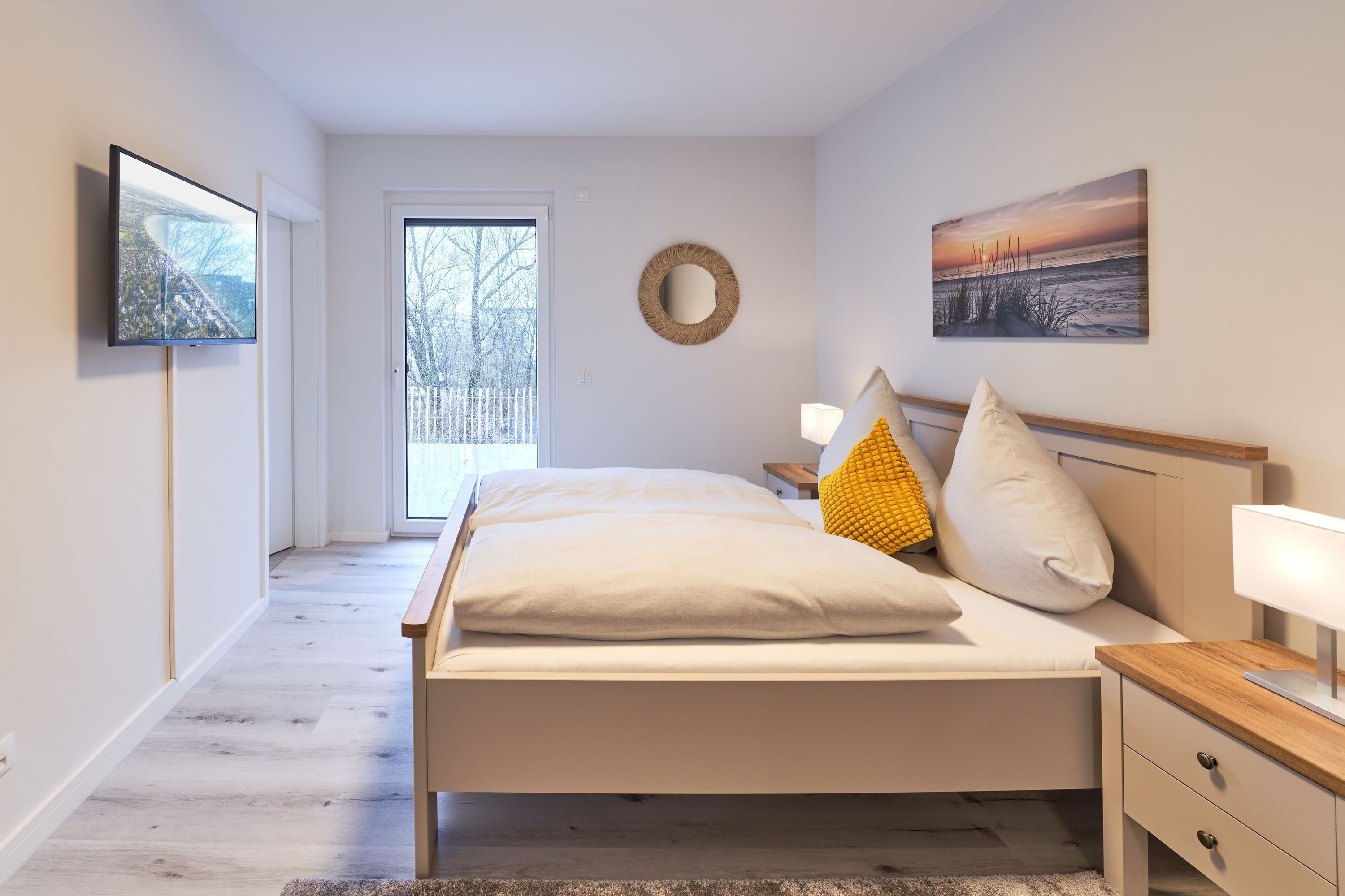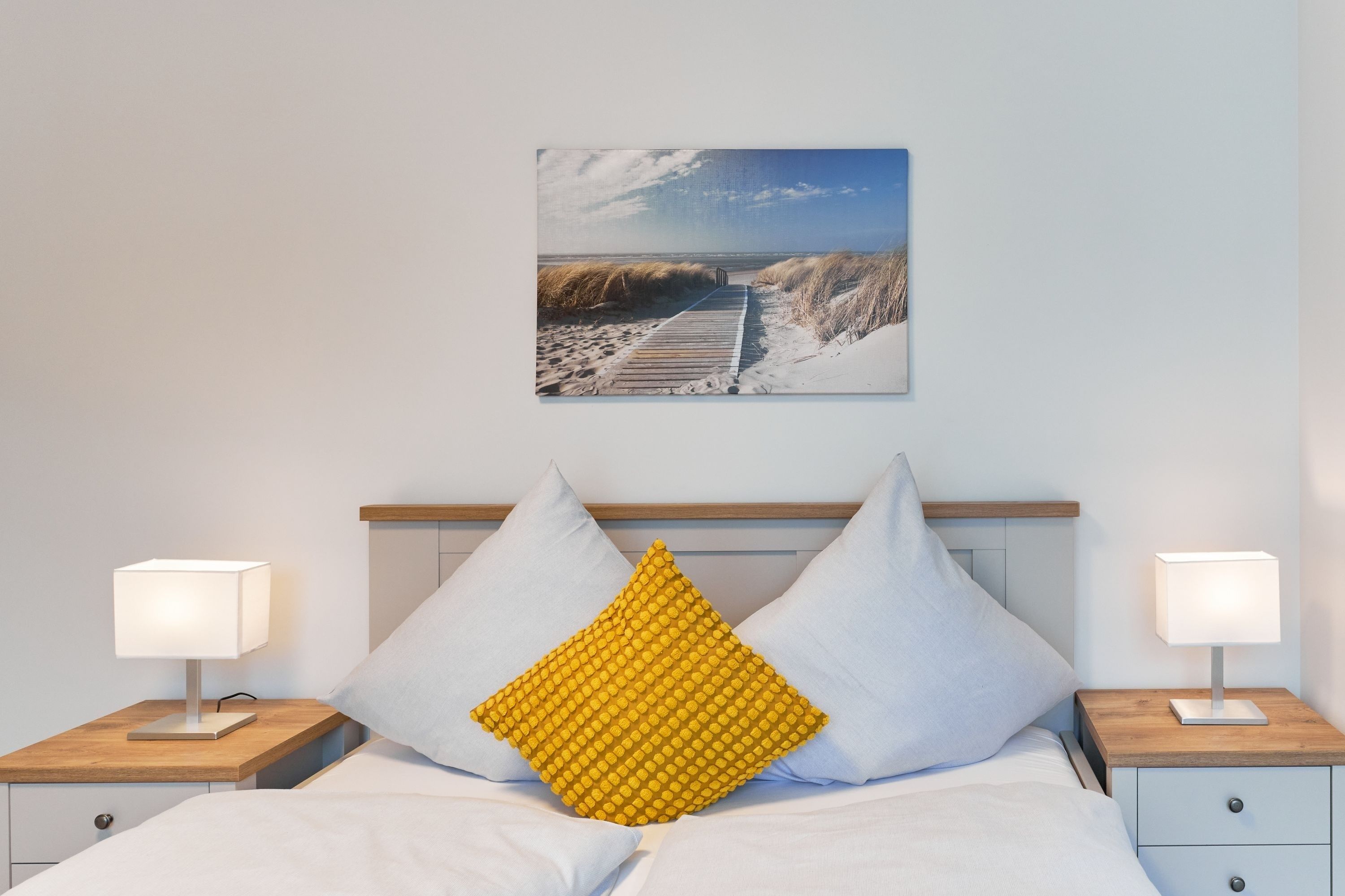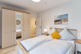 Im 1. Schlafzimmer stehen Ihnen 1 Doppelbett (Einzelmatratzen) mit verstellbarem Kopf- und Fußteil, zwei Nachttische, ein Kleiderschrank sowie ein Wand-TV zur Verfügung. Das Tageslicht-Duschbad en suite ist mit einer bodengleichen Dusche ausgestattet.