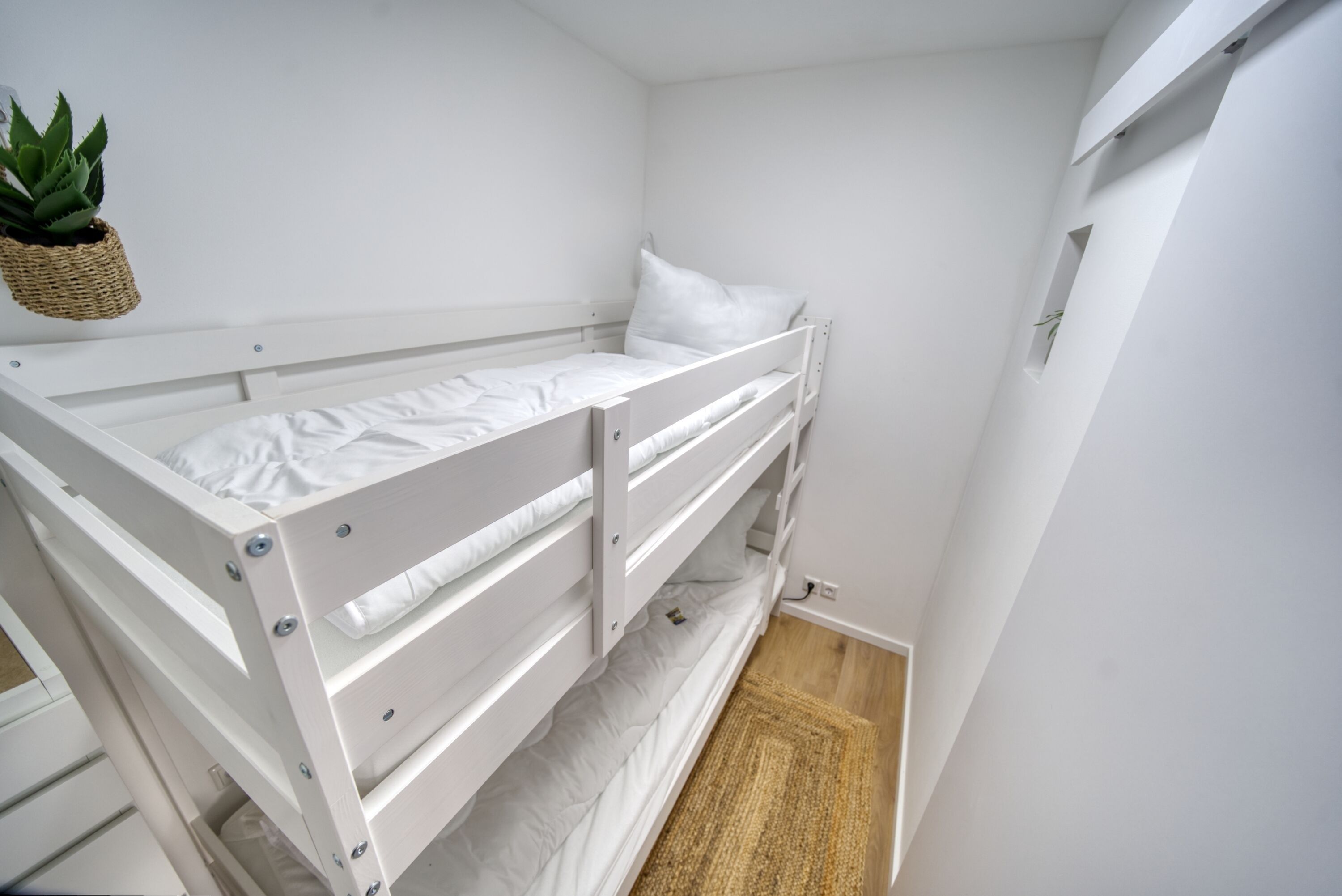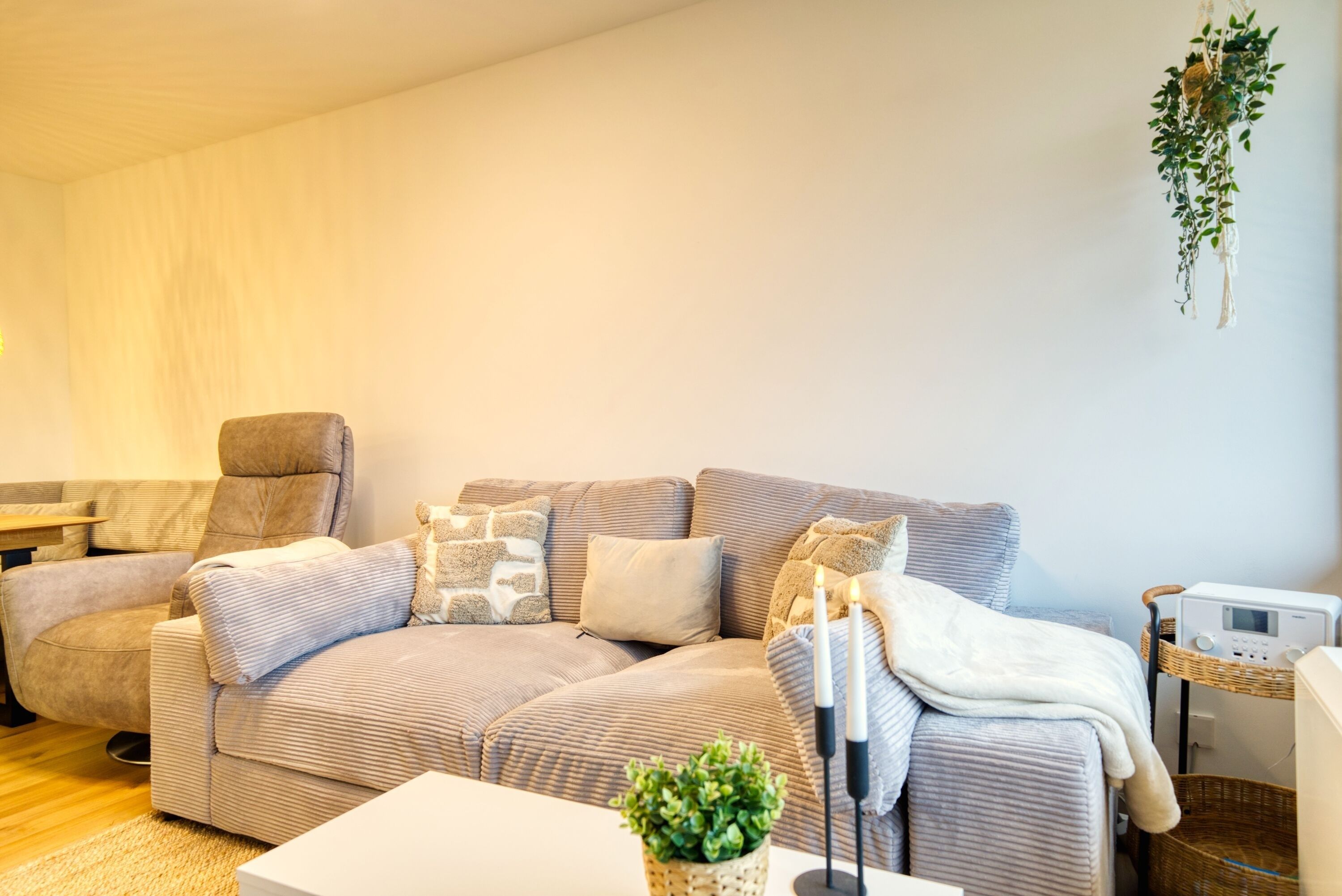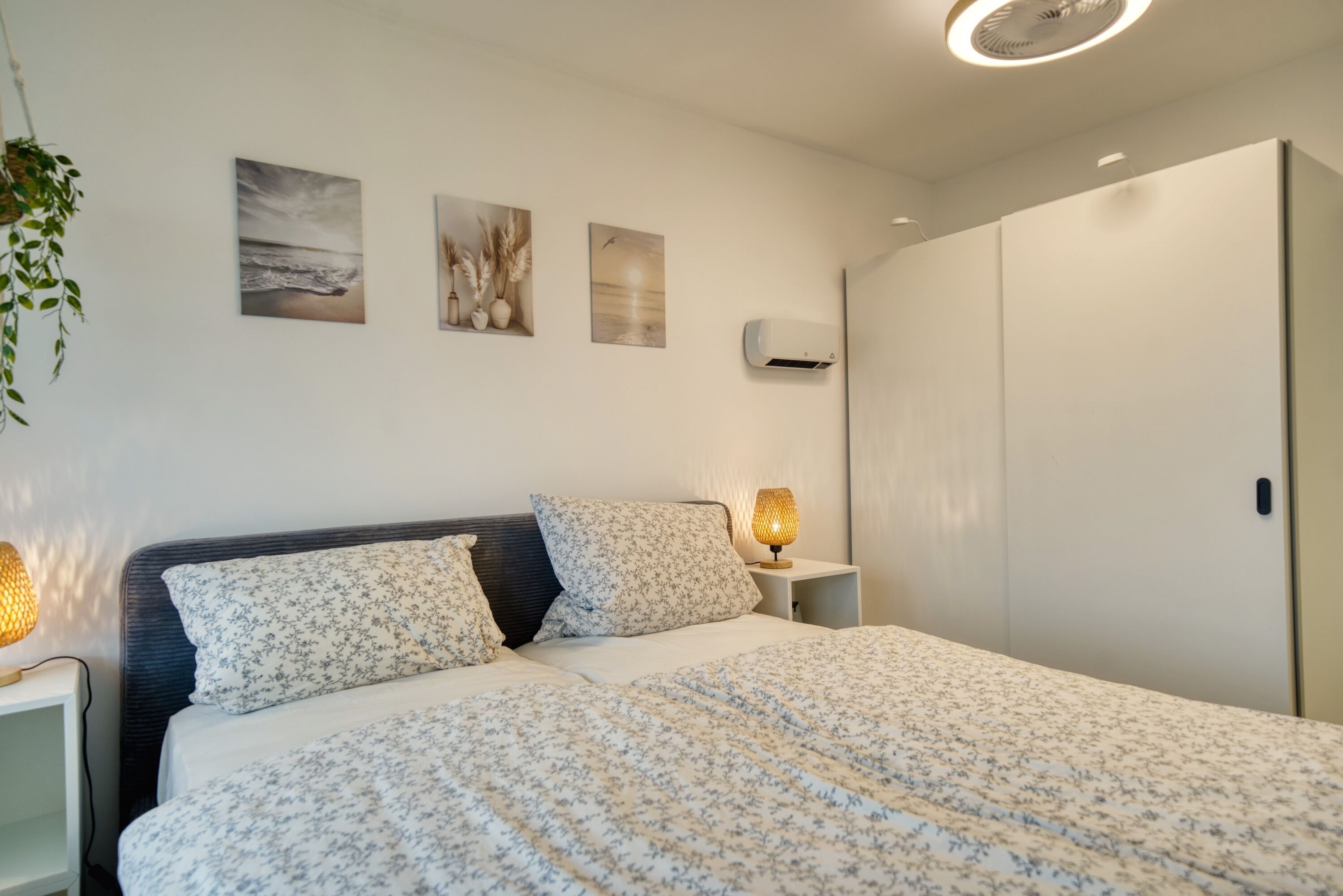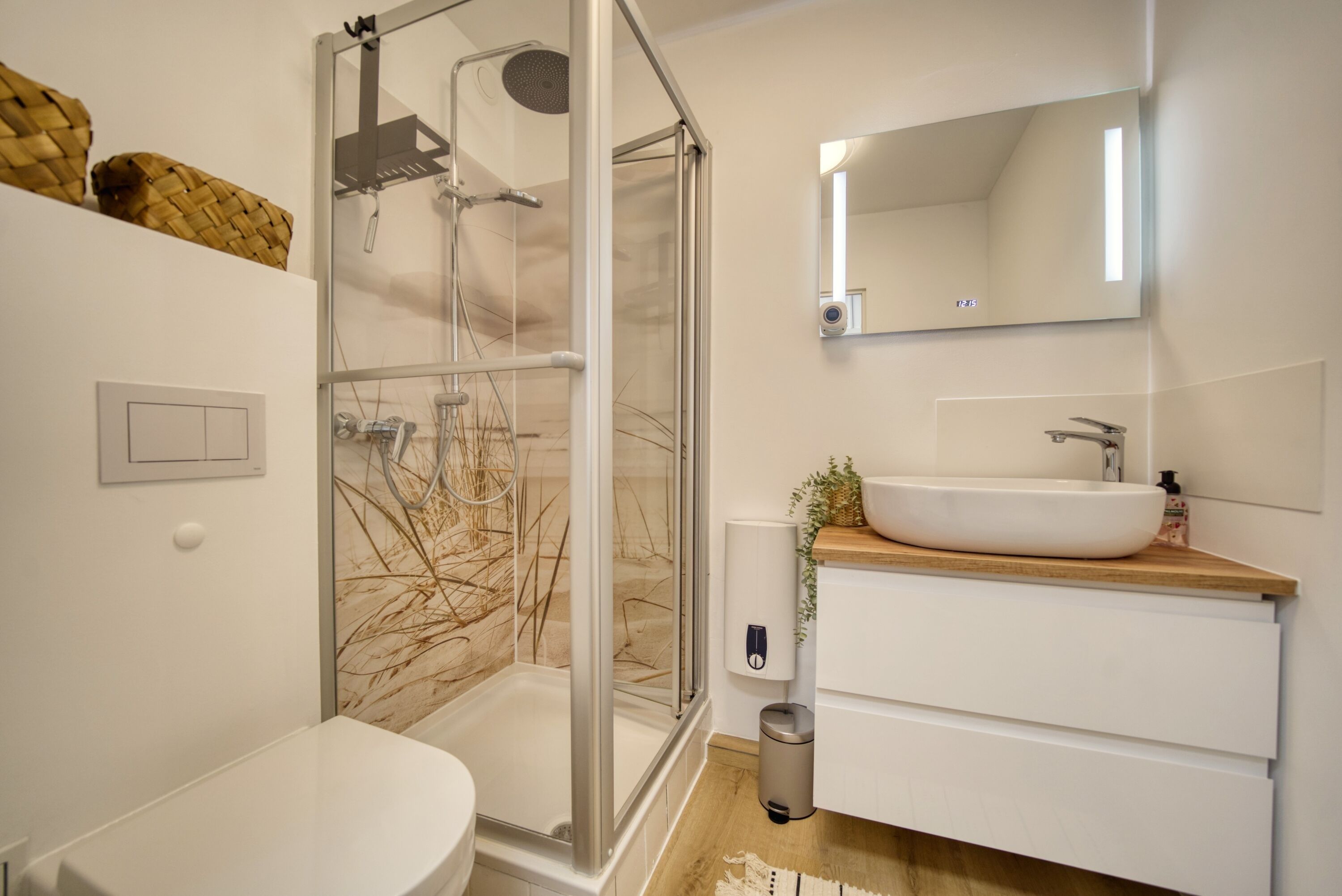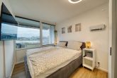 Etage, Wohn-/Schlafbereich mit Sofa und TV, Schlafzimmer mit Doppelbett, separates Kinderzimmer. Voll ausgestattete Küche, Bad mit Dusche/WC, Balkon mit Markise und Panoramablick. WLAN, Fahrradkeller und Parkplatz inklusive. Nichtraucherwohnung, Haustiere willkommen, Strand ca. 10 m. Ideal für Familien und Paare.