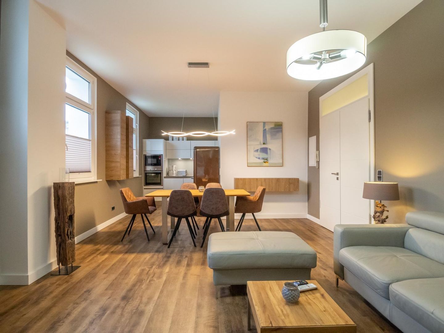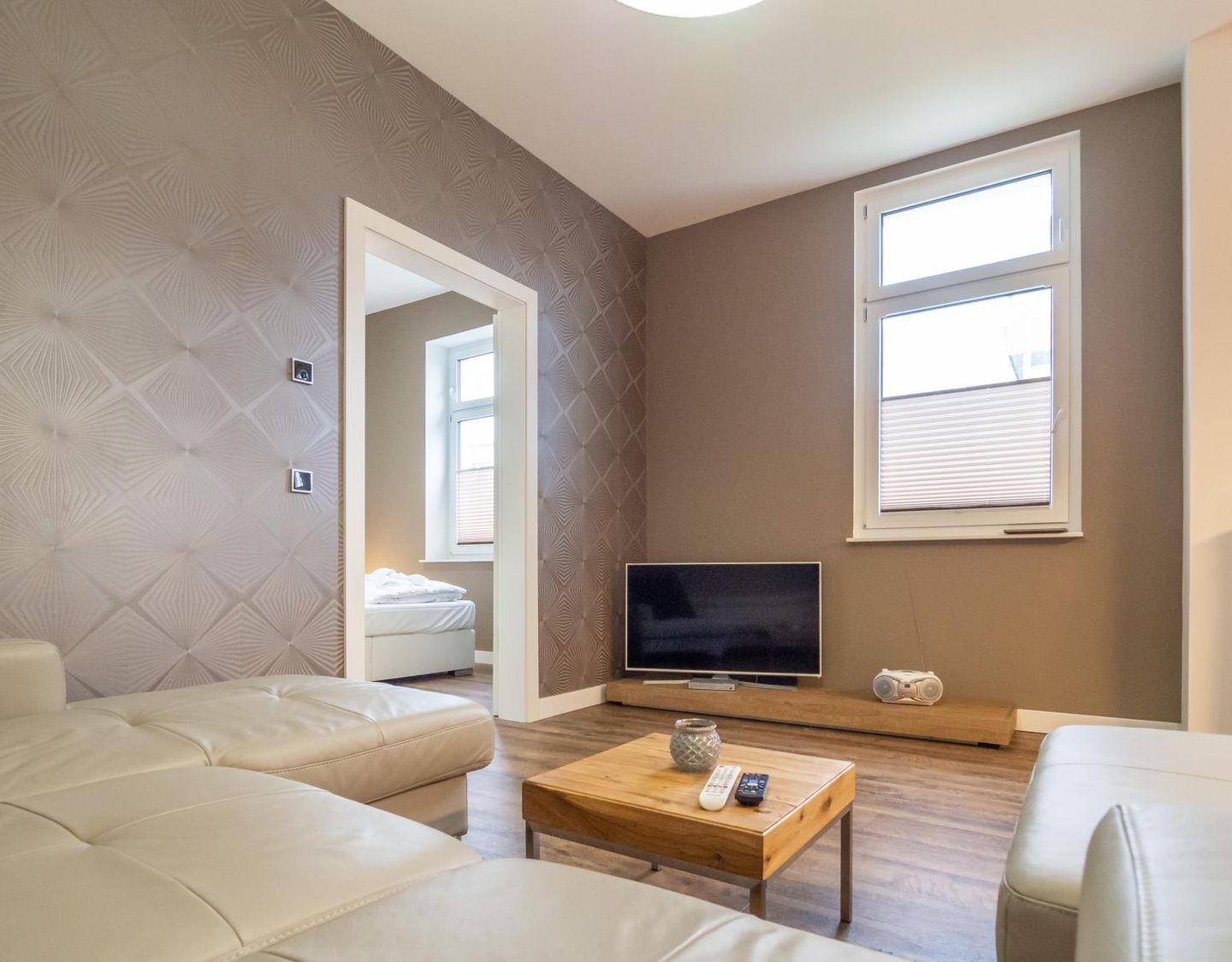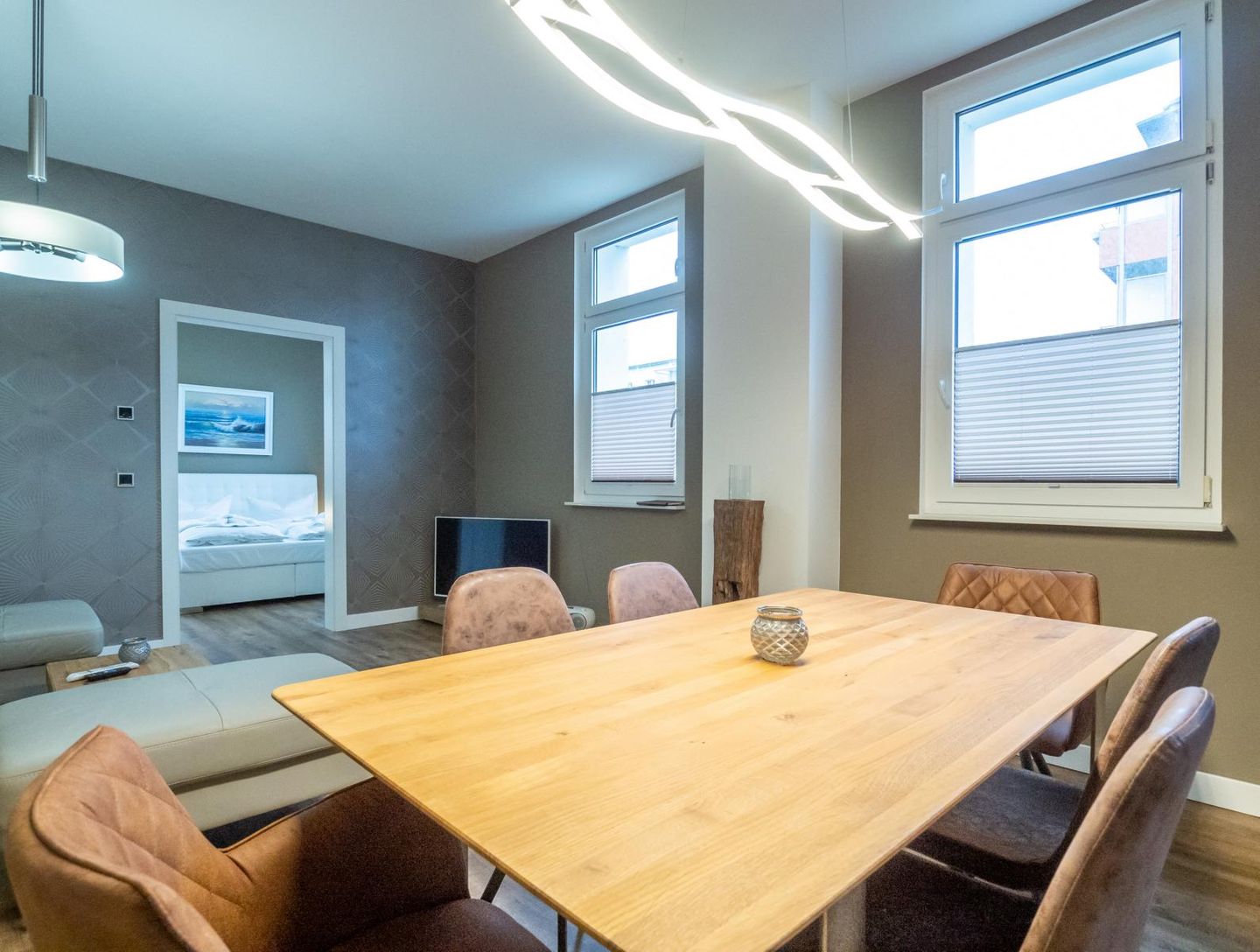 Die Ferienwohnung befindet sich im Hochparterre der Villa Gössel. Sie hat eine Wohnfläche von ca. 50qm und besteht aus einem Schlafzimmer mit Doppelbett, einem Wohnzimmer mit Schlafcouch für zwei weitere Personen, einem Bad mit Dusche und einer im Wohnbereich integrierten, moderne Einbauküche. Die ganze Wohnung ist sehr modern und sehr geschmackvoll eingerichtet. Es gibt sowohl im Schlafzimmer als auch im Wohnzimmer TV. Die Küche verfügt über sämtliche Annehmlichkeiten wie Geschirrspüler, Ceran- und Induktionsherd, Backofen, Mikrowelle, Kühlschrank, Gefriermöglichkeit und natürlich über Kaffeemaschine, Wasserkocher, Toaster und genügend Küchenutensilien. Den Gästen steht außerdem eine Waschmaschine zur Verfügung. In der Wohnung gibt es ein kostenfreies WLAN. Zur Wohnung gehört der Pkw-Stellplatz Nr. 3 direkt am Haus sowie abschließbare Fahrradunterstellmöglichkeiten im Keller des Hauses.