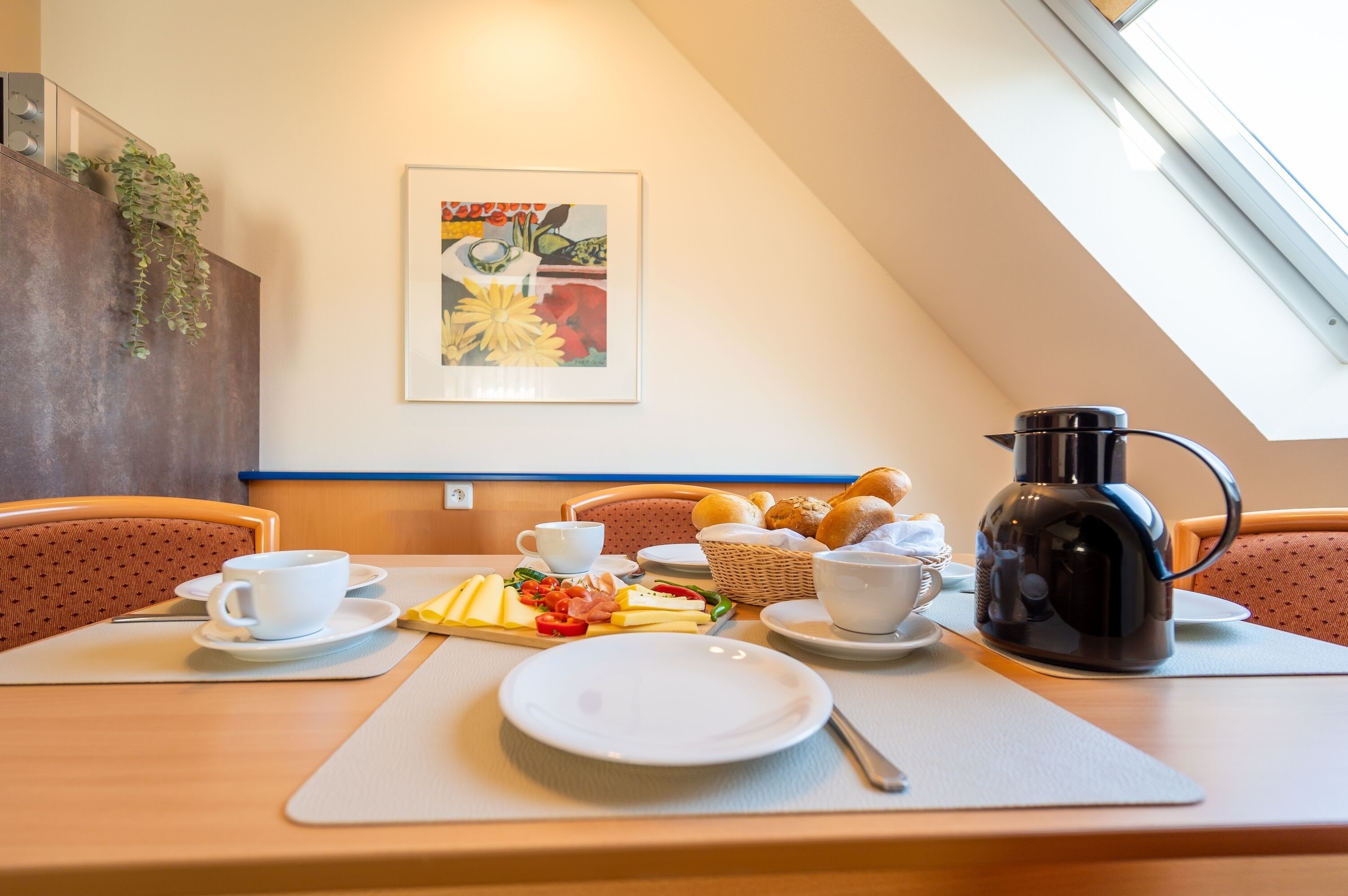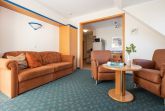 Das helle Wohnzimmer verfügt über eine Couchgarnitur, welche ebenso eine Aufbettung für 2 weitere Personen darstellt. Neben einem TV und einem kostenfreien WLAN-Zugang erreichen Sie von hier aus den sonnigen Balkon inkl. Balkonmöbel.