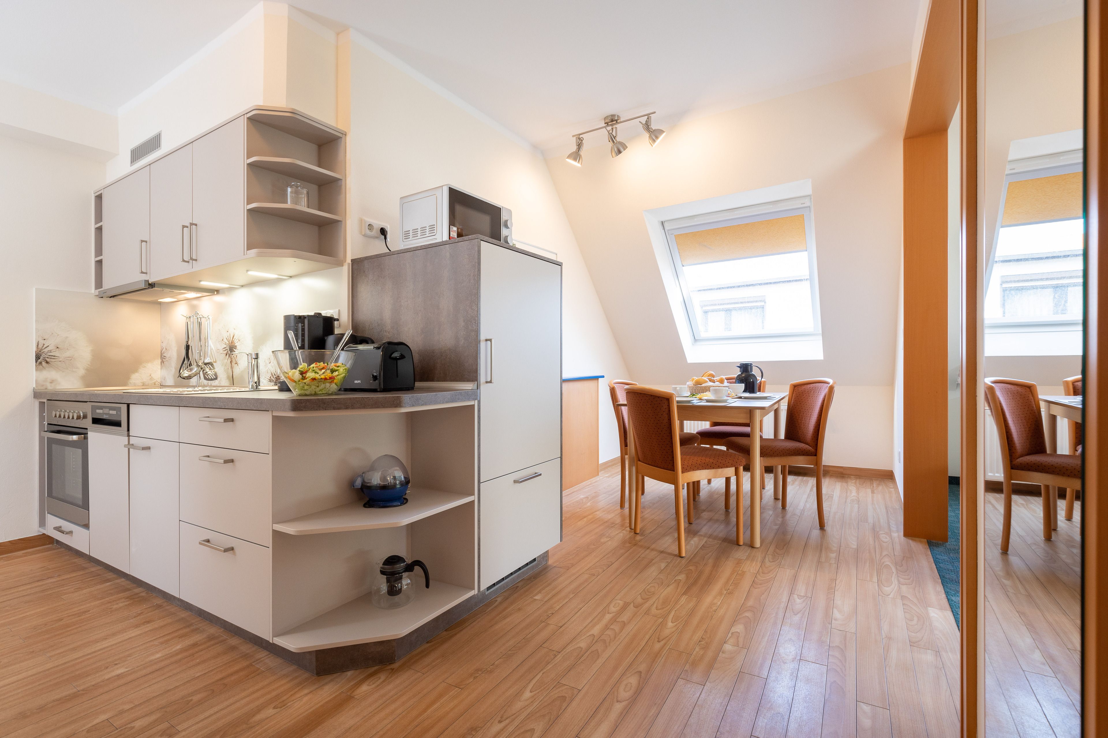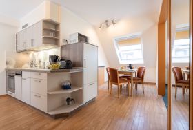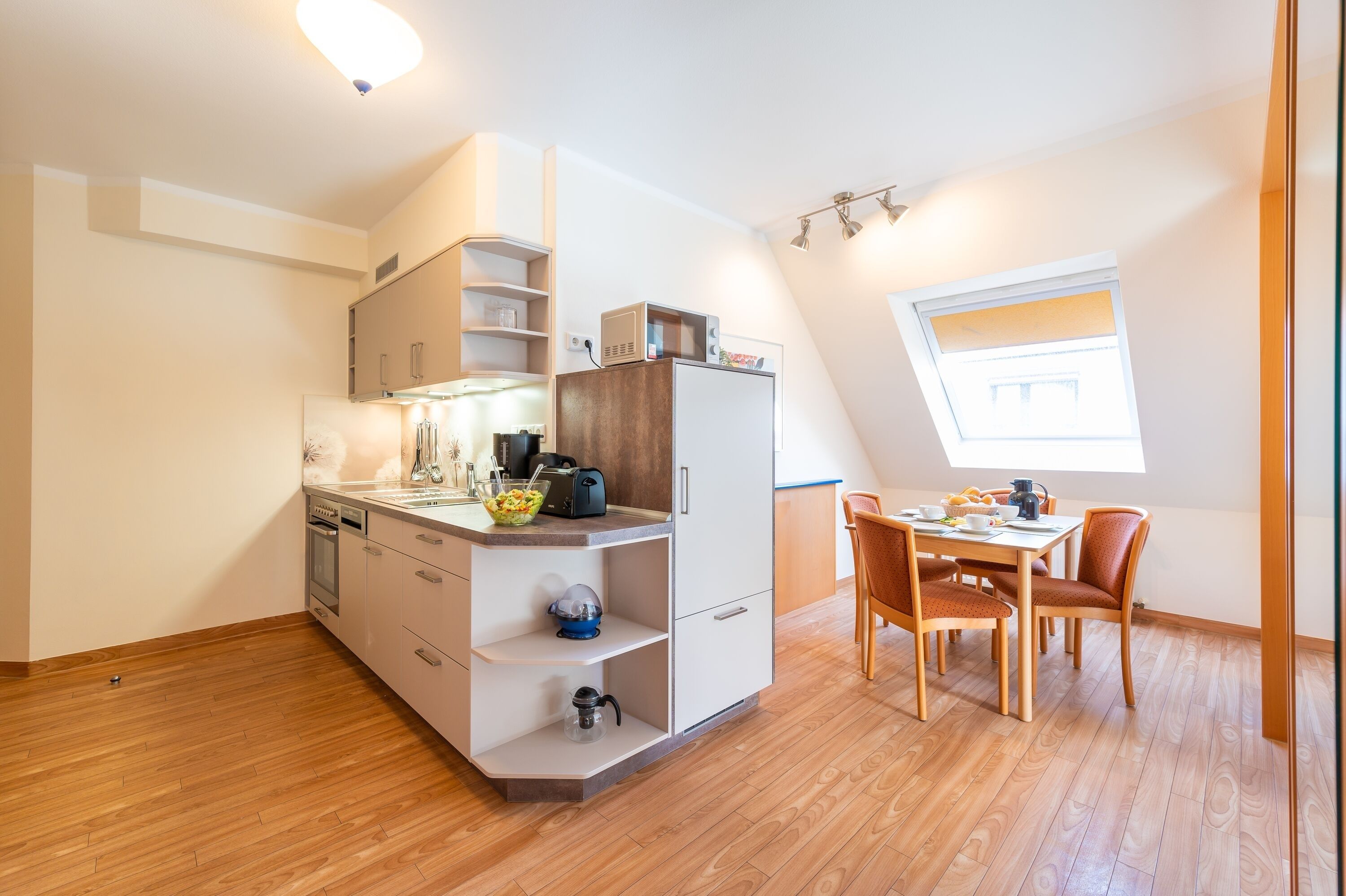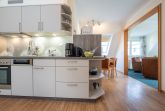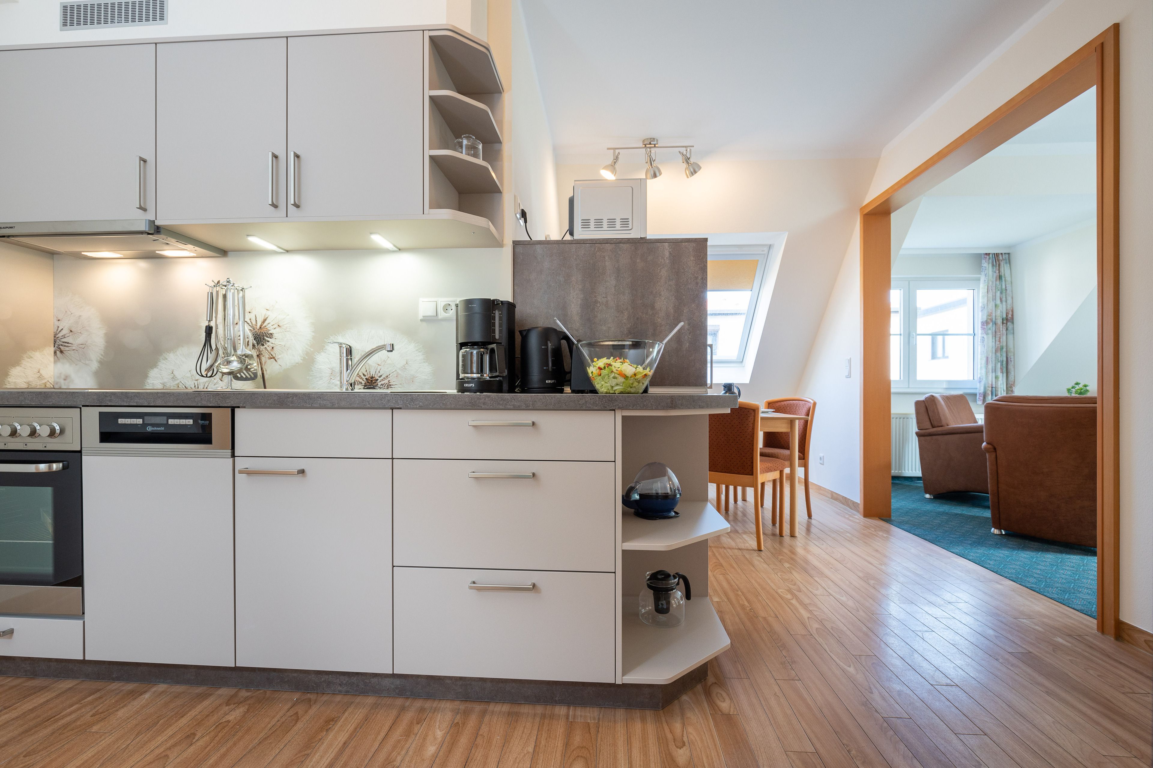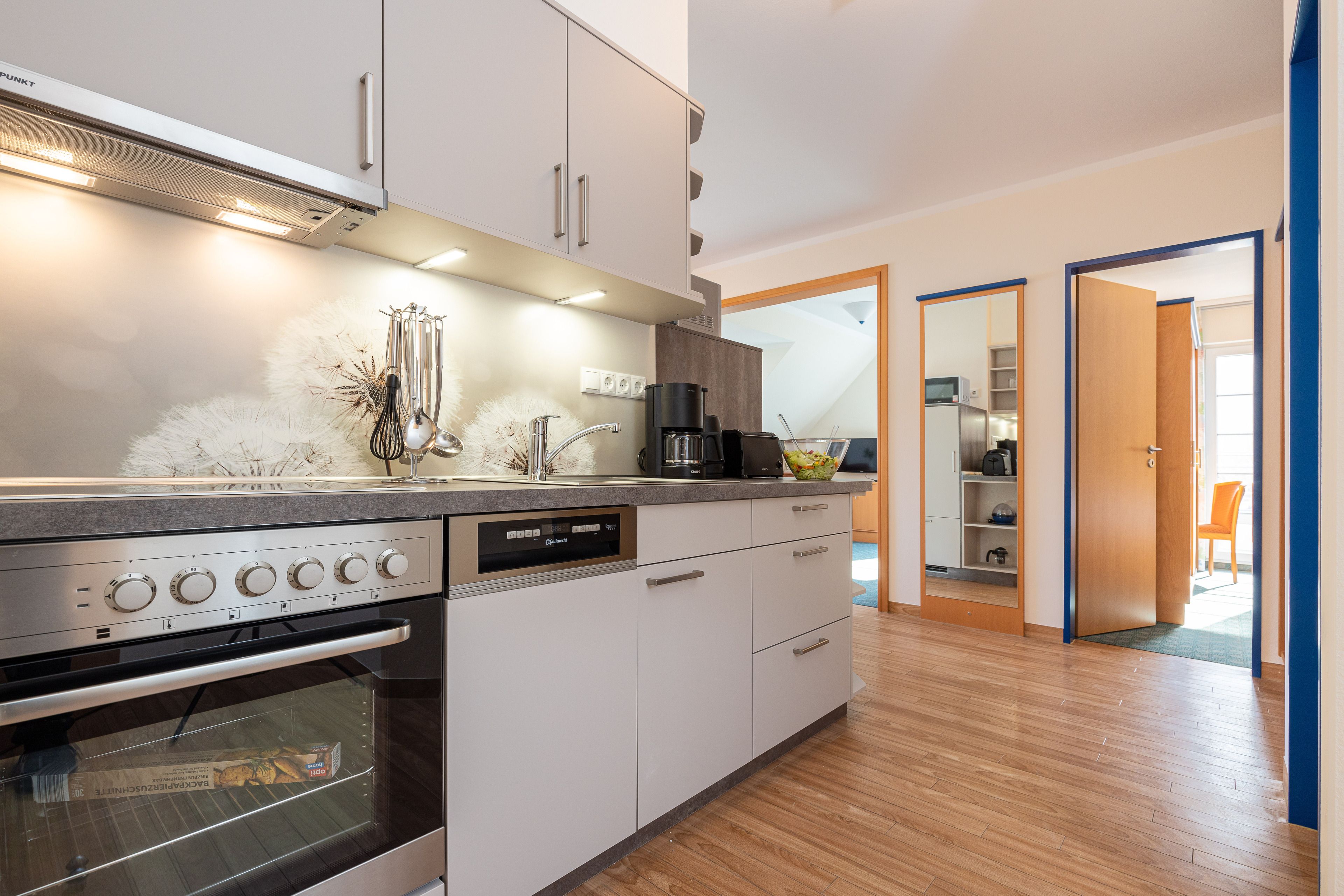 Die Küchenzeile ist mit einem Kühlschrank, einem Ceranfeld mit Backofen, einer Spülmaschine und einer Mikrowelle ausgestattet. Ebenso finden sich hier alle nötigen Küchenkleingeräte (Wasserkocher, Kaffeemaschine, Toaster..).