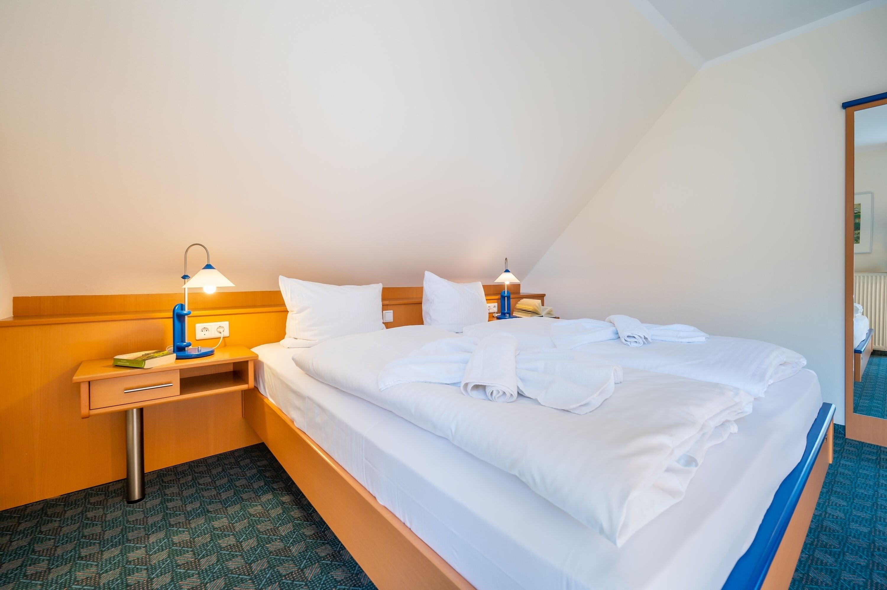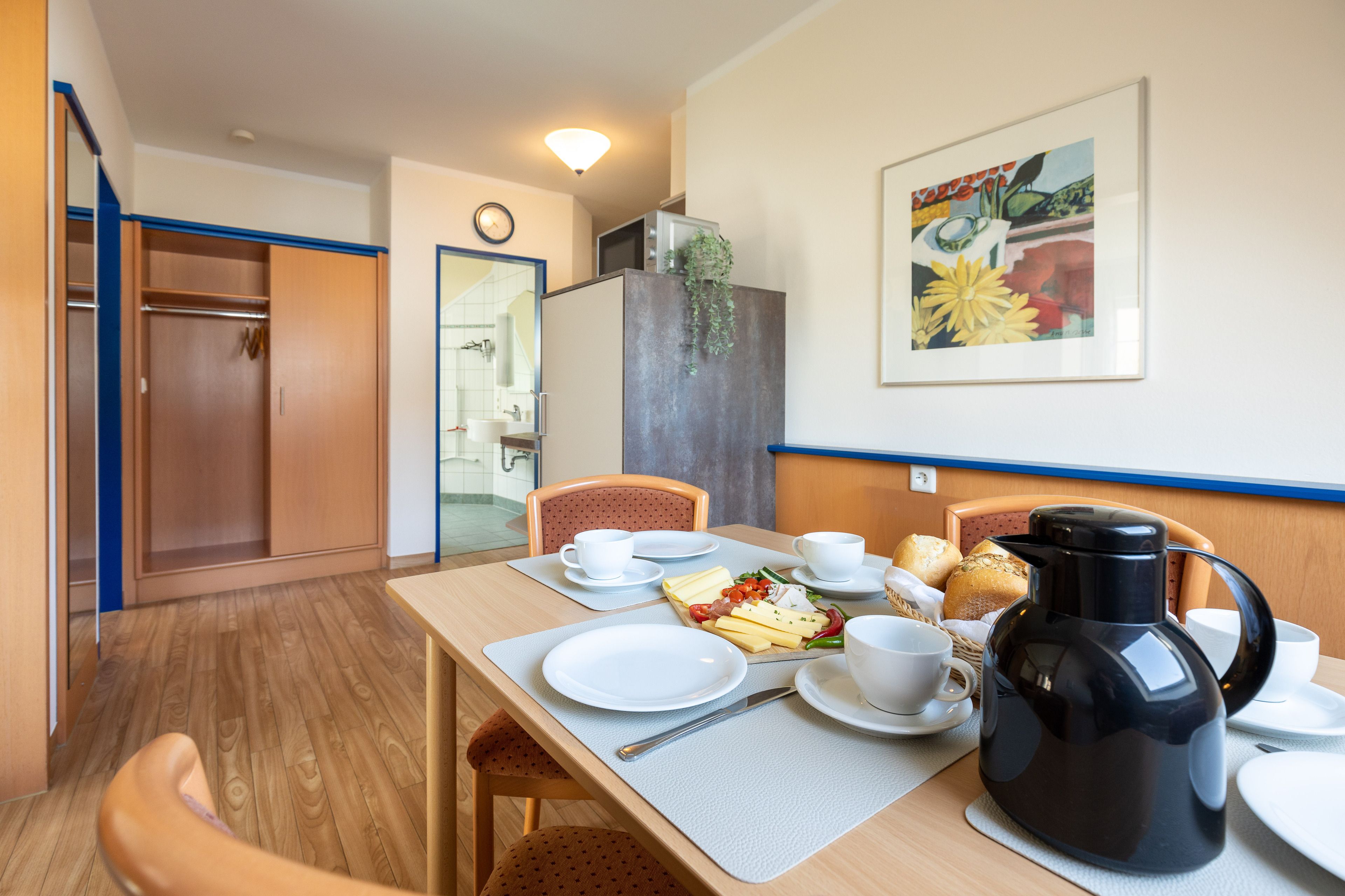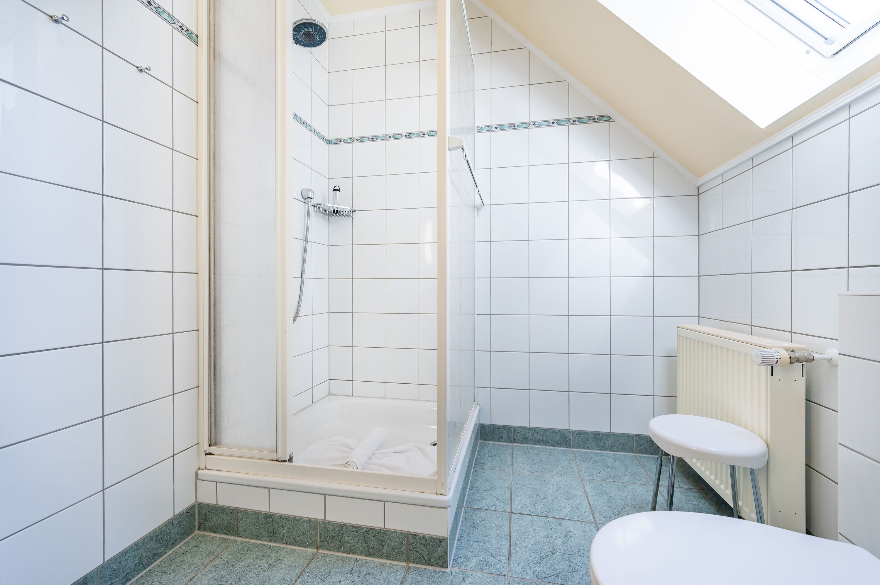 Im Schlafbereich steht ein komfortables Doppelbett, ein geräumiger Kleiderschrank und ein kleiner Schreibtisch bereit. Im Badezimmer mit Fenster befindet sich eine Dusche und ein WC.