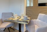 Frisch und aufwendig renoviert in 2024, erwartet Sie eine hochwertige und mit vielen liebevollen Details eingerichtete Ferienwohnung, die im Hochpaterre liegt und über einen eigenen, privaten Eingang verfügt. Ein Highlight ist die großzügige, begrünte und uneinsehbare Terrasse, für viele entspannte Stunden mit Sonnenschein vom Nachmittag bis zum Sonnenuntergang. Der stilvolle Wohnbereich mit Terrassenzugang ist lichtdurchflutet und mit einem bequemen Sofa zum Relaxen sowie einem Smart-TV ausgestattet. WLAN steht selbstverständlich zur Verfügung. Die offene Wohnküche in perfekter Ausstattung verfügt unter anderem über Spülmaschine, Backofen mit integrierter Mikrowelle, Induktionskochfeld, Kühlschrank und Gefrierfach. Der integrierte Essbereich ist sehr gemütlich gestaltet. Das großzügig angelegte Schlafzimmer ist mit einem Boxspringbett (180x200), Kleiderschrank für die Urlaubsgarderobe und einem Schreibtisch eingerichtet. Die bodentiefen Terrassenfenster lassen sich mit Vorhängen verdunkeln. Im modernen Bad sorgen zwei Fenster für reichlich Tageslicht. Die hochwertige Ausstattung umfasst eine Walk-In Dusche, Waschtisch, Spiegel mit indirekter Beleuchtung, Handtuchtrockner und WC.
