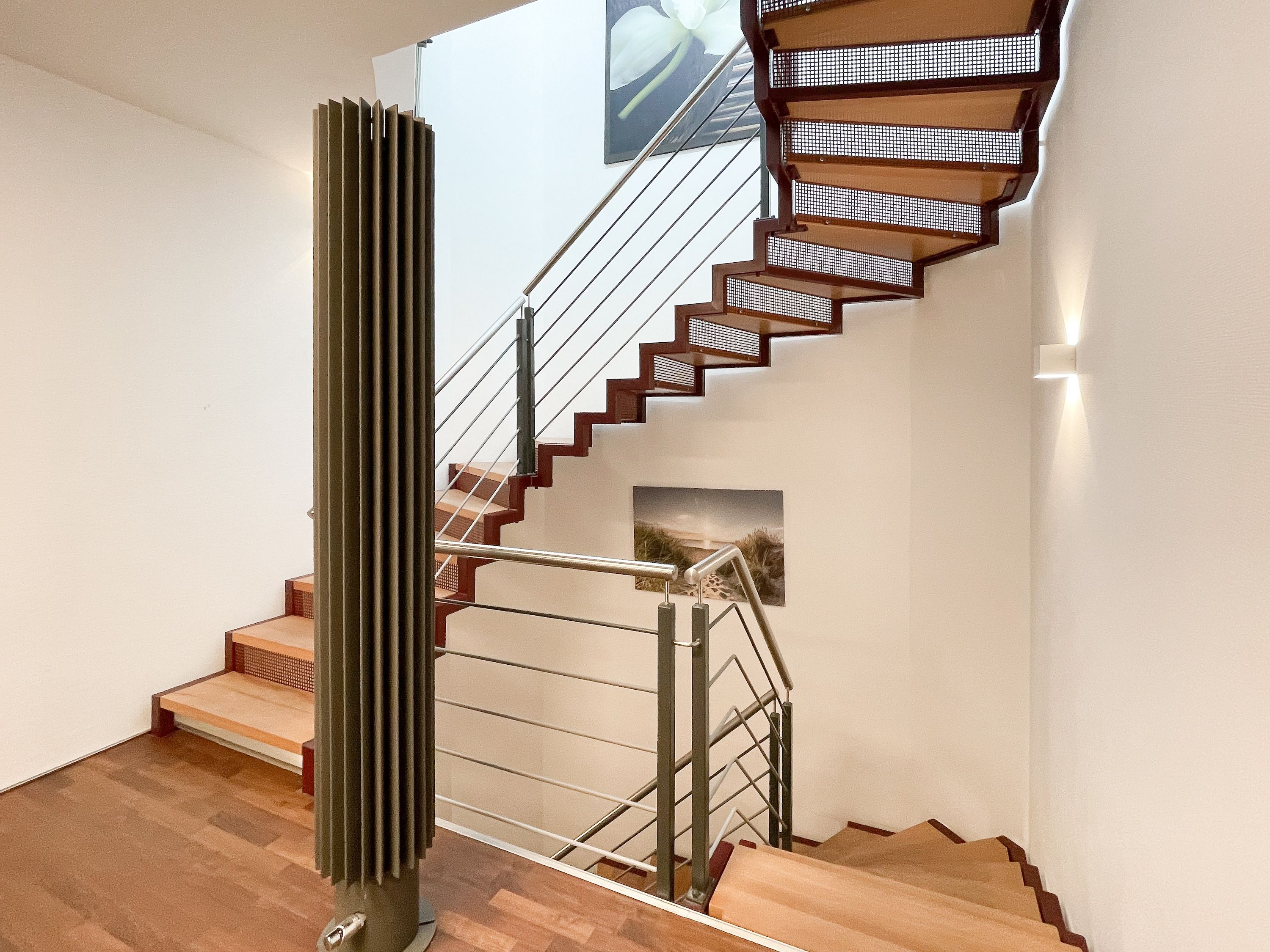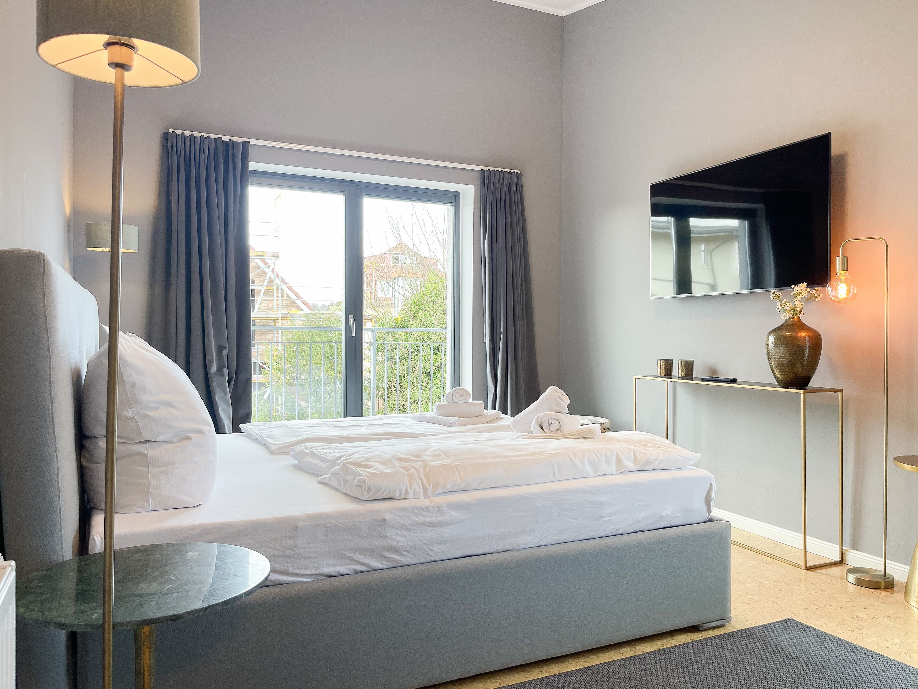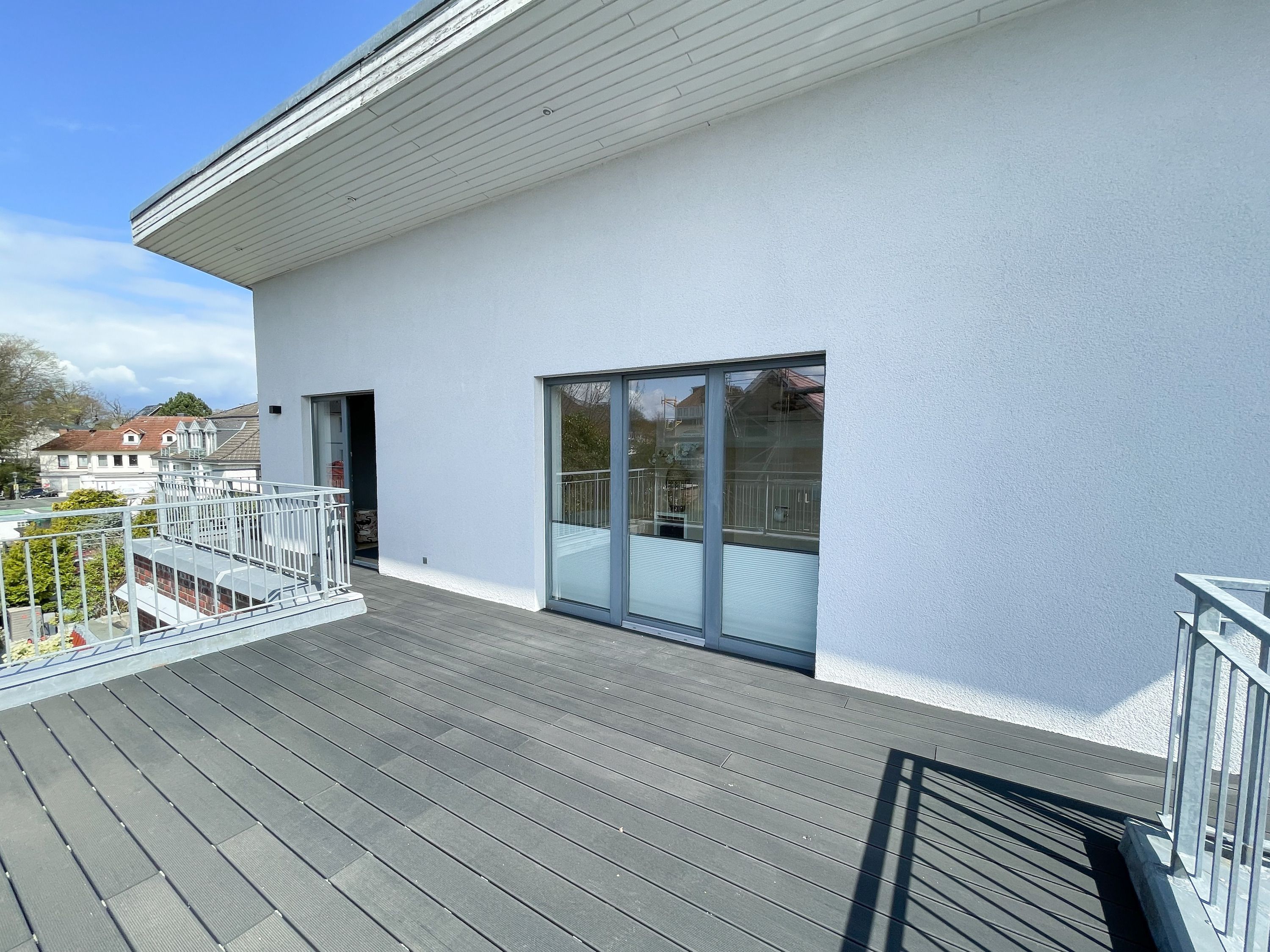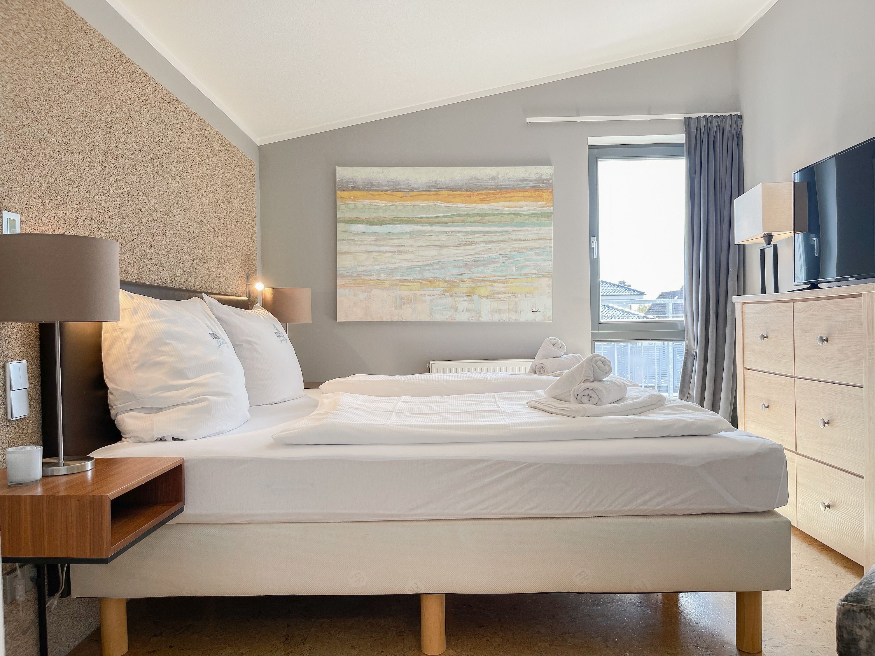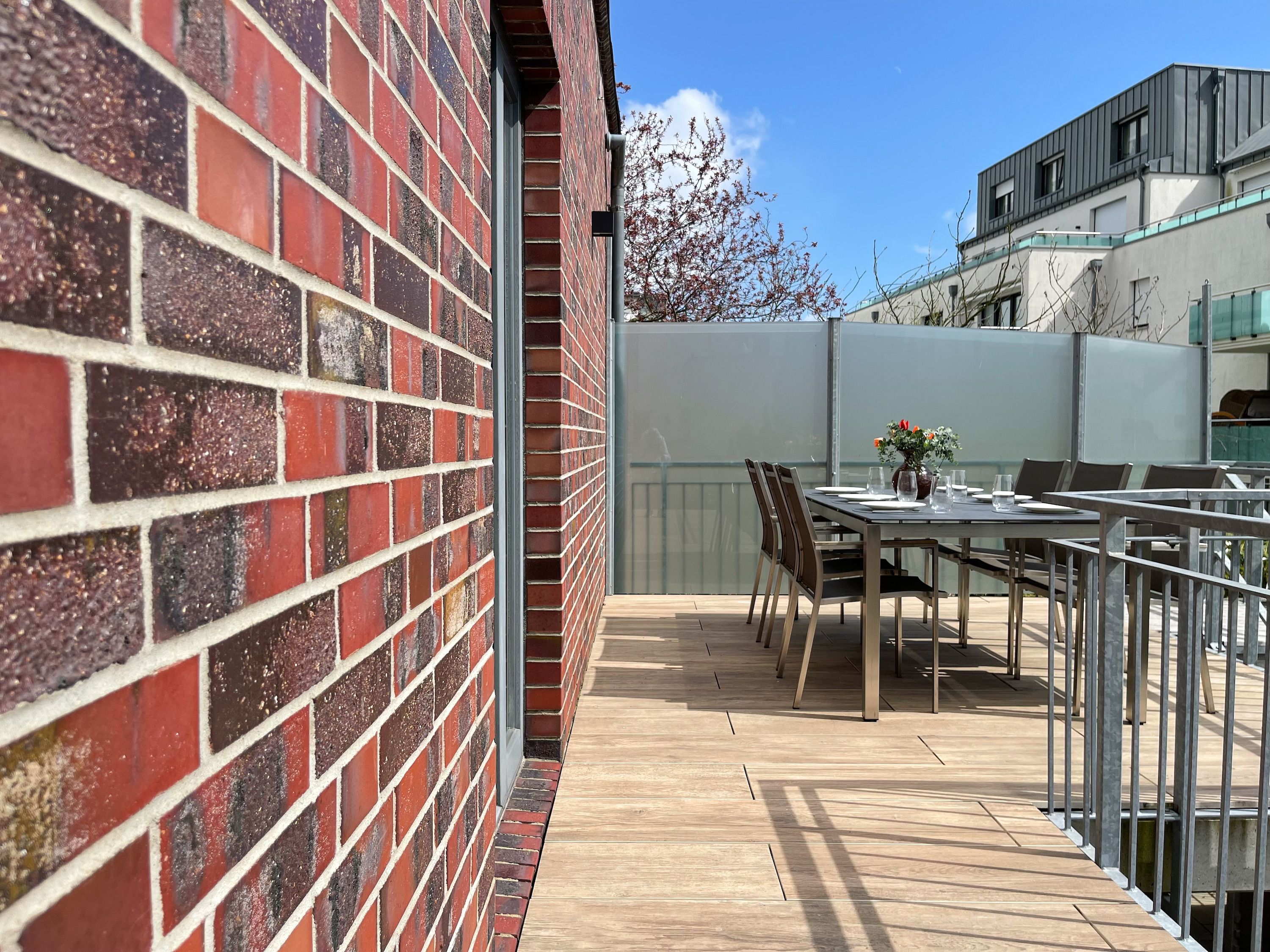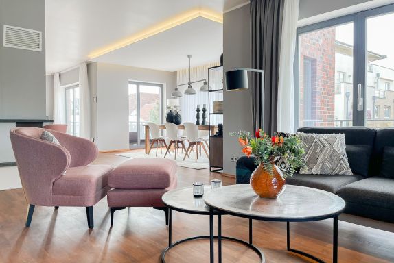 Das Penthouse Deck 2 erstreckt sich über 2 Ebenen im ersten und zweiten Obergeschoss eines Ferienhauses mit nur 2 Wohnungen und bietet auf 180 qm Wohnfläche (zzgl. Terrassen) ausreichend Raum für 6 Personen, um einen erholsamen Ostseeurlaub zu verleben. Der Zugang zur Wohnung erfolgt über das Erdgeschoss mit großzügigem Eingangsbereich, Garderobe und reichlich Stellfläche für Kinderwagen usw. Über die offene Treppe ist das erste Obergeschoss zu erreichen. Hier erwarten Sie lichtdurchflutete, unglaublich großzügige Räumlichkeiten mit bodentiefen Fensterelementen, hochwertig eingerichtet im Hampton Style. Das Leben spielt sich im äußerst weitläufigen Wohn- Essbereich ab, der mit einer hochwertigen Sofalandschaft, einem riesigen Essbereich für gemütliches Beisammensein und einer Leseecke eingerichtet ist. Es gibt drei Zugänge zu den vorgelagerten Dachterrassen, die mit Gartenmöbeln und elektrischer Markise ausgestattet sind. Genießen Sie die Sonne von früh bis spät mit Blick auf den liebevoll gestalteten Garten mit Teichanlage und Goldfischen von der Wohnung Deck 1. Die offene Einbauküche mit Kochinsel bietet viel Platz lädt zum gemeinsamen Kochen ein. Auf dieser Ebene befindet sich weiterhin ein Schlafzimmer mit einem Doppelbett (180x200), Verdunklungsvorhängen, Kinderbettchen und Wickelkommode sowie ein Gäste WC und ein Hauswirtschaftsraum, in dem auch Waschmaschine und Trockner untergebracht sind. Über das offene Treppenhaus ist die zweite Wohnebene zu erreichen. Hier befinden sich zwei weitere Schlafzimmer, ausgestattet mit Doppelbetten, Verdunklungsvorhänge und TV sowie ein großzügig angelegtes Wellnessbad mit Dusche, Badewanne und Sauna. Eines der Schlafzimmer verfügt über ein weiteres Duschbad ensuite und im Flurbereich ist ein Kleiderschrank untergebracht, der reichlich Stauraum für die Urlaubsgarderobe bietet.