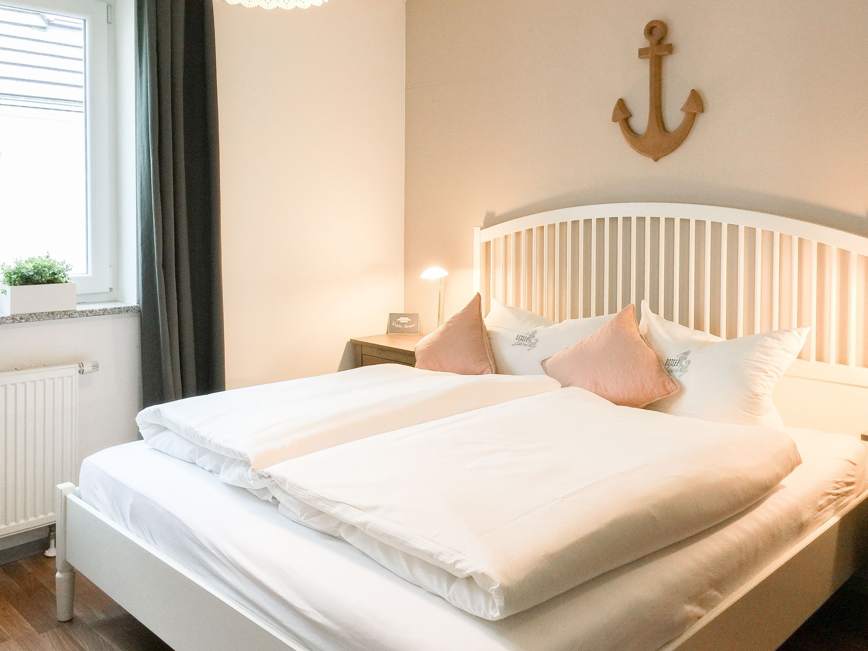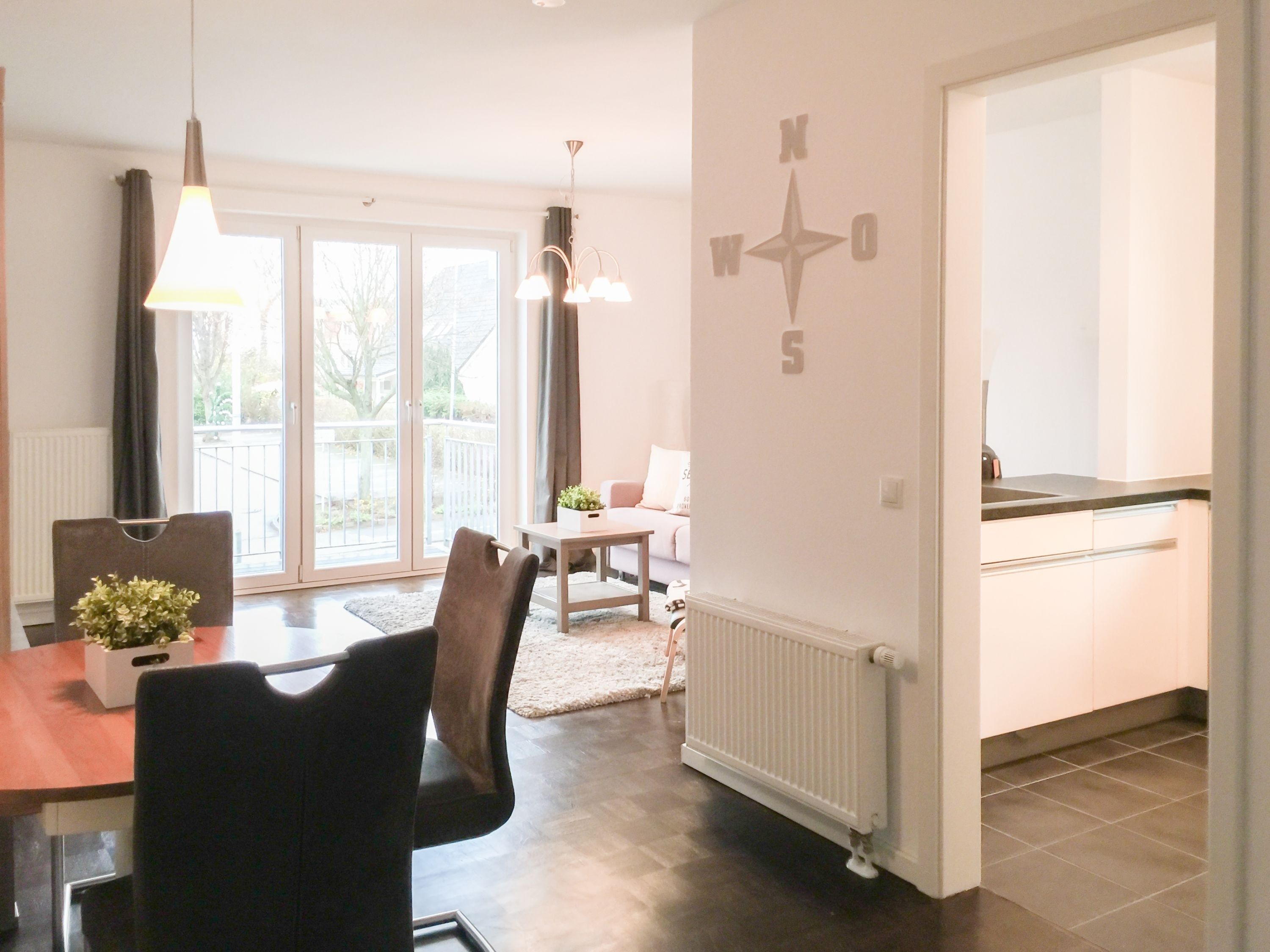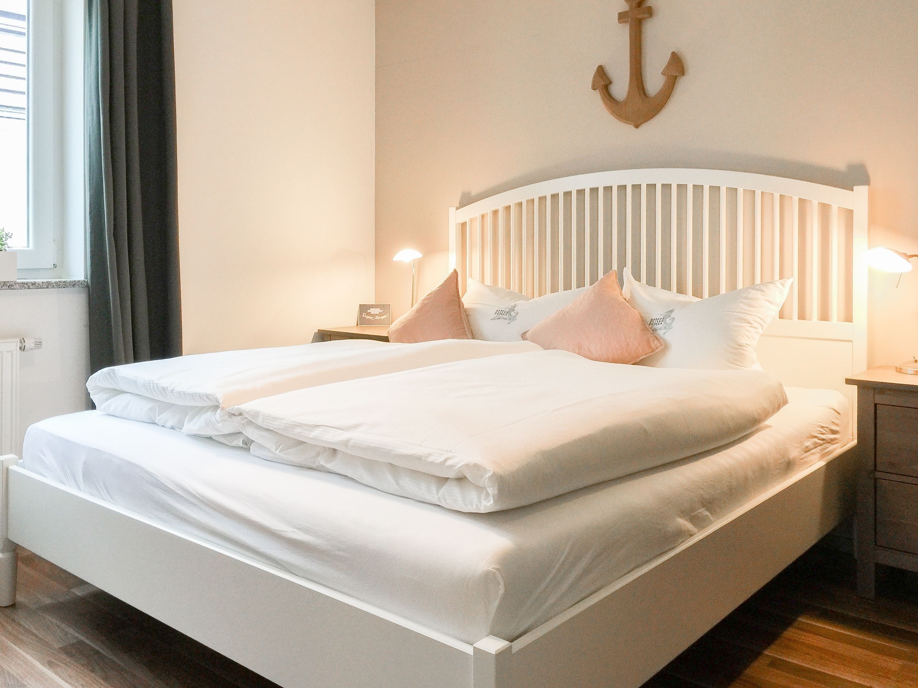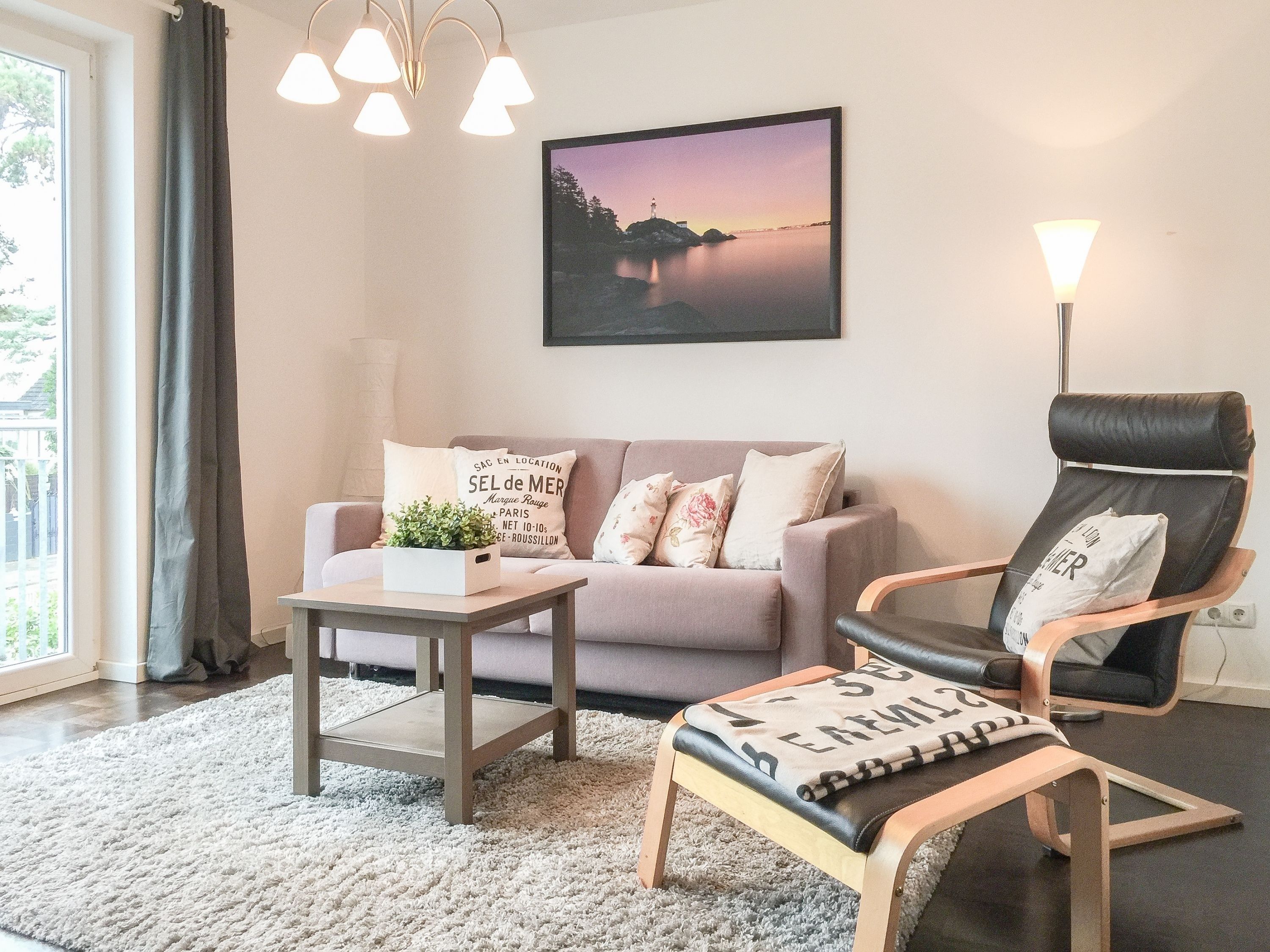 Mit seinen 2 Zimmern bietet es hervorragend Platz für bis zu 4 Personen. Die moderne Inneneinrichtung sowie die dunklen Holzfußböden sorgen für ein äußerst behagliches Wohnambiente. Der gemütliche Wohnbereich ist mit einem ausziehbaren Sofa ausgestattet. Dieses lässt sich schnell zu einem Schlafplatz für zwei weitere Personen umbauen. Die helle Hochglanzküche schließt direkt an den Wohnbereich an. So können Sie auch beim Kochen eines leckeren Essens stets bei Ihren Lieben sein. Das geschmackvoll eingerichtete Schlafzimmer ist mit einem Doppelbett (180x200) sowie einem großen Kleiderschrank eingerichtet. Hier haben Sie ausreichende Möglichkeiten die Urlaubsgarderobe unterzubringen. Liebevoll ausgesuchte Wohnaccessoires runden das maritime Flair dieser Wohnung perfekt ab. Das Bad ist mit einer begehbaren Dusche, Badewanne, Handtuchwärmer und Fußbodenheizung versehen. Für Unterhaltung sorgen zwei TV, ein Bluetooth Lautsprecher mit Radio sowie die kostenlose Nutzung des WLAN, damit Sie auch im Urlaub stets online sein können.