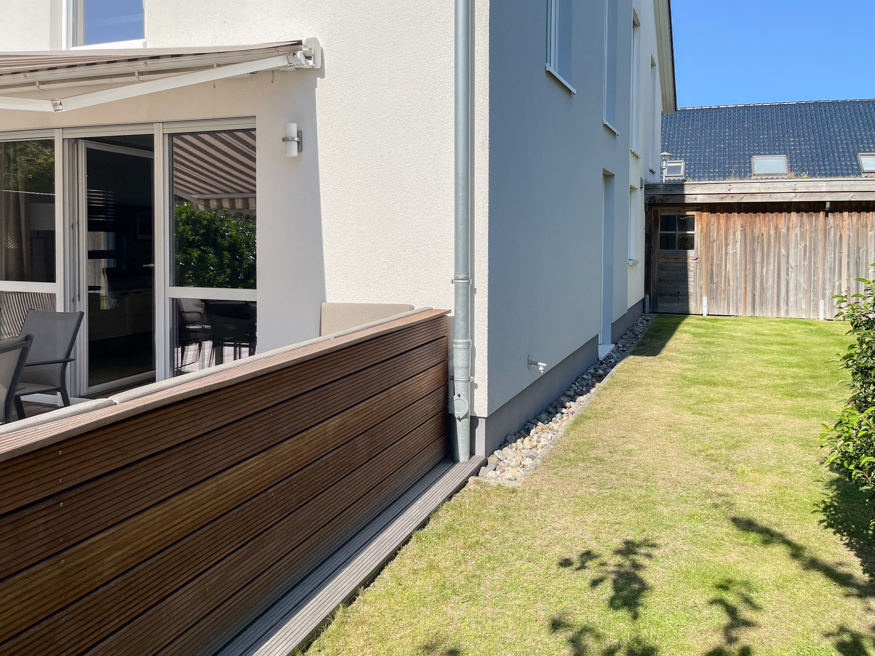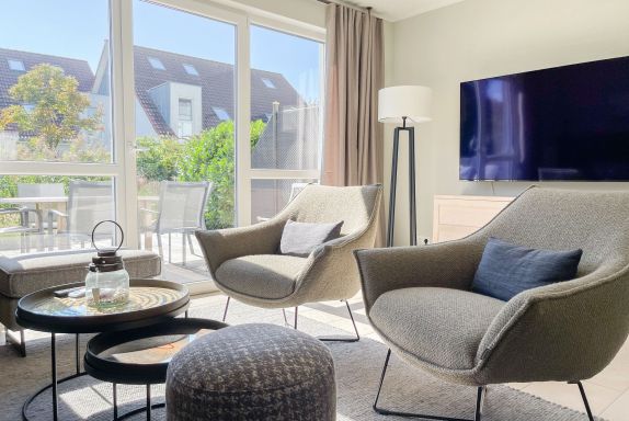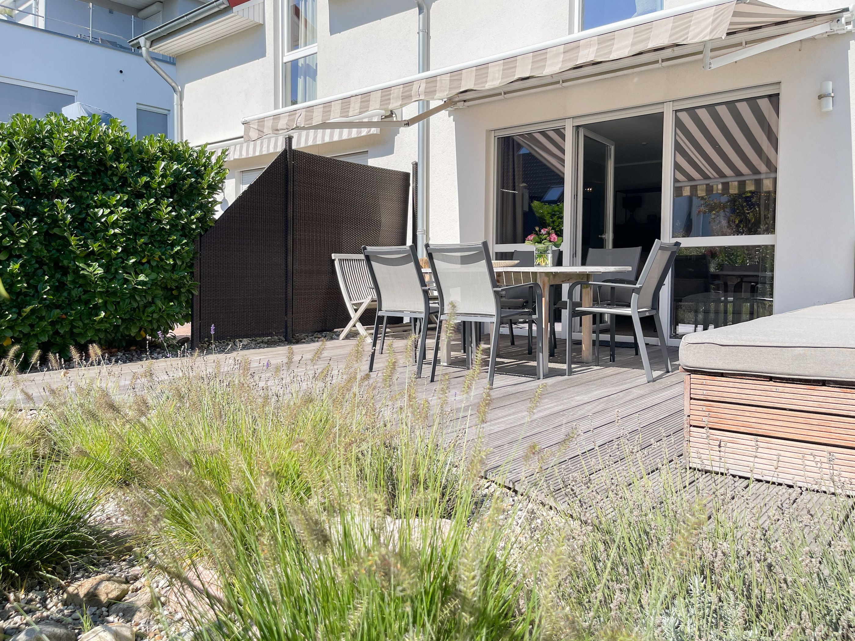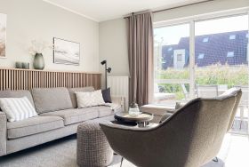 Es erwartet Sie ein exklusives Doppelhaus, das mit 3 Schlafzimmern und 2 Bädern auf über 100 qm Wohnfläche ausreichend Raum für 4-6 Personen bietet, um einen entspannten Ostseeurlaub in Strandnähe zu verleben. Sonnige Räumlichkeiten und die äußerst hochwertige Einrichtung im Hampton Style garantieren einen hohen Wohnstandard in einem herrlichen Ambiente. Im Erdgeschoss erwartet Sie ein großzügiger Wohnbereich, der mit einem komfortablen Sofa, Sesseln und TV eingerichtet ist. Die vorgelagerte Holz-Sonnenterrasse in Südausrichtung ist mit einer XL - Lounge und Gartenmöbeln sowie einer elektrischen Markise ausgestattet.