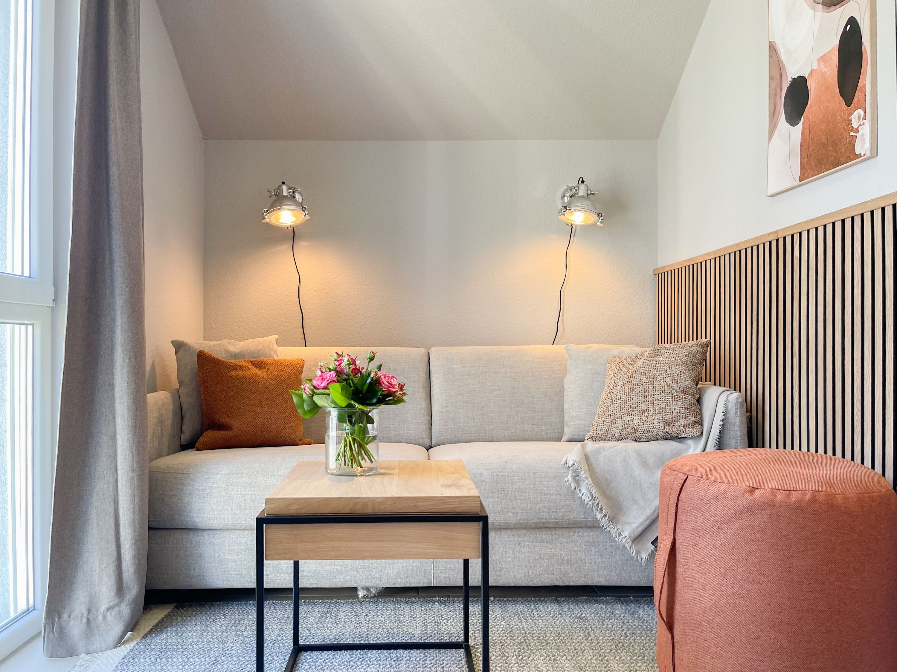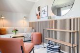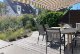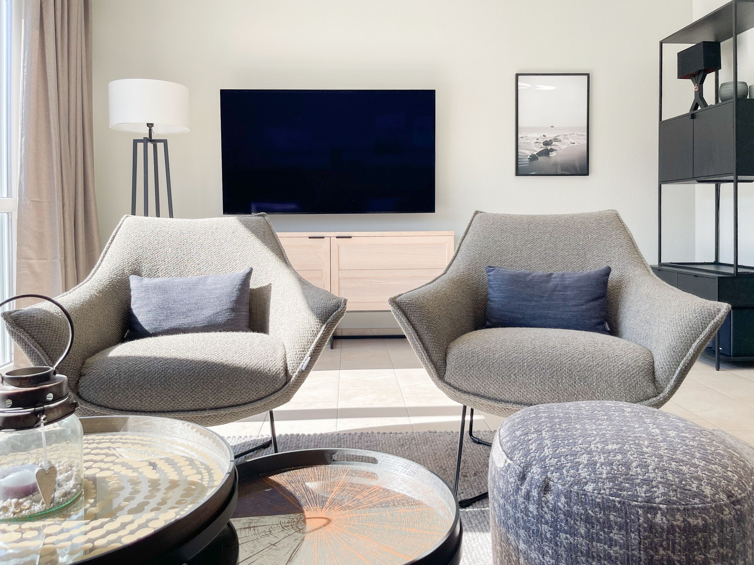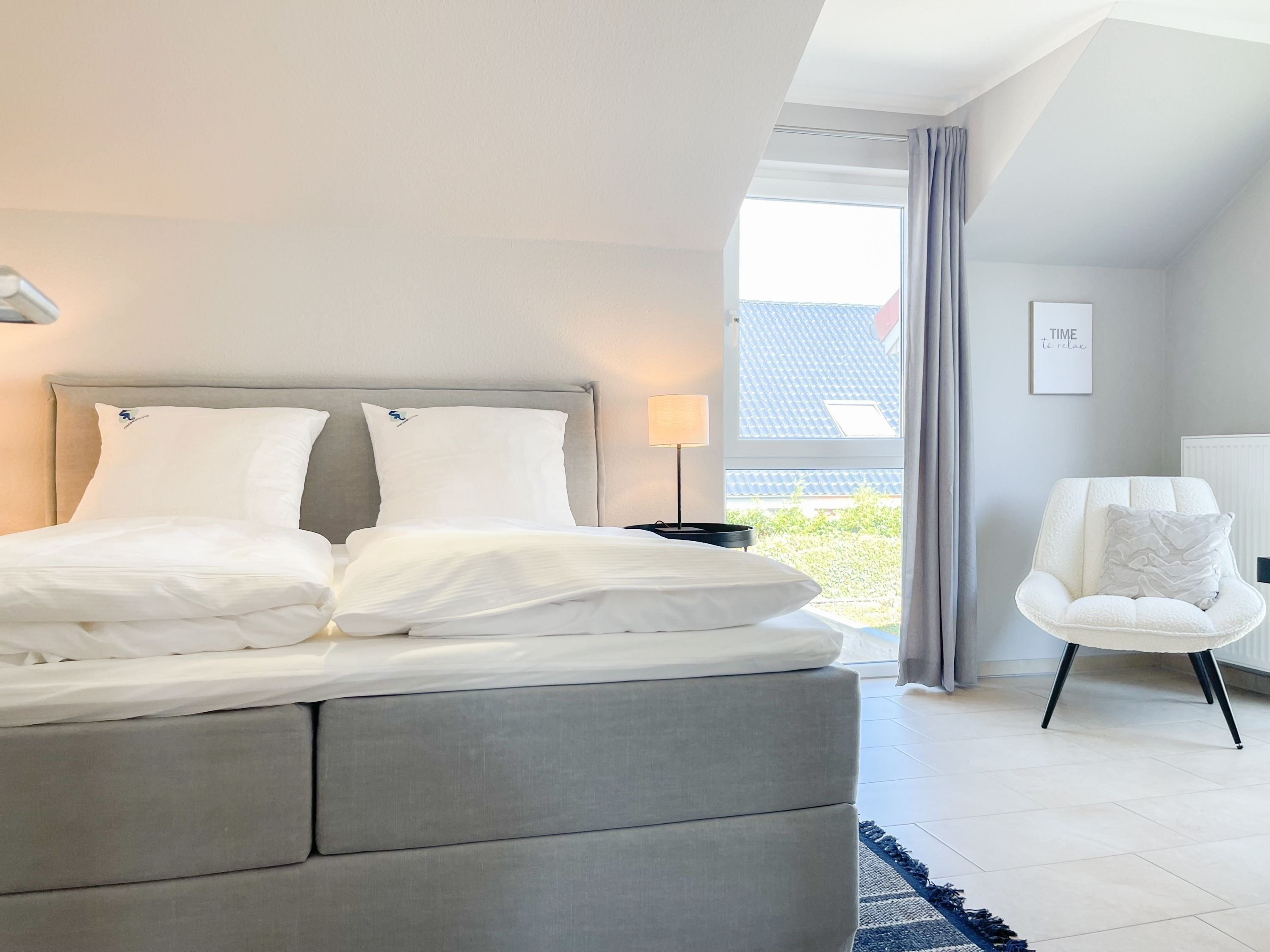 Es erwartet Sie ein exklusives Doppelhaus, das mit 3 Schlafzimmern und 2 Bädern auf über 100 qm Wohnfläche ausreichend Raum für 4-6 Personen bietet, um einen entspannten Ostseeurlaub in Strandnähe zu verleben. Sonnige Räumlichkeiten und die äußerst hochwertige Einrichtung im Hampton Style garantieren einen hohen Wohnstandard in einem herrlichen Ambiente. Im Erdgeschoss erwartet Sie ein großzügiger Wohnbereich, der mit einem komfortablen Sofa, Sesseln und TV eingerichtet ist. Die vorgelagerte Holz-Sonnenterrasse in Südausrichtung ist mit einer XL - Lounge und Gartenmöbeln sowie einer elektrischen Markise ausgestattet.