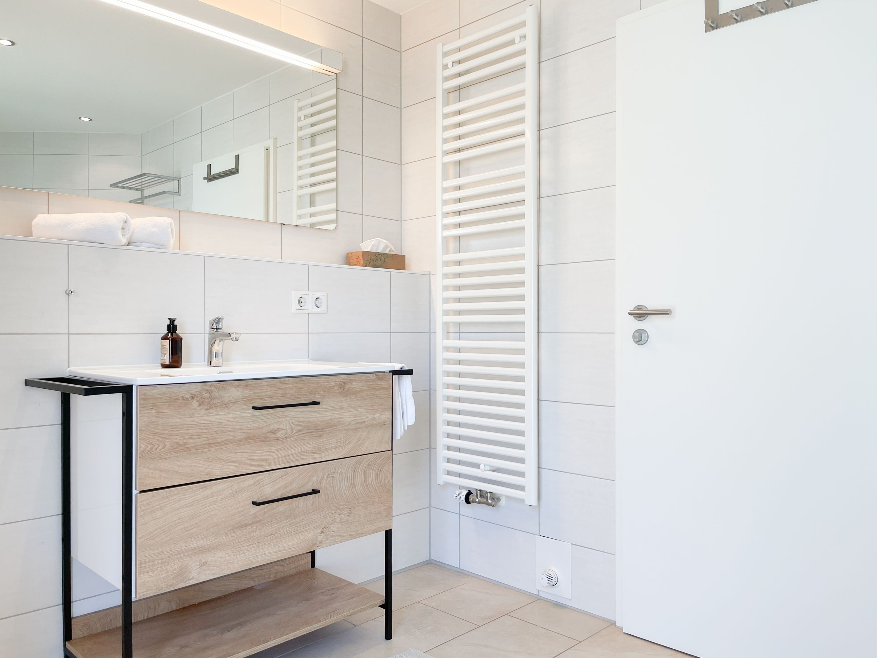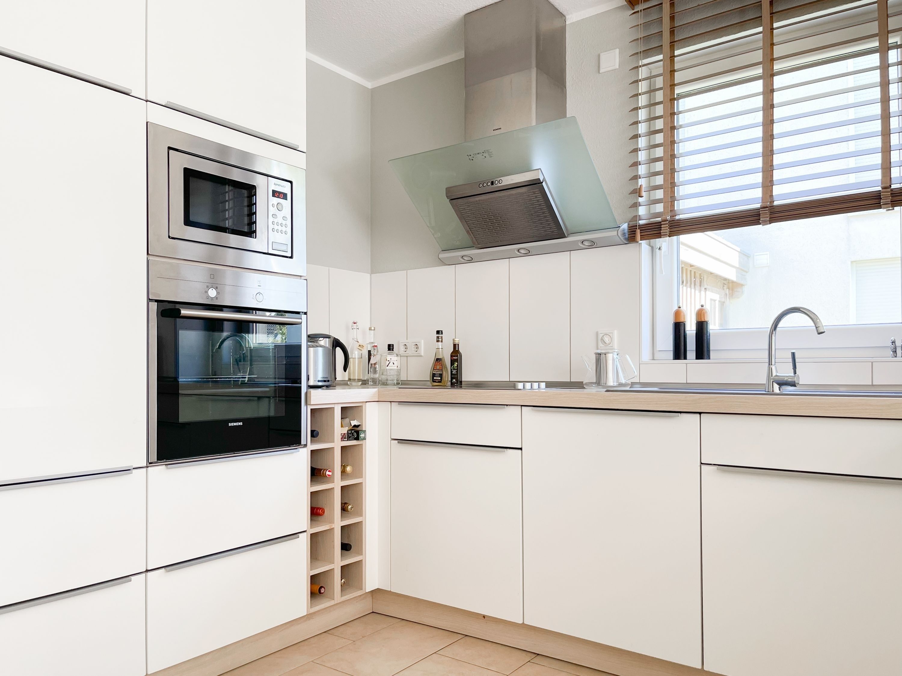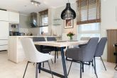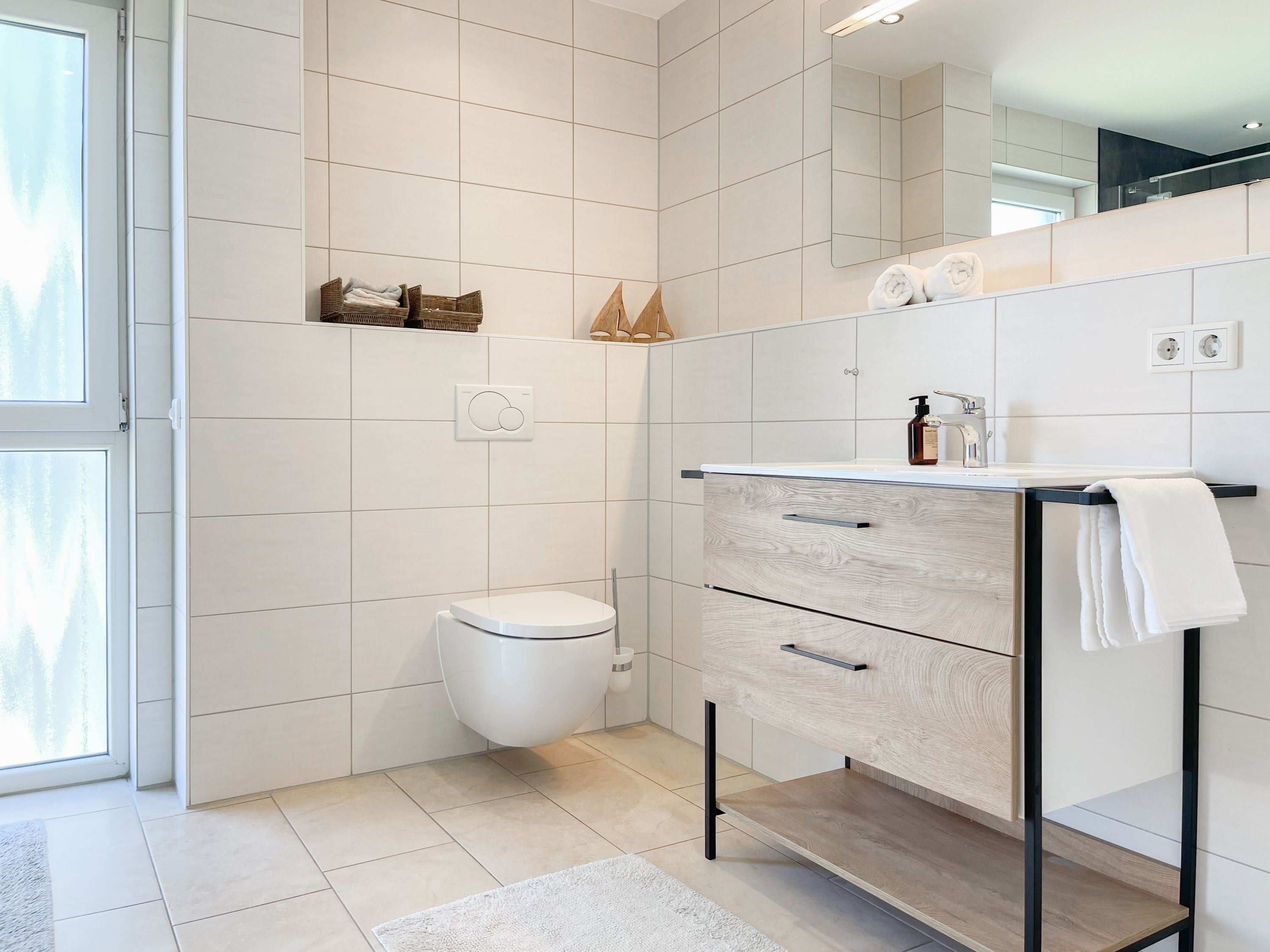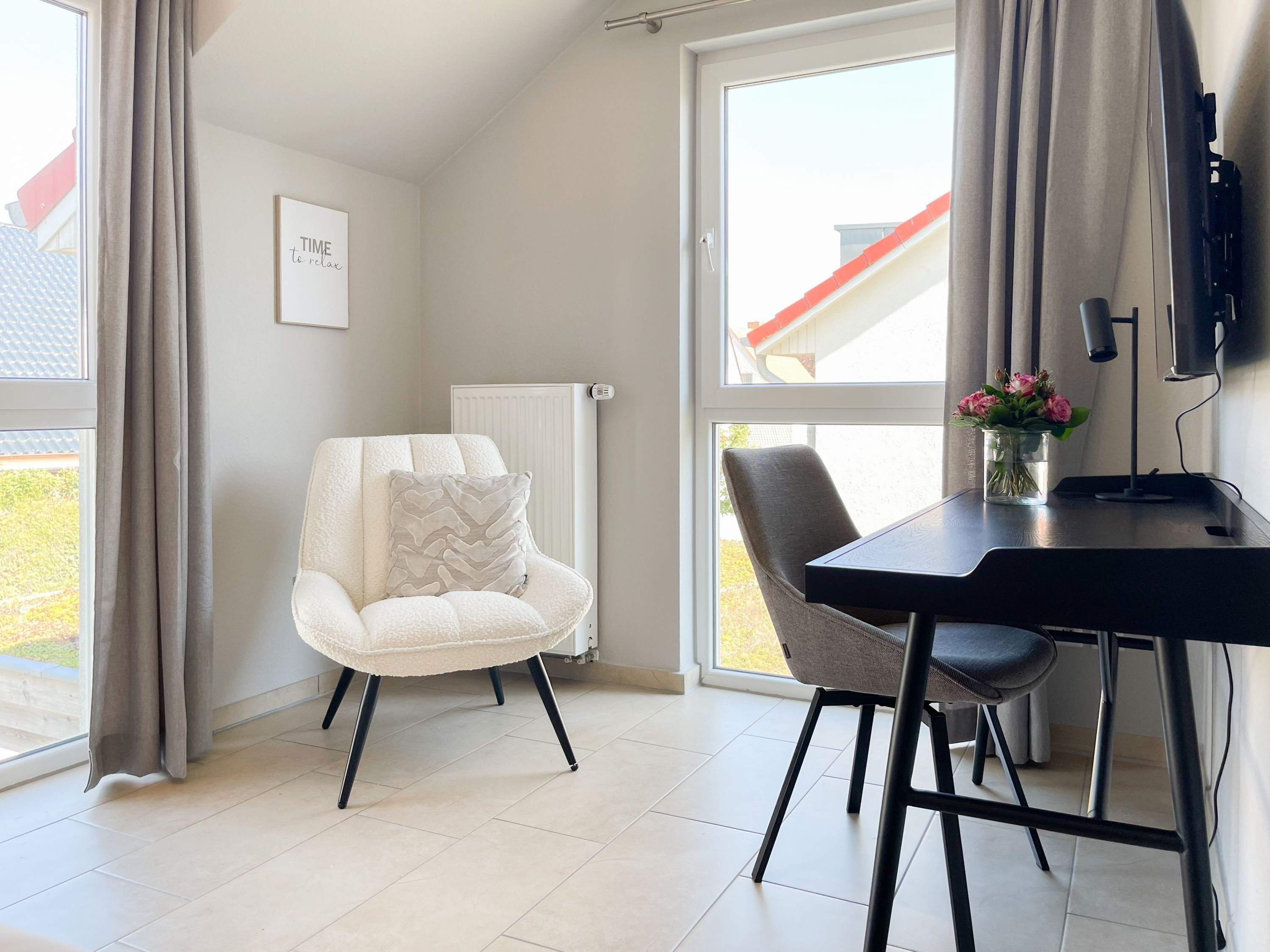Die großzügige Einbauküche ist bestens ausgestattet und lädt zum gemeinsamen Kochen ein. Der anschließende Essbereich, mit großem Esstisch und gemütlichen Sesseln, bietet ausreichend Platz für gemeinsame Mahlzeiten und geselliges Beisammensein. Im Eingangsbereich befindet sich eine Garderobe und ein neuwertiges Tageslichtbad mit Dusche, Waschbecken und WC. Waschmaschine und Trockner sind im separaten Abstellraum untergebracht, ebenfalls im Erdgeschoss. Im Obergeschoss gibt es 2 separate Schlafzimmer (eines mit zusätzlichem Schreibtisch für das home office), die mit hochwertigen Boxspringbetten (180x200), Kleiderschränken und TV eingerichtet sind. Der dritte Raum ist als weiterer Wohnbereich mit hochwertigem Schlafsofa und Kleiderschrank gestaltet und kann sowohl als gemütlicher Rückzugsort oder als zusätzliches Schlafzimmer genutzt werden. Das zweite neuwertige Bad ist sehr großzügig angelegt mit Badewanne, Dusche, Waschtisch, WC, Fußbodenheizung sowie Fenster und befindet sich ebenfalls im Obergeschoss. Alle Fenster des Hauses sind mit elektrischen Außenjalousien versehen. WLAN steht selbstverständlich kostenlos zur Verfügung. Vor dem Haus befinden sich zwei Parkplätze. (1 Carport und 1 Außenstellplatz). 2-3 Fahrräder können sicher und trocken im Schuppen am Haus untergestellt werden.