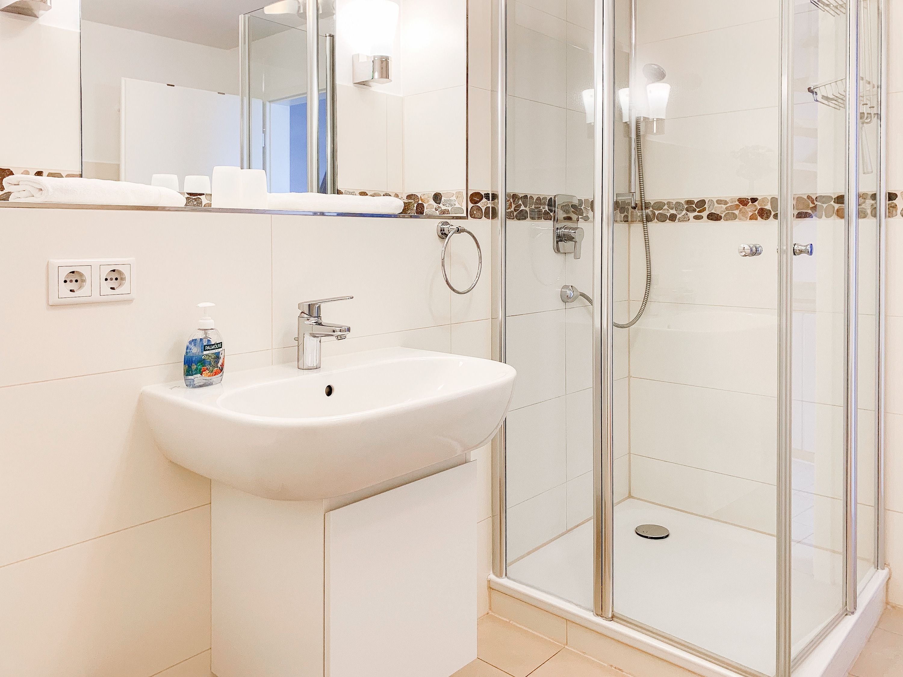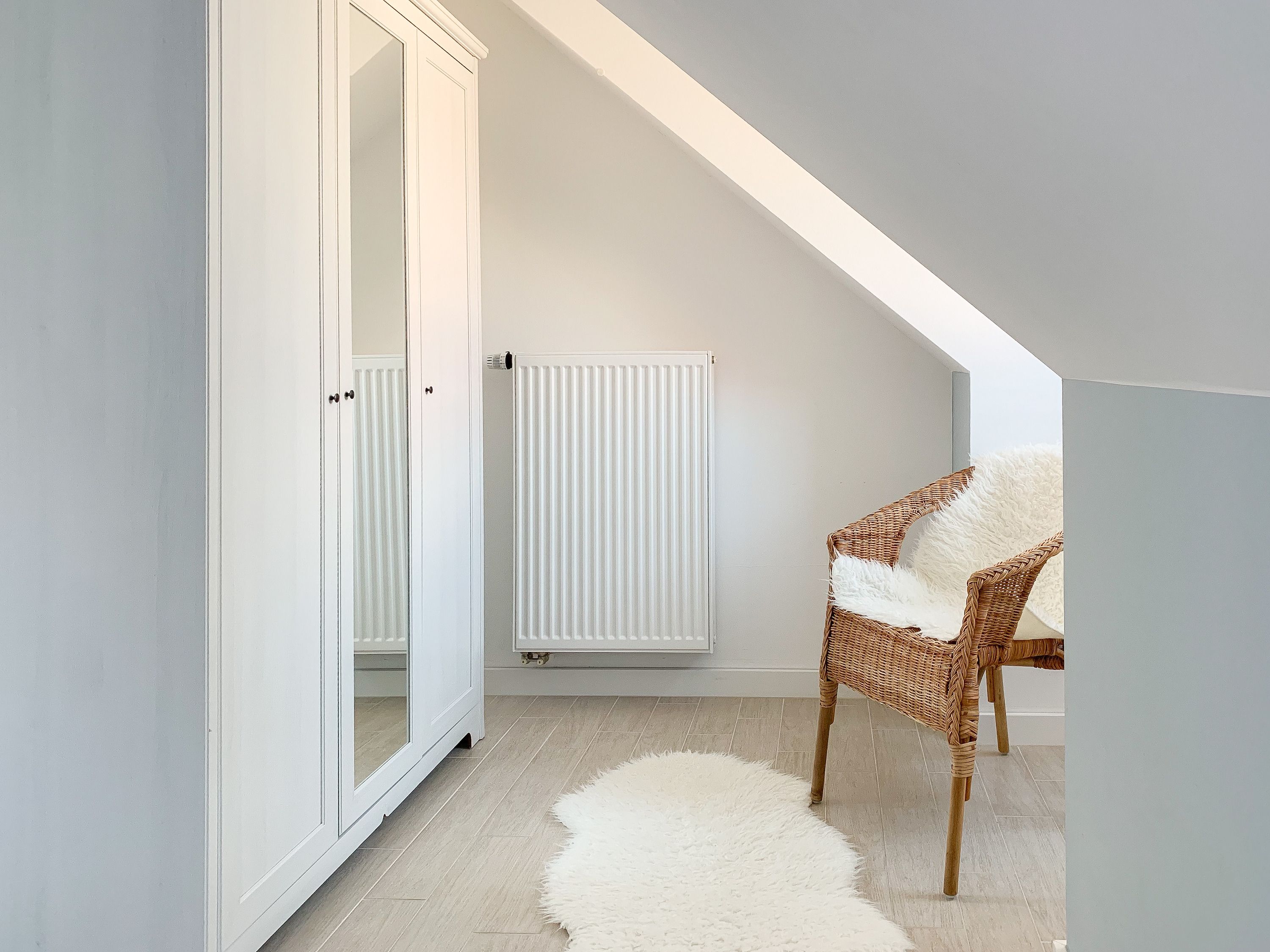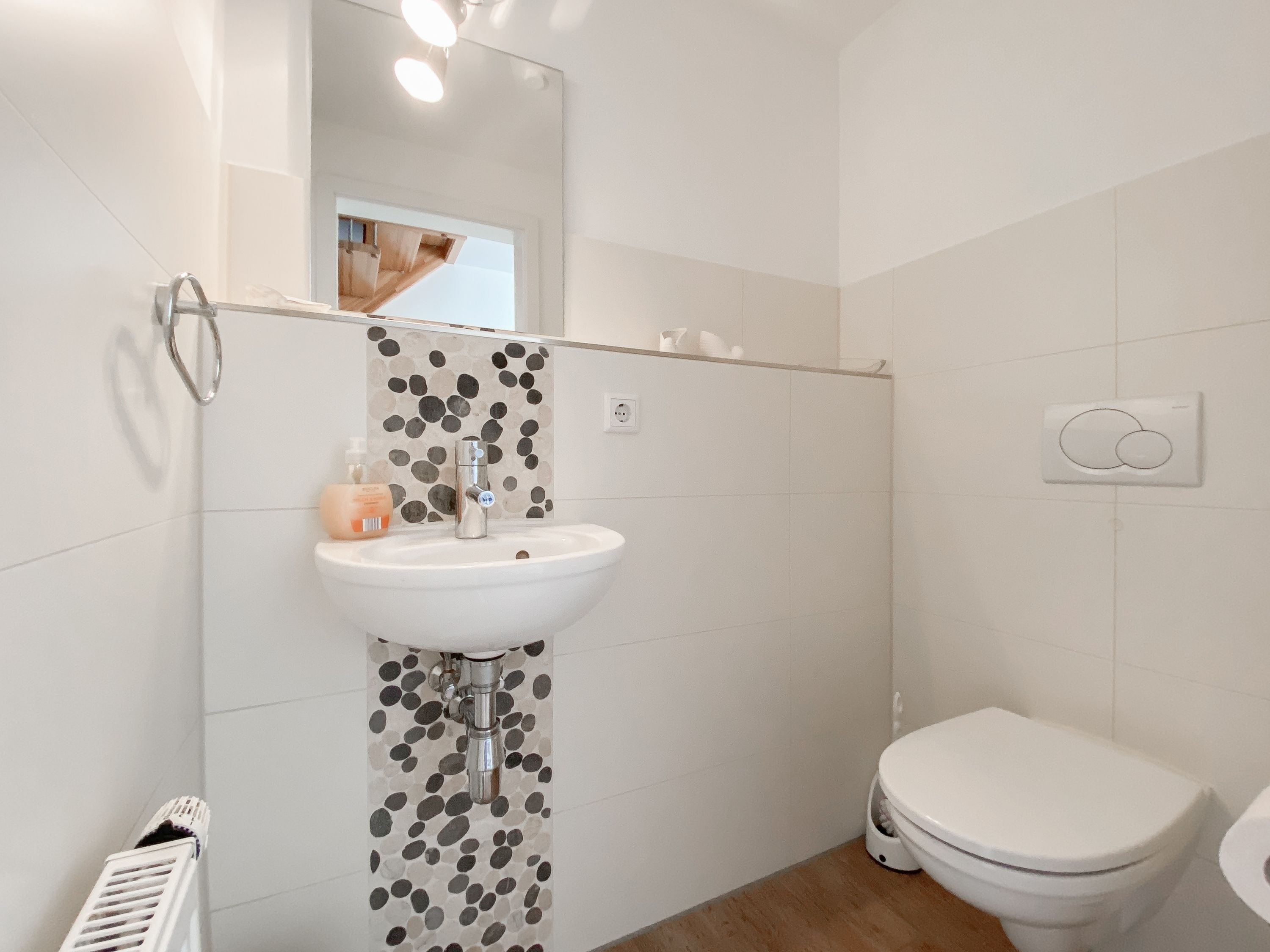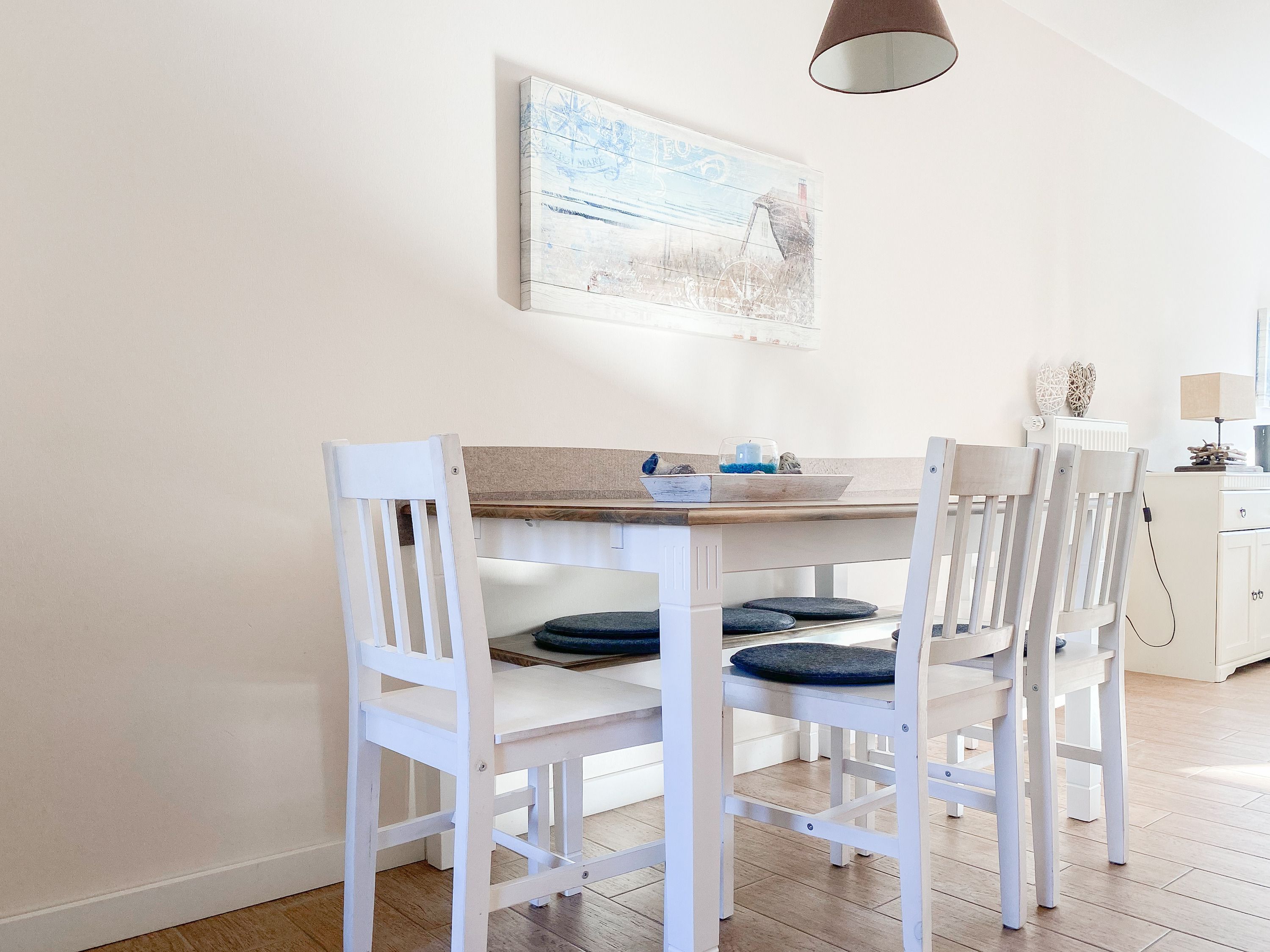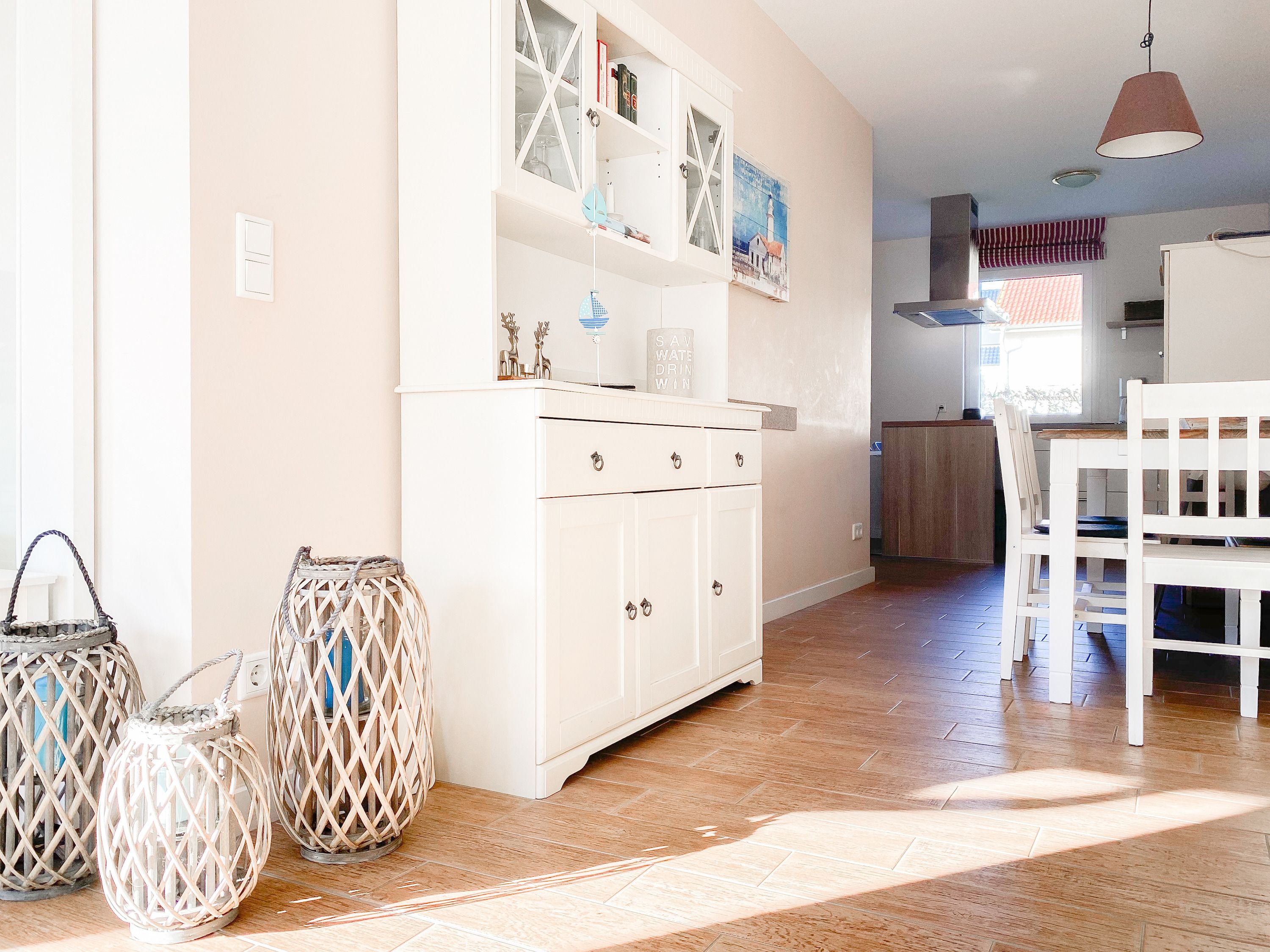 Im Erdgeschoß des Reihenhauses befindet sich der helle, freundliche Wohnraum mit 2 gemütlichen Sofas und Sesseln, die zum Lesen und Spielen einladen. Der Ethanolkamin sorgt für ein noch schöneres Ambiente, besonders in der dunklen Jahreszeit. Das Home-Entertainmentsystem umfasst LCD-TV, Kabel-TV, Radio. LTE-Internet steht Ihnen kostenlos zur Verfügung. Die offene Küche mit 2 Barhockern sowie die Essecke schließen sich an den Wohnbereich an. Induktionskochinsel, Backofen, Geschirrspüler, Kühlschrank mit Gefrierfach sowie eine umfassende Ausstattung lassen nichts vermissen. Der Flur mit Garderobe sowie das Gäste-WC und ein Abstellraum, in dem eine Waschmaschine untergebracht ist, vervollständigen das Erdgeschoss. Das 1. Obergeschoß verfügt über ein Schlafzimmer mit Doppelbett (160x200) und ein großes Kinderzimmer mit 2 Betten (80 x 200 cm) sowie Sofa und großem Spielbereich. Das geräumige Badezimmer ist mit einer Badewanne und Dusche ausgestattet. Im 2. Obergeschoß befindet sich ein Studio, das als Rückzugsort zum Lesen und Arbeiten sowie als weiteres Schlafzimmer, mit Boxspringbett (180x200), genutzt werden kann. Außerdem ist das Studio mit einem Schreibtisch und einem weiteren TV ausgestattet.
