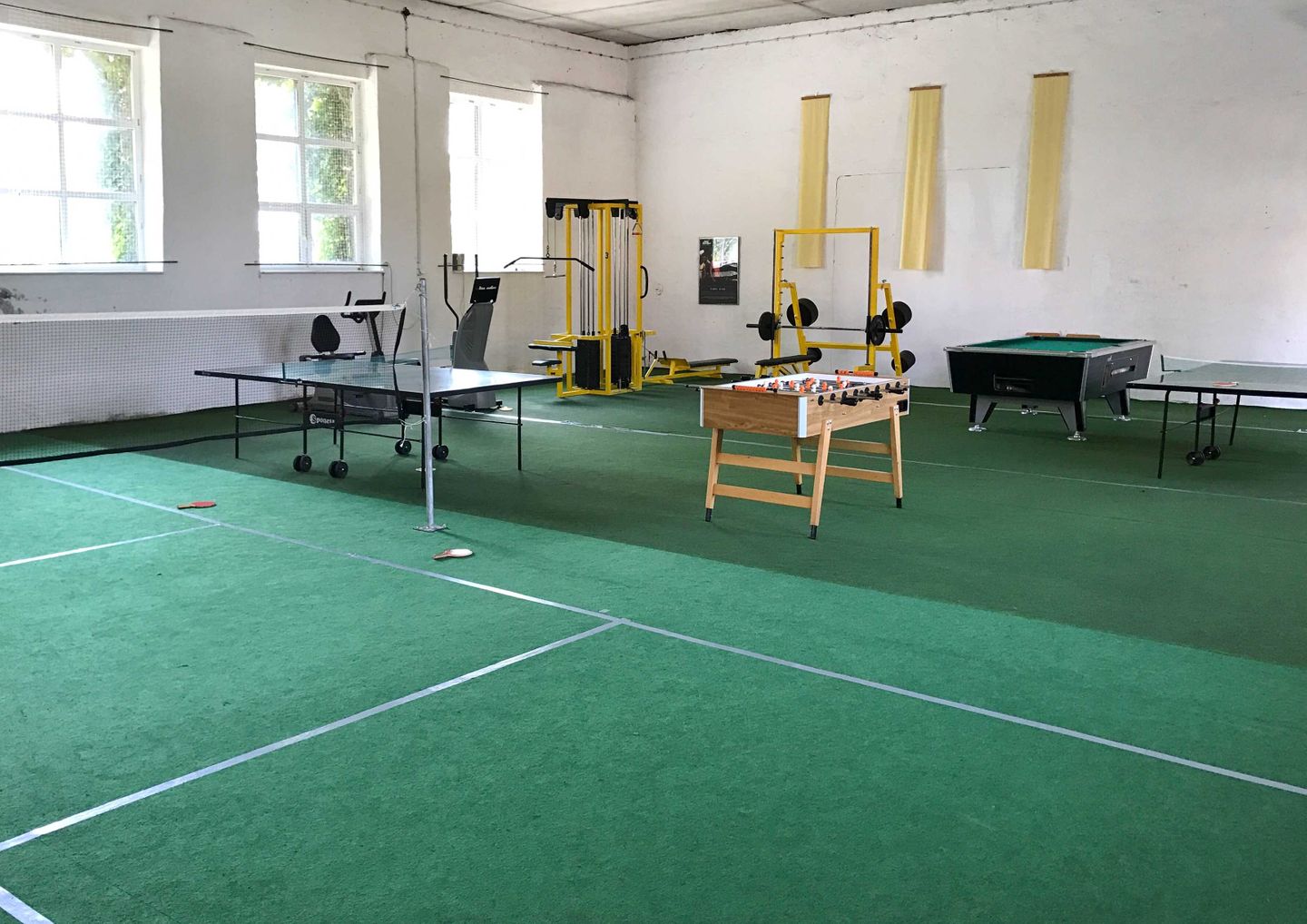 Auf dem großen Grundstück bieten sich zahlreiche Möglichkeiten zum Verweilen. So finden Sie einen überdachten Grillplatz, einen kleinen Spielplatz mit Rutsch, Wippe und Schaukel sowie eine einfache Spiel- und Sporthalle für Spaß und Geselligkeit. Hier haben die Wahl zwischen Fitness, Badminton, Tischtennis, Billard und Tischfußball.