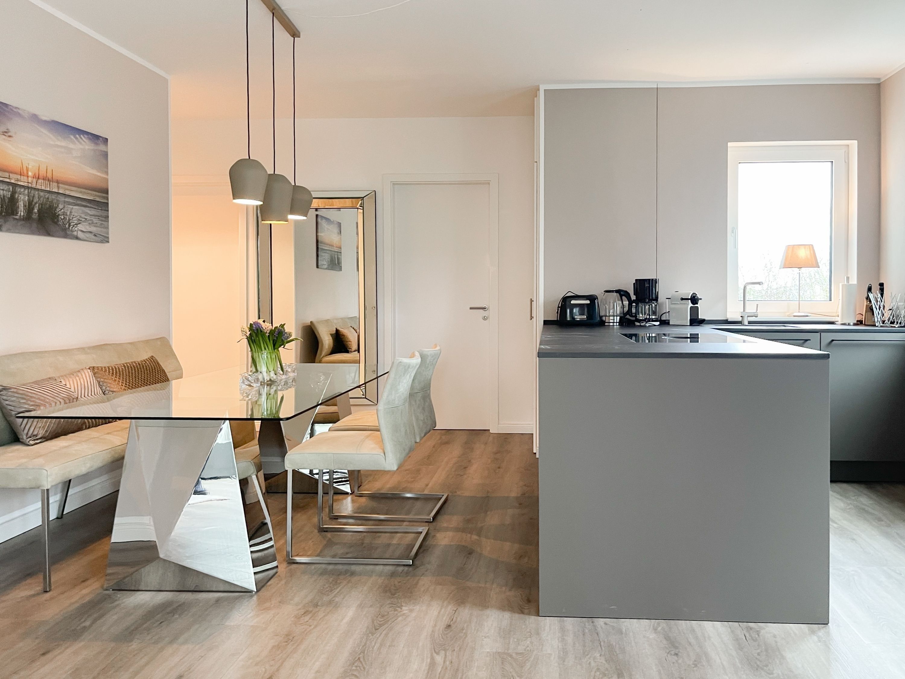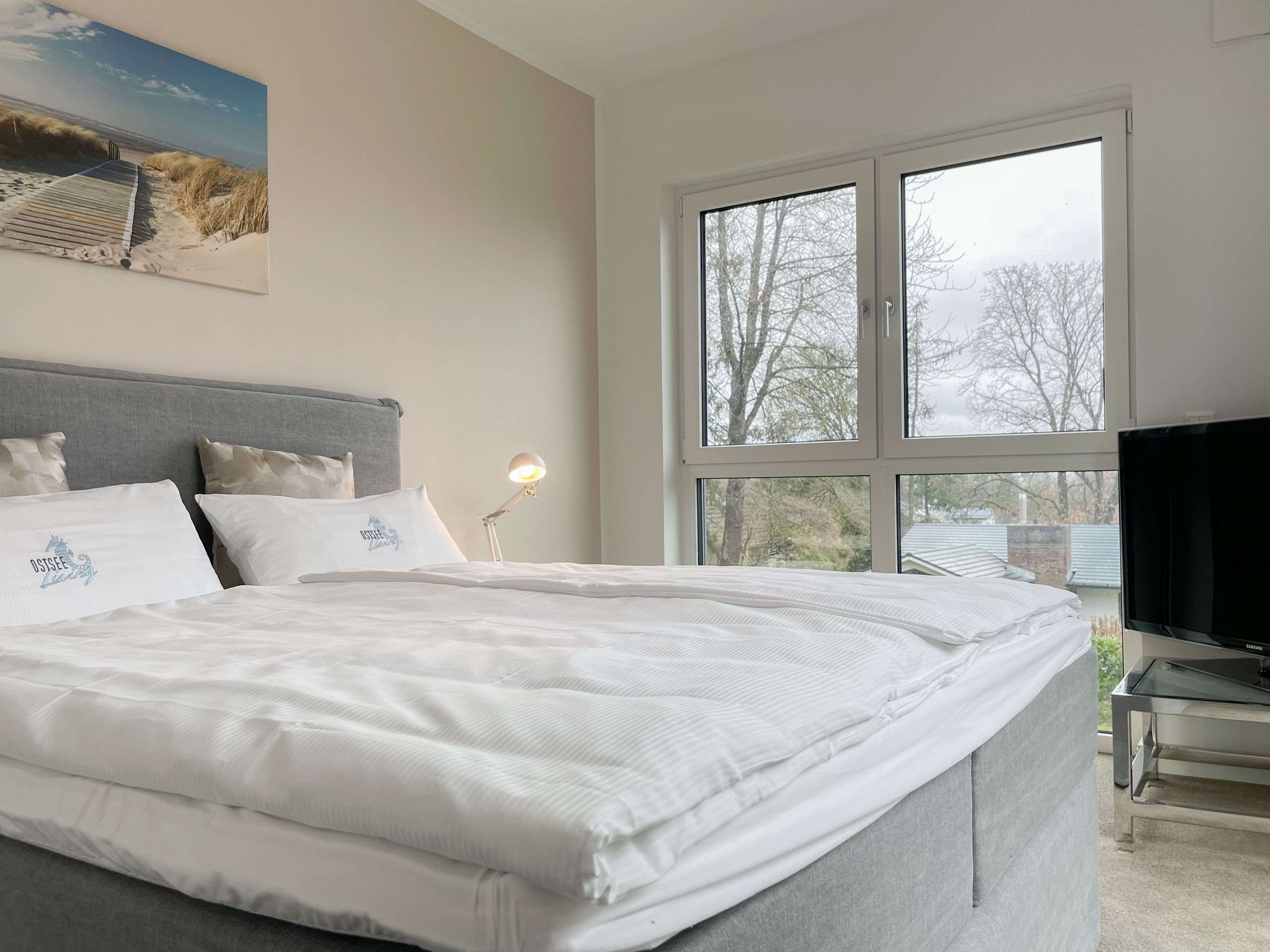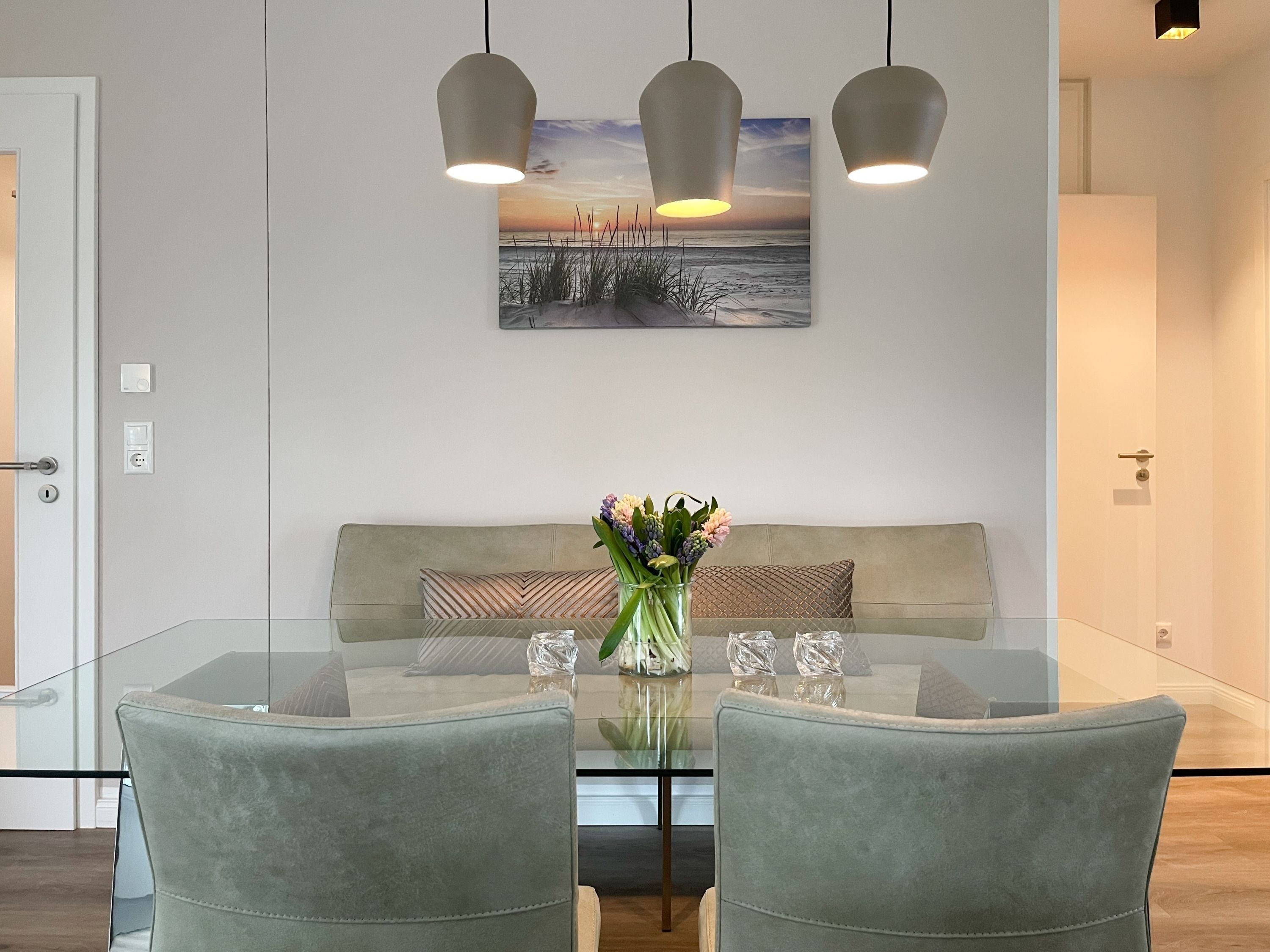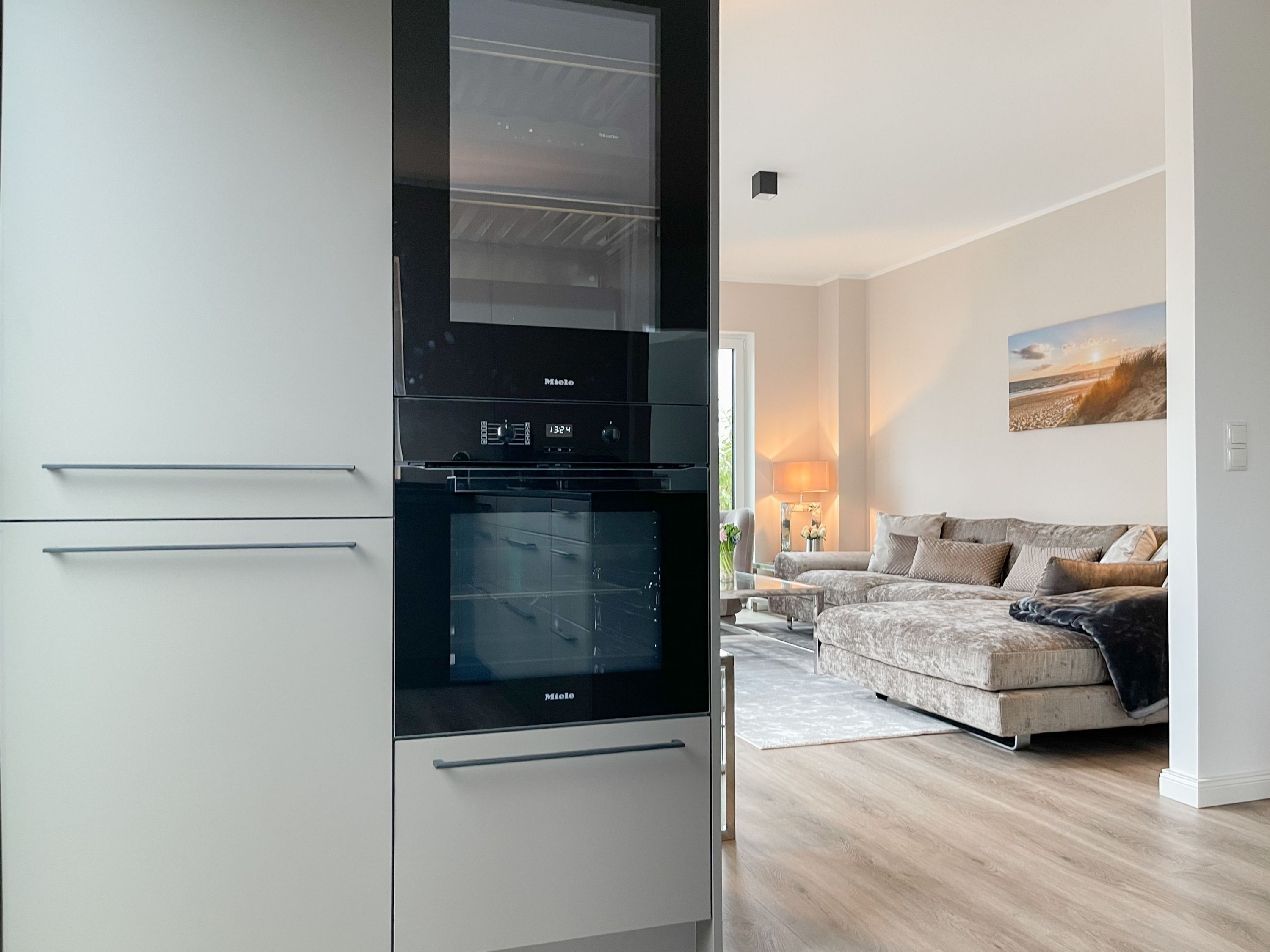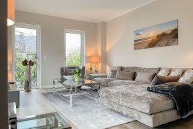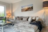 Es erwartet Sie eine äußerst hochwertig ausgestattete und geschmackvoll eingerichtete Ferienwohnung, die mit 2 separaten Schlafzimmern ausreichend Raum für 4 Personen bietet, um einen entspannten Urlaub in einem herrlichen Ambiente zu verleben. Fußbodenheizung, elektrische Außenjalousien und bodentiefe Fensterelemente, die für ein offenes Raumgefühl sorgen, gewährleisten einen hohen Wohnstandard. Mittelpunkt der Ferienwohnung bildet die Siematic Design Küche mit Kochinsel in bester Ausstattung, die zum gemeinsamen Kochen einlädt und der anschließende Essbereich im Hampton Style. Der behagliche Wohnbereich, eingerichtet mit Sofa und TV, bietet Blick und Zugang auf die großzügig angelegte Südostterrasse mit Gartenmöbeln und Sonnenliegen, um den Tag bei einem Glas Wein mit Ostseeblick ausklingen zu lassen. Beide Schlafzimmer bieten einen herrlichen Ausblick bis auf  das Meer und sind mit hochwertigem Teppichboden, Doppelbetten (180x200)  und einem Kleiderschrank ausgestattet. Eines der Schlafzimmer ist zusätzlich mit einem TV ausgestattet. Im Flur des Eingangsbereichs befindet sich ein weiterer Einbauschrank zum Unterbringen von Jacken Mänteln. Das Bad ist sehr hochwertig und modern, ausgestattet mit einer XXL Walk In Dusche. Waschmaschine und Trockner befinden sich in einem Einbauschrank. WLAN steht selbstverständlich zur kostenlosen Nutzung zur Verfügung.
