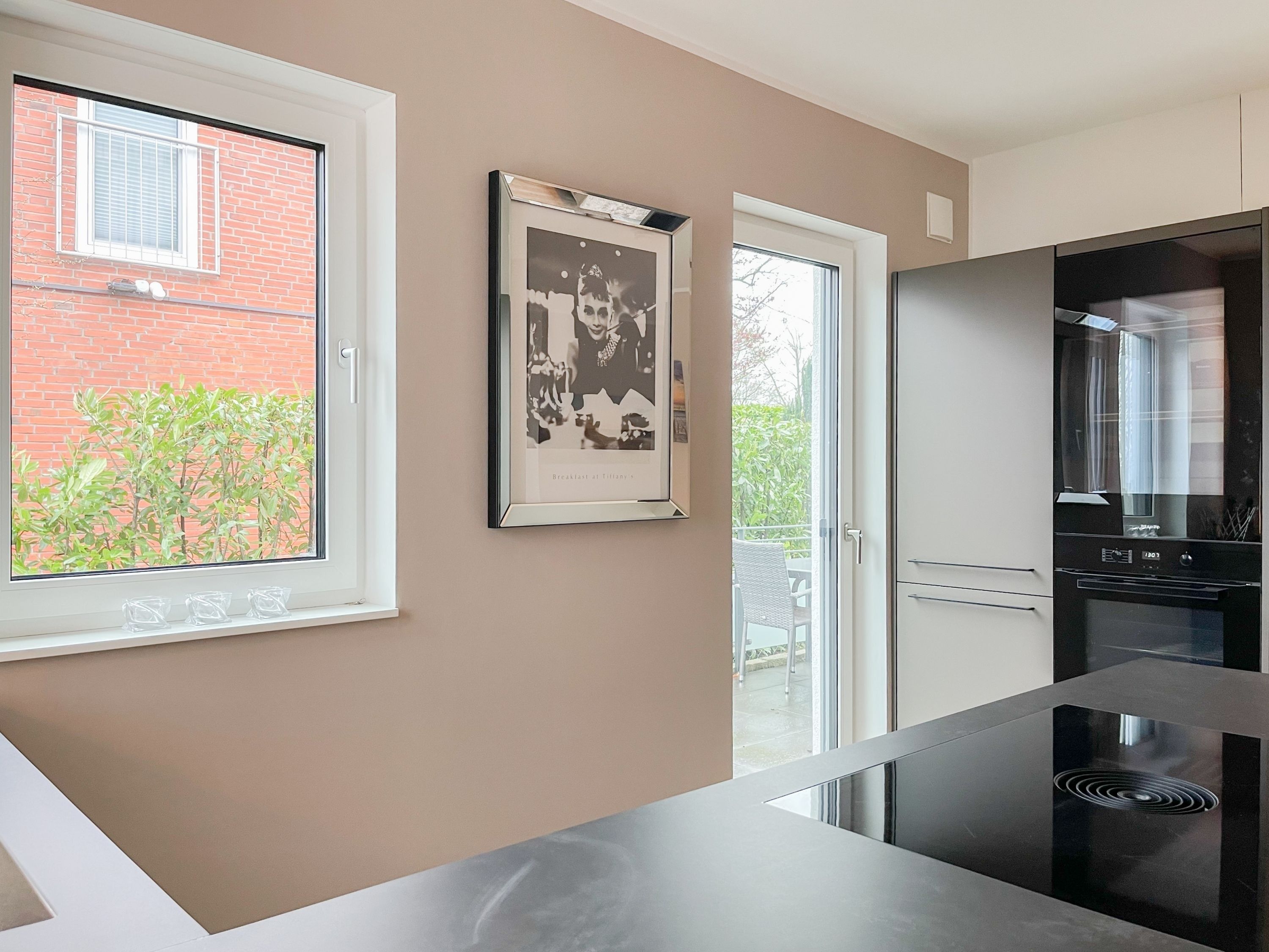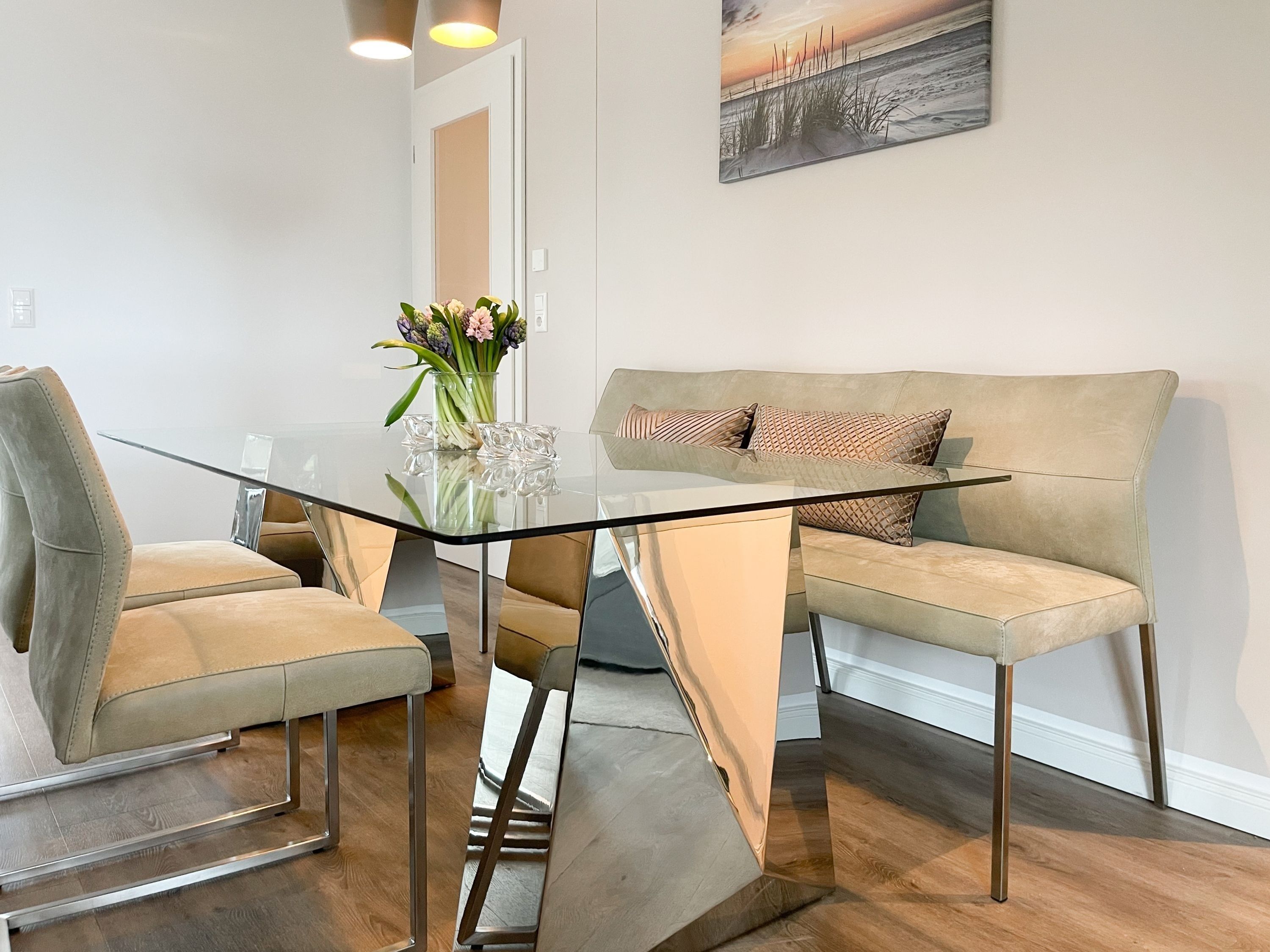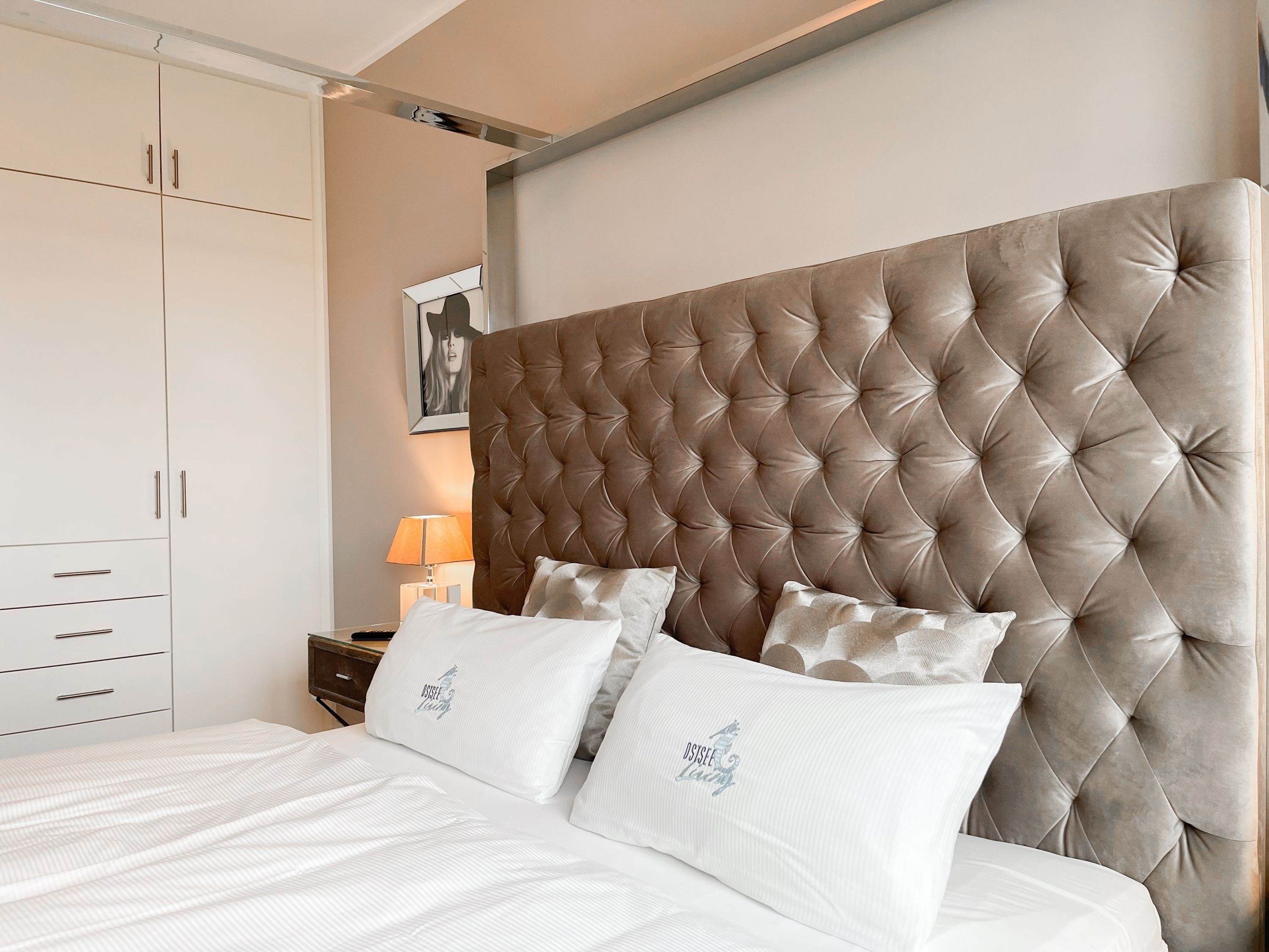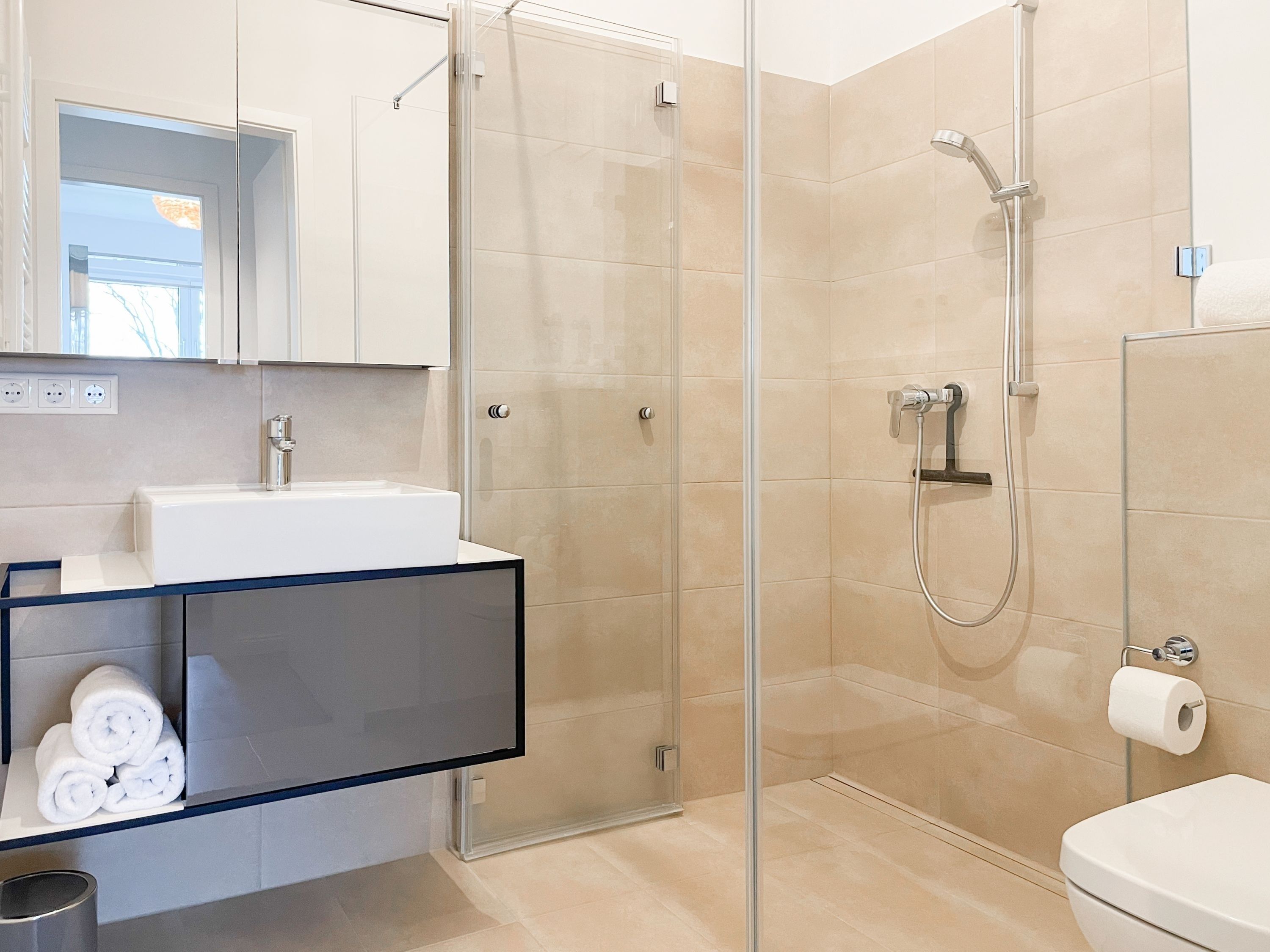 Es erwartet Sie eine äußerst hochwertig ausgestattete und geschmackvoll eingerichtete Ferienwohnung, die mit 2 separaten Schlafzimmern ausreichend Raum für 4 Personen bietet, um einen entspannten Urlaub in einem herrlichen Ambiente zu verleben. Fußbodenheizung, elektrische Außenjalousien und bodentiefe Fensterelemente, die für ein offenes Raumgefühl sorgen, gewährleisten einen hohen Wohnstandard. Mittelpunkt der Ferienwohnung bildet die Siematic Design Küche mit Kochinsel in bester Ausstattung, die zum gemeinsamen Kochen einlädt und der anschließende Essbereich im Hampton Style. Der behagliche Wohnbereich, eingerichtet mit Sofa und TV, bietet Blick und Zugang auf die großzügig angelegte Südostterrasse mit Gartenmöbeln und Sonnenliegen, um den Tag bei einem Glas Wein mit Ostseeblick ausklingen zu lassen. Beide Schlafzimmer bieten einen herrlichen Ausblick bis auf  das Meer und sind mit hochwertigem Teppichboden, Doppelbetten (180x200)  und einem Kleiderschrank ausgestattet. Eines der Schlafzimmer ist zusätzlich mit einem TV ausgestattet. Im Flur des Eingangsbereichs befindet sich ein weiterer Einbauschrank zum Unterbringen von Jacken Mänteln. Das Bad ist sehr hochwertig und modern, ausgestattet mit einer XXL Walk In Dusche. Waschmaschine und Trockner befinden sich in einem Einbauschrank. WLAN steht selbstverständlich zur kostenlosen Nutzung zur Verfügung.