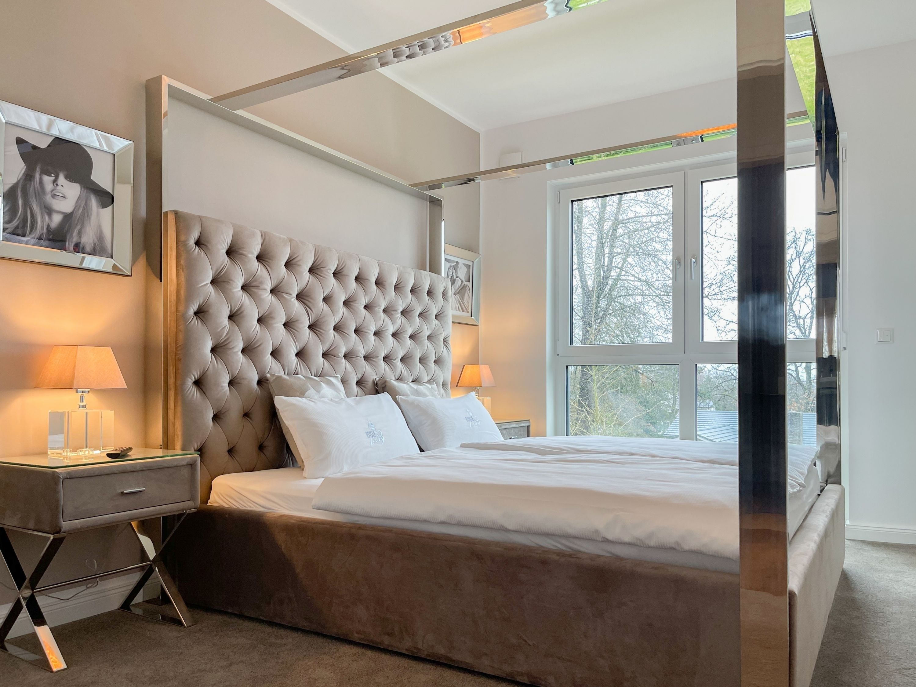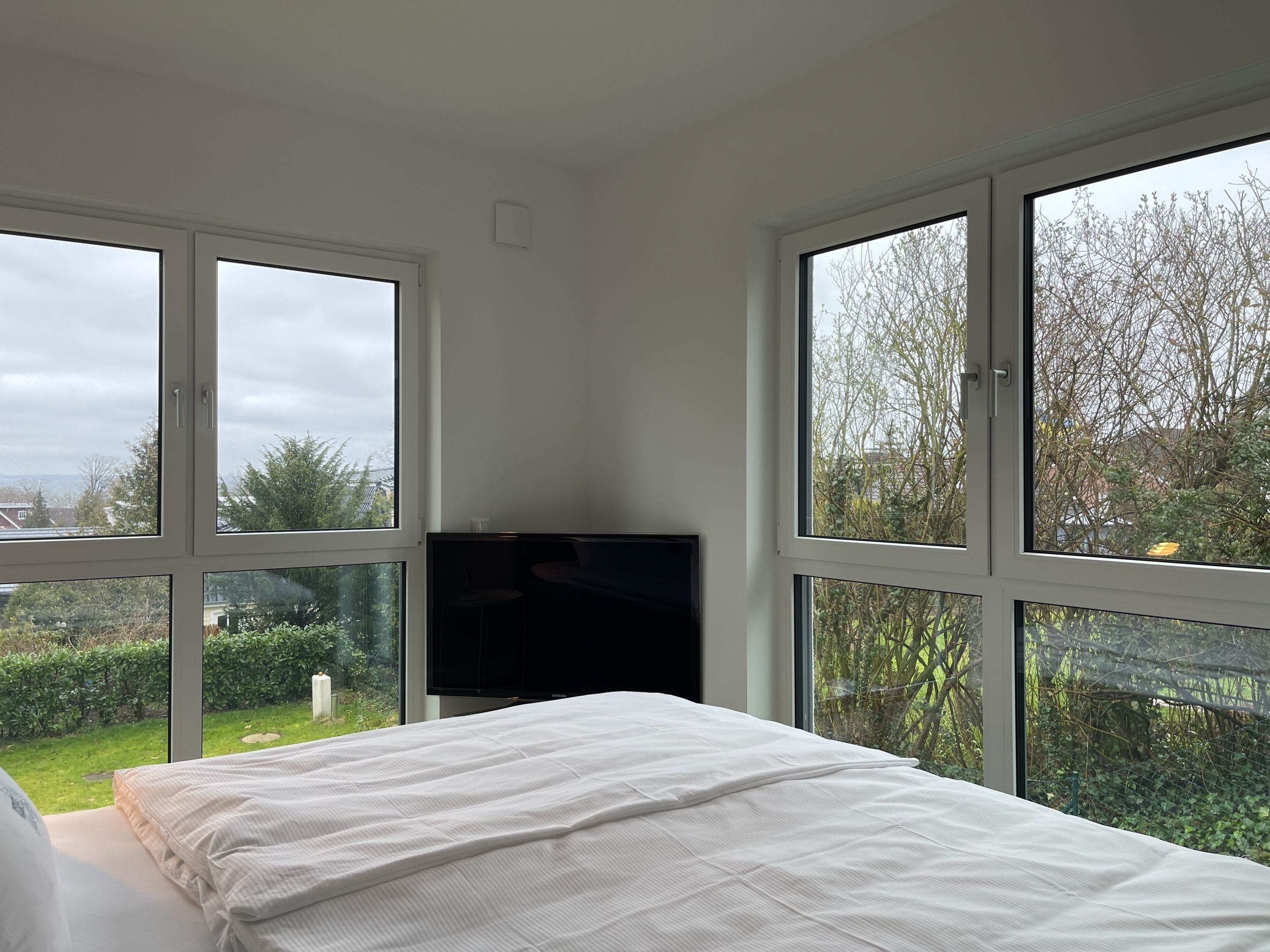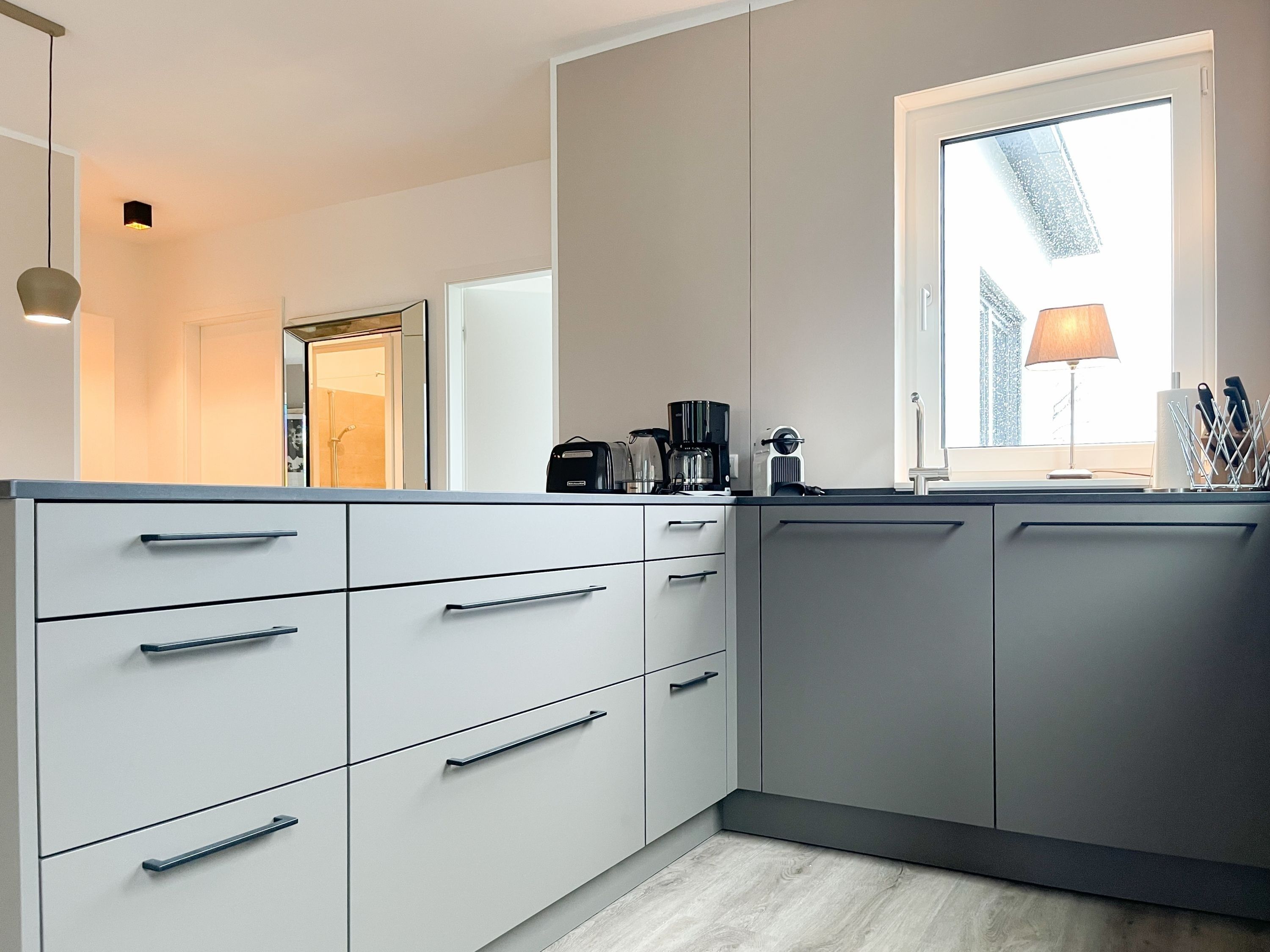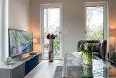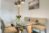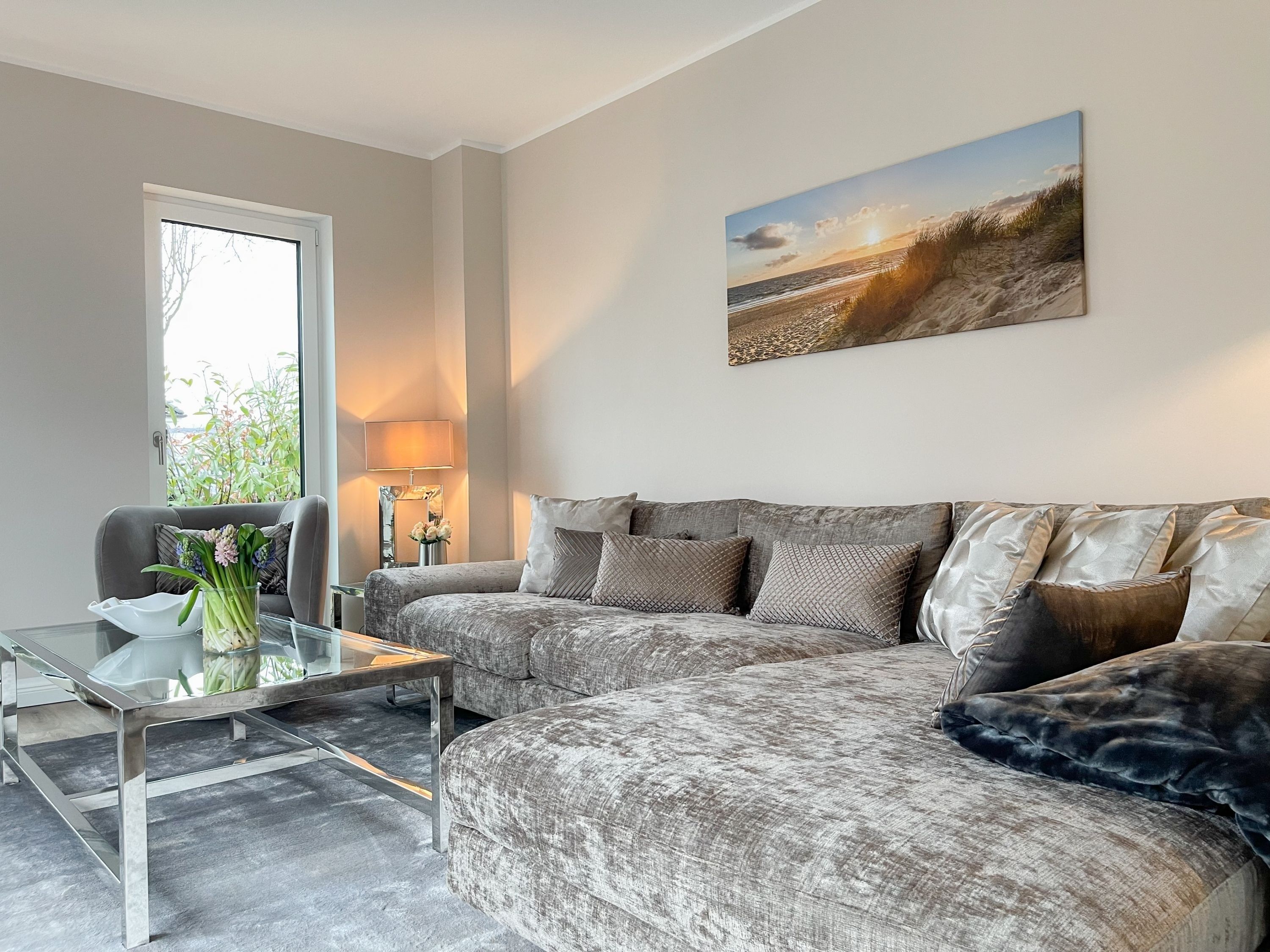 Es erwartet Sie eine äußerst hochwertig ausgestattete und geschmackvoll eingerichtete Ferienwohnung, die mit 2 separaten Schlafzimmern ausreichend Raum für 4 Personen bietet, um einen entspannten Urlaub in einem herrlichen Ambiente zu verleben. Fußbodenheizung, elektrische Außenjalousien und bodentiefe Fensterelemente, die für ein offenes Raumgefühl sorgen, gewährleisten einen hohen Wohnstandard. Mittelpunkt der Ferienwohnung bildet die Siematic Design Küche mit Kochinsel in bester Ausstattung, die zum gemeinsamen Kochen einlädt und der anschließende Essbereich im Hampton Style. Der behagliche Wohnbereich, eingerichtet mit Sofa und TV, bietet Blick und Zugang auf die großzügig angelegte Südostterrasse mit Gartenmöbeln und Sonnenliegen, um den Tag bei einem Glas Wein mit Ostseeblick ausklingen zu lassen. Beide Schlafzimmer bieten einen herrlichen Ausblick bis auf  das Meer und sind mit hochwertigem Teppichboden, Doppelbetten (180x200)  und einem Kleiderschrank ausgestattet. Eines der Schlafzimmer ist zusätzlich mit einem TV ausgestattet. Im Flur des Eingangsbereichs befindet sich ein weiterer Einbauschrank zum Unterbringen von Jacken Mänteln. Das Bad ist sehr hochwertig und modern, ausgestattet mit einer XXL Walk In Dusche. Waschmaschine und Trockner befinden sich in einem Einbauschrank. WLAN steht selbstverständlich zur kostenlosen Nutzung zur Verfügung.