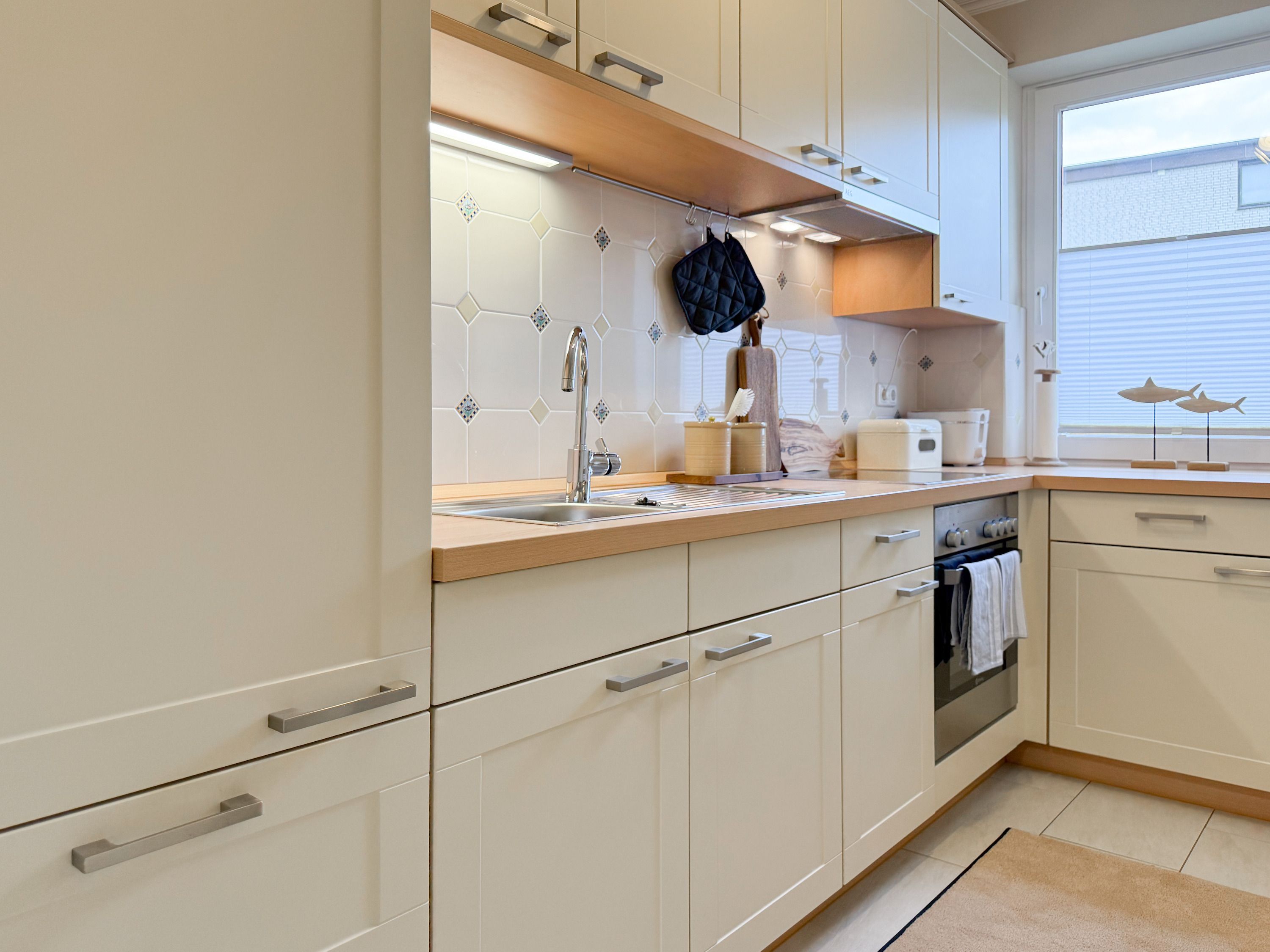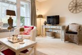 Die äußerst liebevoll und geschmackvoll gestaltete Ferienwohnung bietet Ihnen einen behaglichen Rückzugsort für entspannte Urlaubstage, ohne auf den typischen Charme und die lebendige Lebensart von Timmendorfer Strand zu verzichten. Dank durchdachter Raumaufteilung, hochwertiger Materialien und liebevoller Details entfaltet sich von der ersten Sekunde an eine warme, einladende Atmosphäre, in der Sie sich sofort wie zu Hause fühlen können. Es erwartet Sie ein schöner Wohnbereich, der mit einem Sofa, einem Sessel und TV ausgestattet ist. Der integrierte Essbereich ist großzügig und sehr gemütlich mit Korbsesseln eingerichtet. Genießen Sie sonnige Stunden auf der großzügigen Südwestterrasse, die mit einer Markise sowie Gartenmöbeln ausgestattet ist. Ob frühmorgendlicher Kaffee, ruhige Nachmittage mit einem guten Buch oder ein Glas Wein unter freiem Himmel – hier finden Sie den perfekten Ort, um den Tag in der Sonne in vollen Zügen zu genießen. Die separate Küche ist bestens ausgestattet, damit Sie bequem kochen und genießen können – hier finden Sie alles, was Sie brauchen. Das Schlafzimmer verfügt über ein Doppelbett (180x200), zwei große Kleiderschränke mit reichlich Stauraum, die Fenster lassen sich durch spezielle Vorhänge verdunkeln. Das Bad ist mit Waschtisch, Dusche, WC und Handtuchtrockner ausgestattet. Ein praktischer Abstellraum befindet sich im Flurbereich.