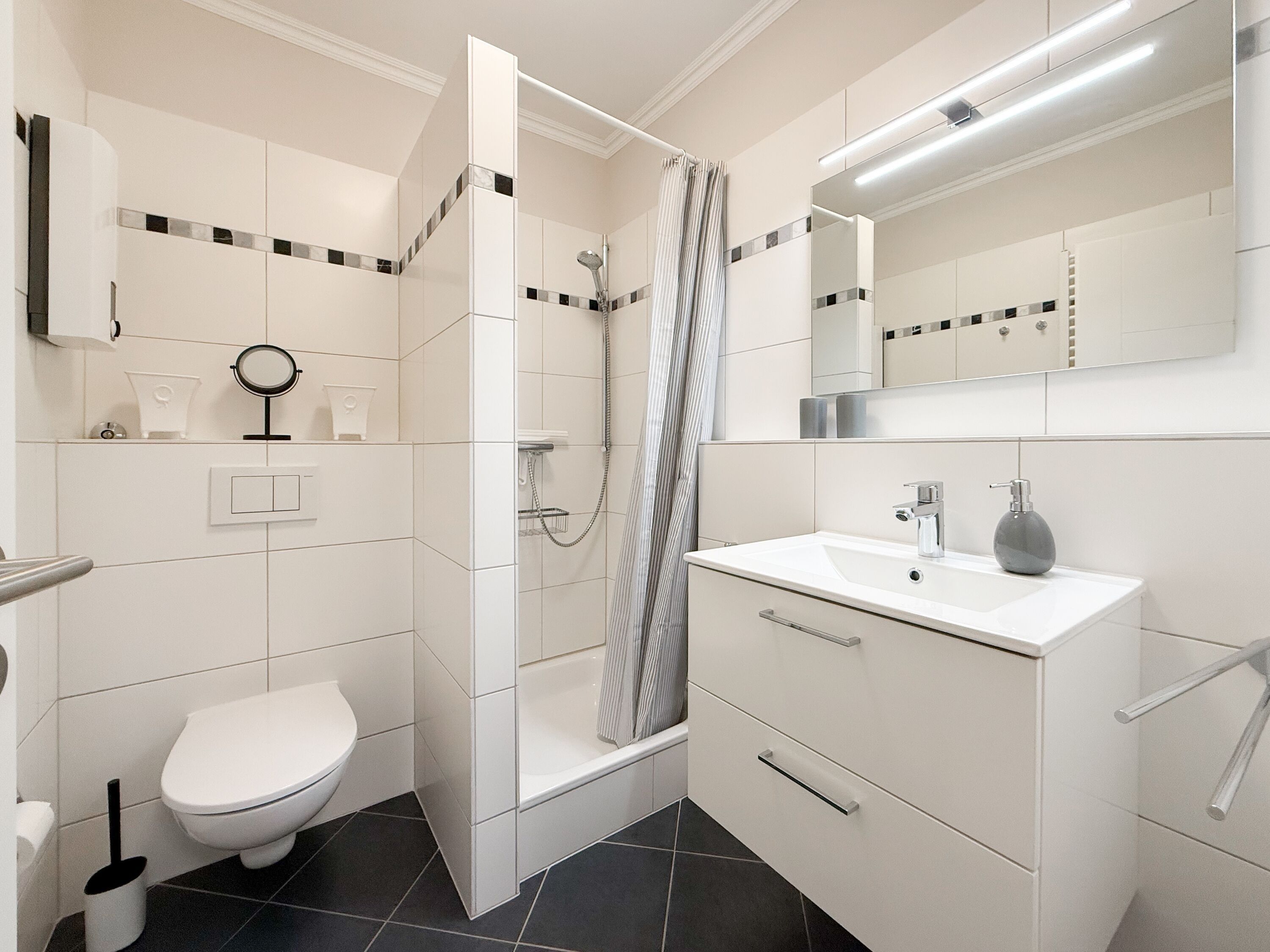 Kostenloser Internetzugang über WLAN steht selbstverständlich zur Verfügung. Ein Tiefgaragenstellplatz (Einfahrtshöhe 1,80m) ist inklusive. Fest verankerte Fahrradständer befinden sich direkt vor dem Haus. Waschmaschine und Trockner (Münzgeräte) befinden sich im Gemeinschaftskeller.