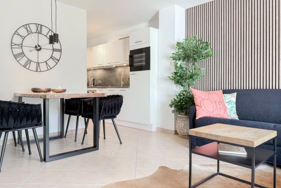 Die hochwertig eingerichtete und bestens ausgestattete Ferienwohnung eignet sich ideal für 3 Personen, die ihren Urlaub in stilvollem Ambiente genießen möchten. Die Terrassenwohnung mit separatem Eingang liegt am Rand der gepflegten Wohnanlage Gorch Fock Park und garantiert Ruhe sowie Privatsphäre. Der Wohnbereich überzeugt durch ein komfortables Sofa mit Schlaffunktion, Smart-TV und Bluetooth-Radio. Der anschließende Essbereich bietet ausreichend Platz, und die offene, neu integrierte Küche fügt sich harmonisch in den Raum ein. Sie ist unter anderem mit Weinkühlschrank, Spülmaschine, Backofen, Induktionsherd, Gefriermöglichkeit und vielem mehr ausgestattet. Genießen Sie sonnige Stunden auf der Südterrasse, die mit einer elektrischen Markise sowie Gartenmöbeln ausgestattet ist.