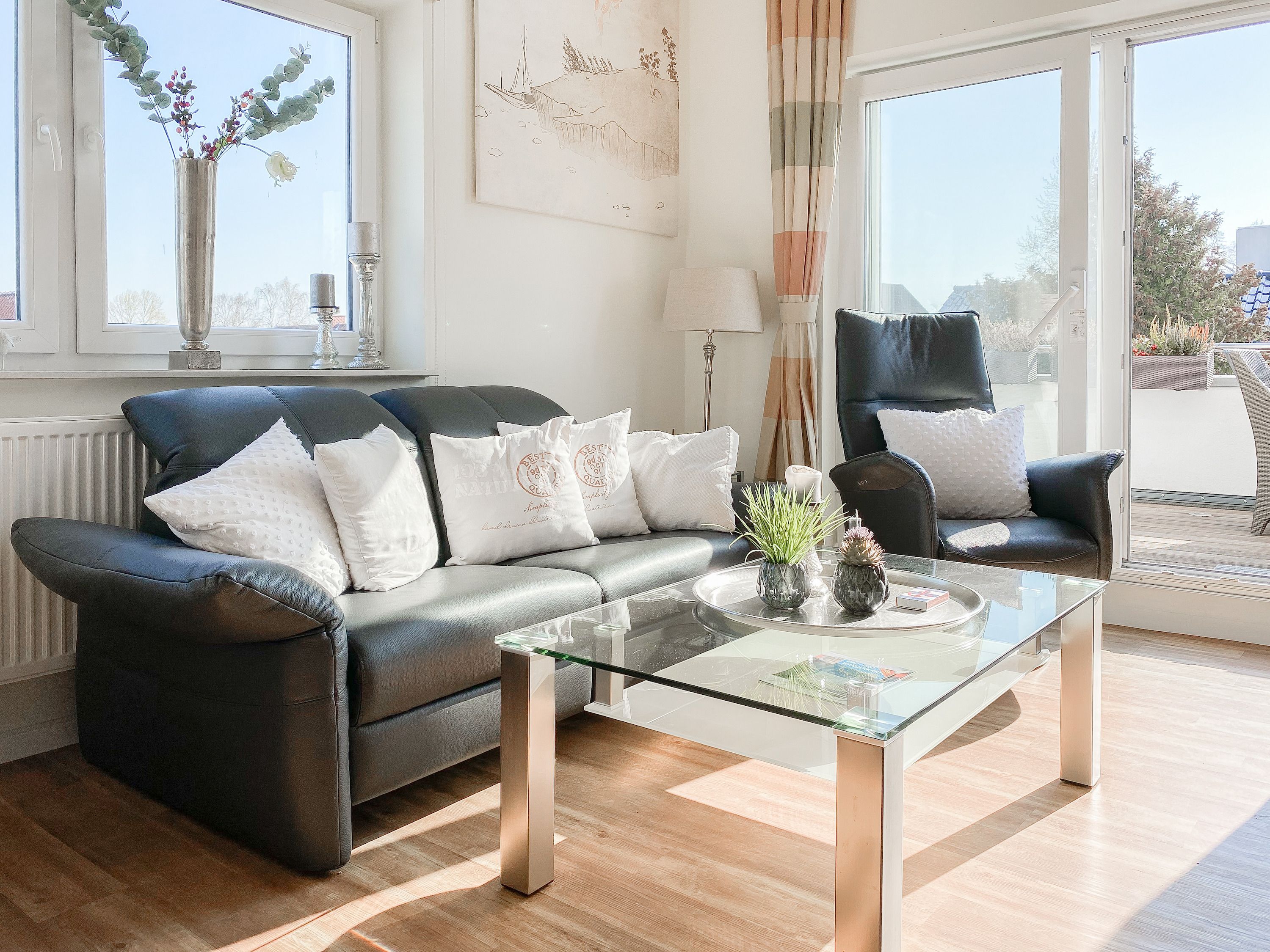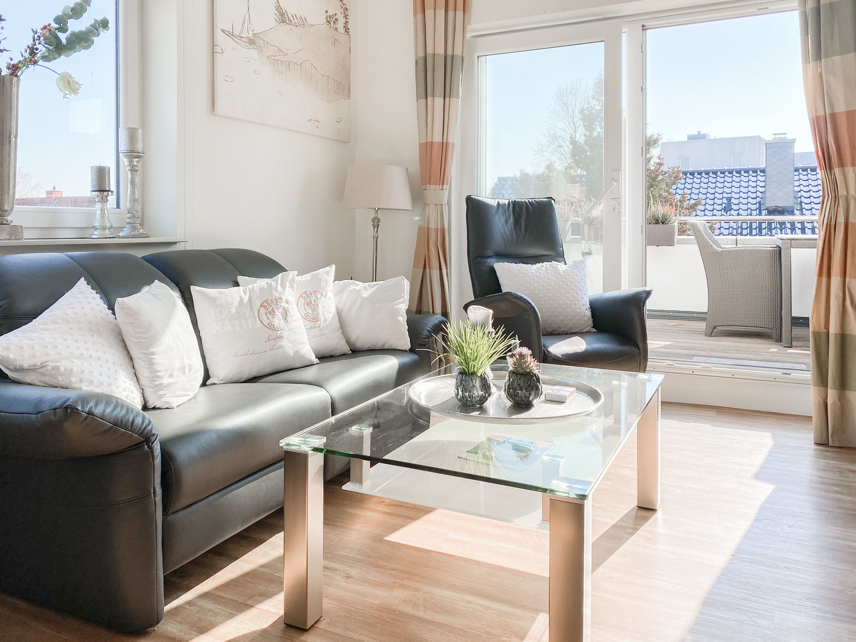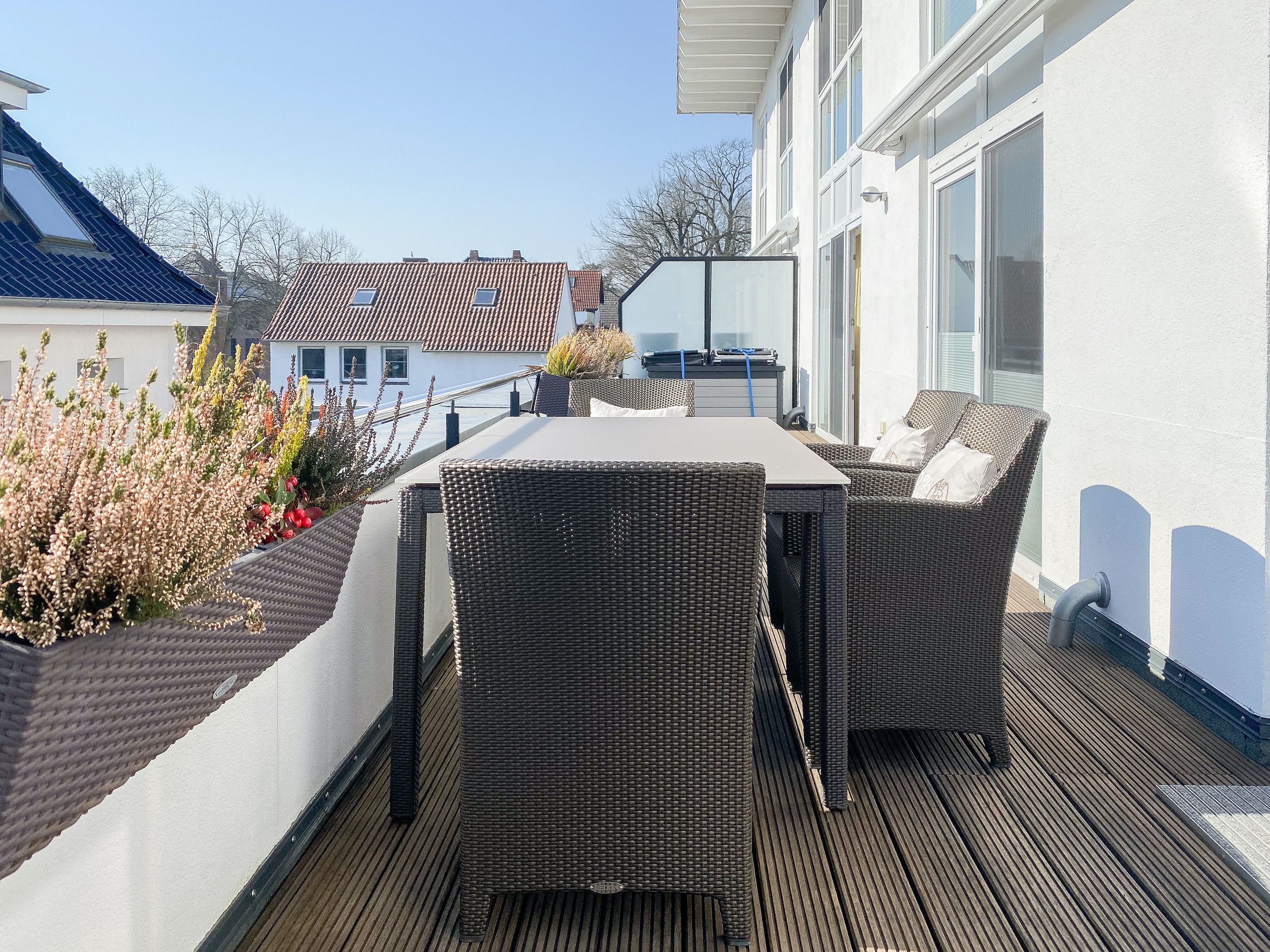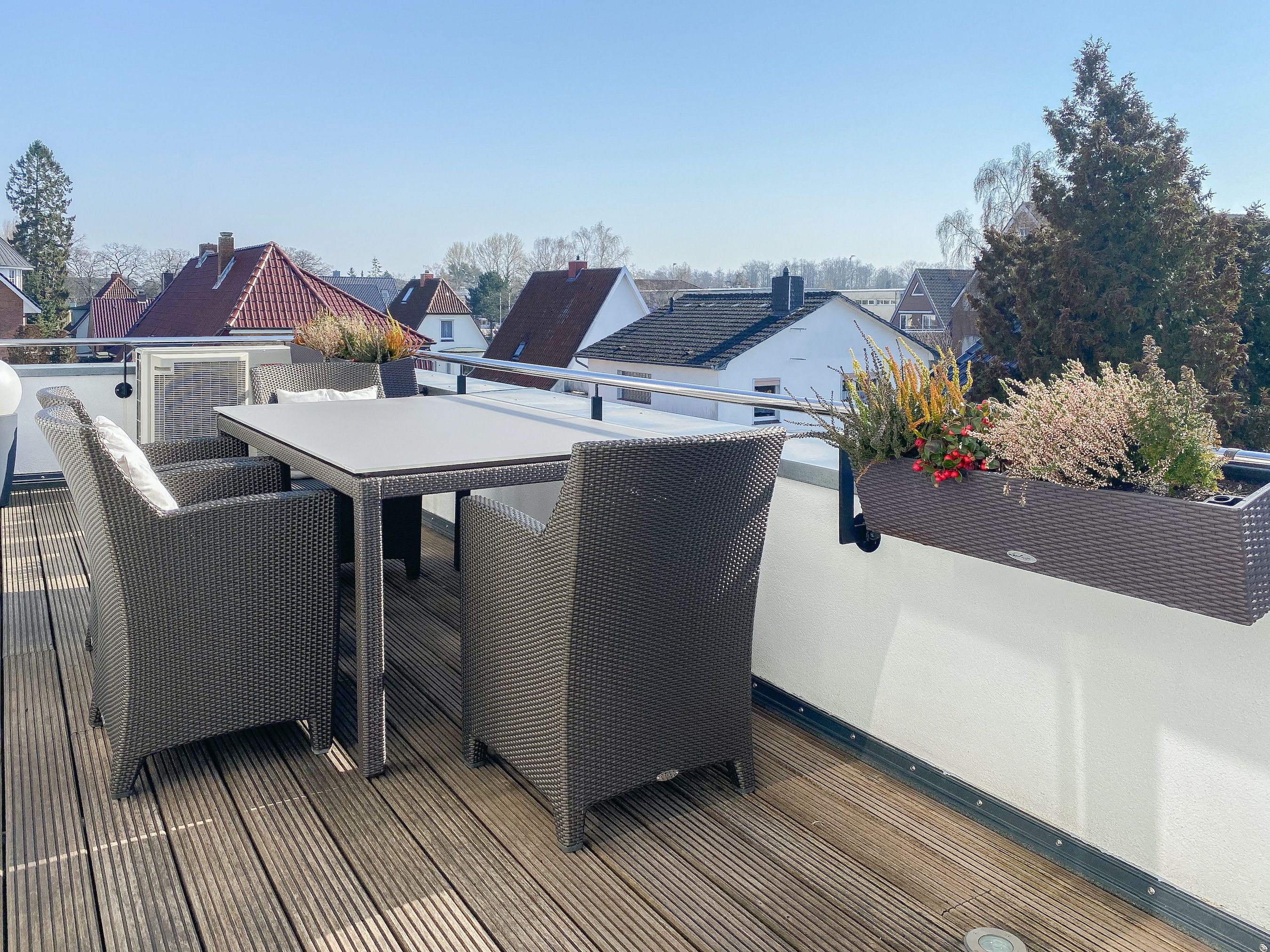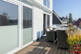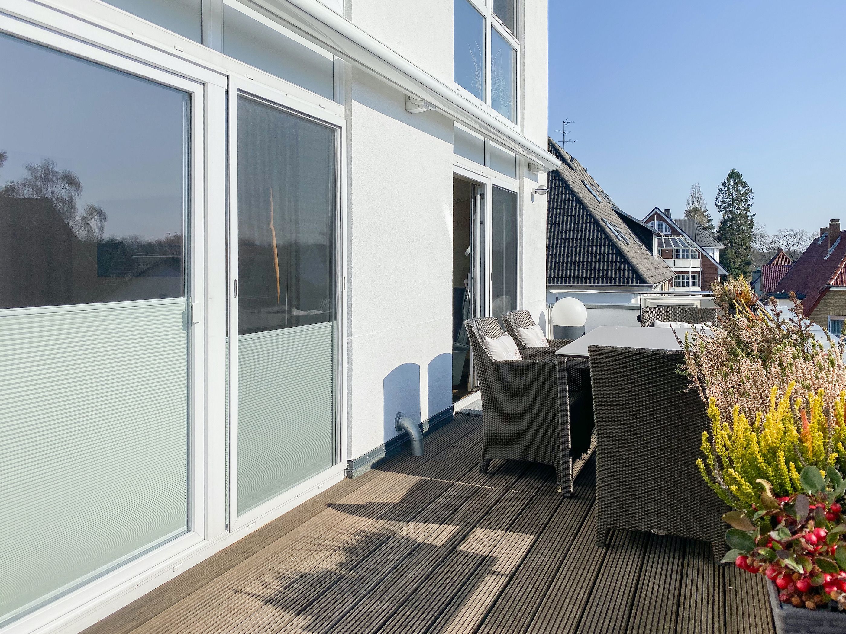 Das bestens ausgestattete Penthouse präsentiert sich als lichtdurchflutetes Loft über 2 Ebenen und bietet auf 100 qm Wohnfläche mit 3 Schlafzimmern und 2 Bädern ausreichend Raum für 6 Personen. Verbringen Sie zwanglose Urlaubstage auf der riesigen Dachterrasse in Südausrichtung, die mit Gartenmöbeln, Sonnenliegen und einer elektrischen Markise ausgestattet ist oder entspannen Sie in der großzügig angelegten Sauna, die auf der zweiten Wohnebene untergebracht ist. Eine Klimaanlage und Insektenschutzgitter sorgen zu jeder Jahreszeit für erholsamen Schlaf. Den Mittelpunkt des Objektes bildet der großzügige Wohn- Essbereich mit vielen Fenstern und äußerst hohen Decken sowie die offene, perfekt ausgestattete Küche. Zwei separate Schlafzimmer (Doppelbett 160x200 und Einzelbett mit Auszug) und ein äußerst hochwertig ausgestattetes Bad mit Walk In Dusche und Badewanne sind ebenfalls auf der unteren Ebene untergebracht. Das dritte Schlafzimmer (Doppelbett 180x200), ein weiteres Duschbad mit integriertem Waschtrockner und die Sauna sind über eine Treppe vom Wohnbereich zu erreichen. Alle Schlafzimmer sind mit einem TV und Verdunkelungsvorhängen ausgestattet. Insgesamt 4 TV, Radio, Bluetooth und WLAN gehören zum Entertainment-Paket. Ein fester PKW Stellplatz befindet sich auf dem Grundstück.