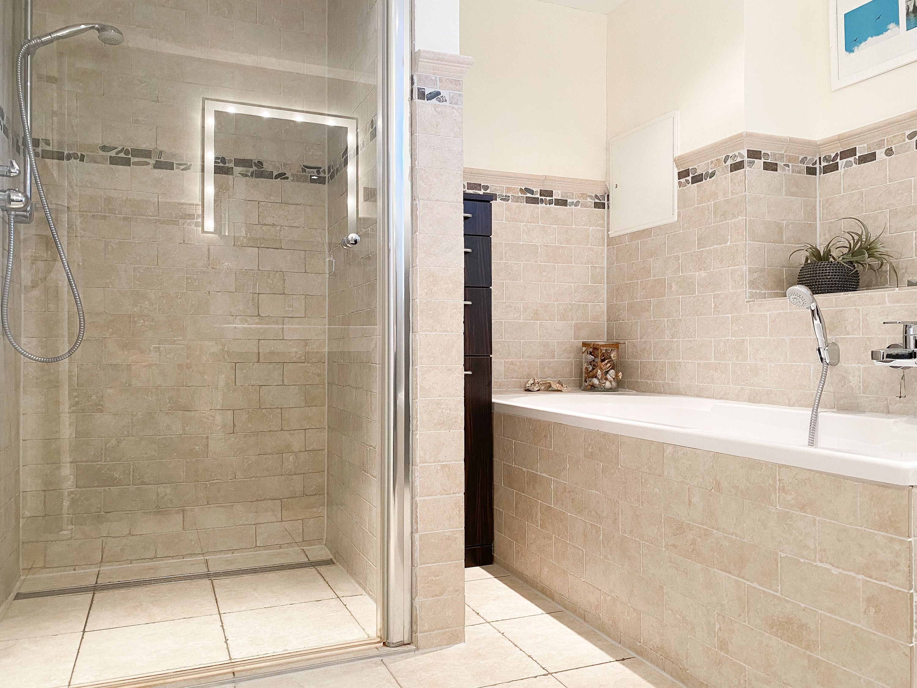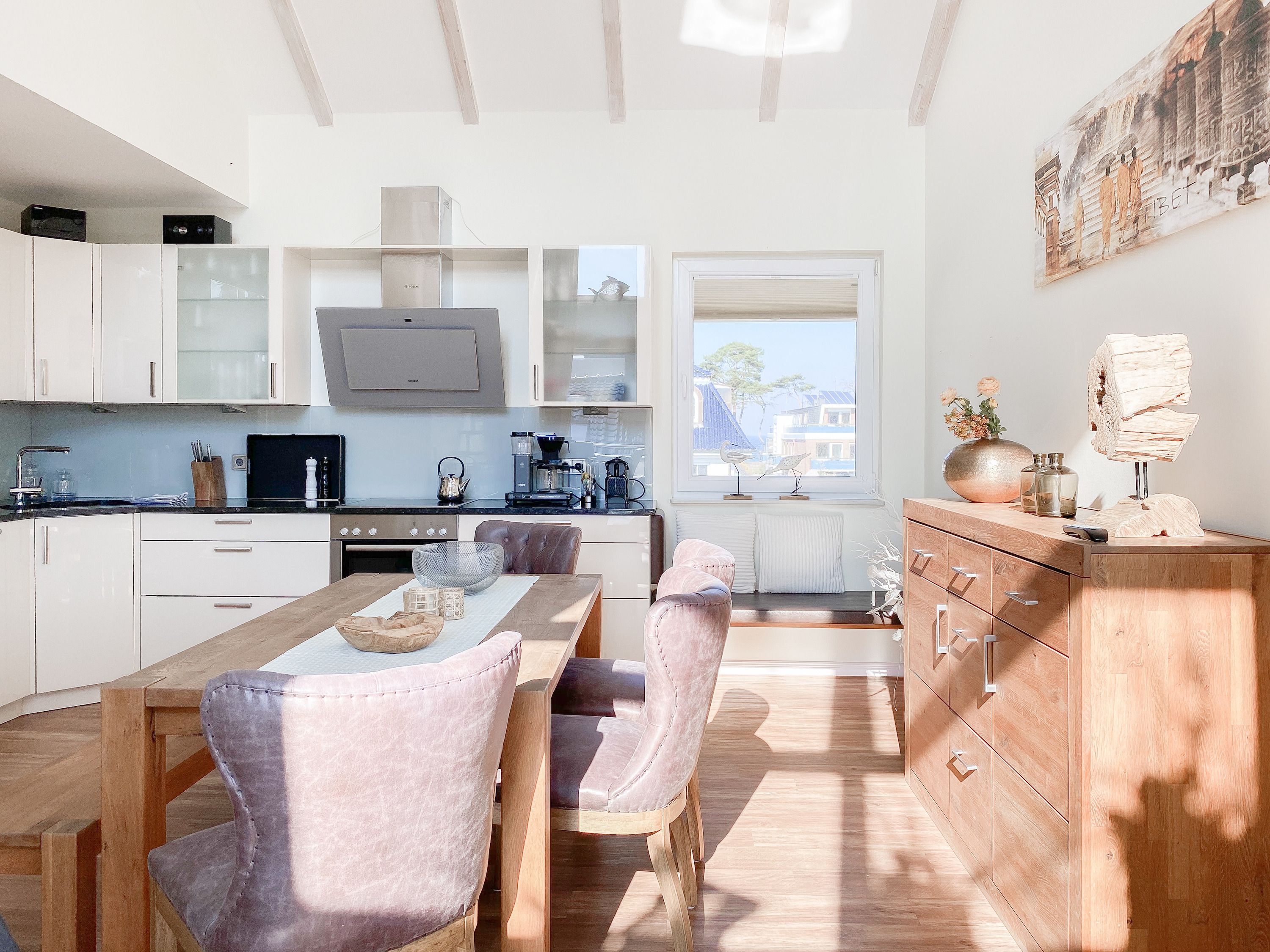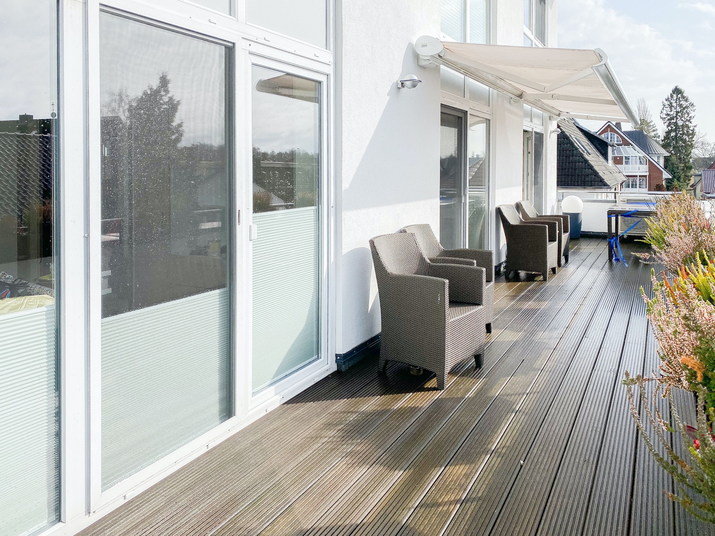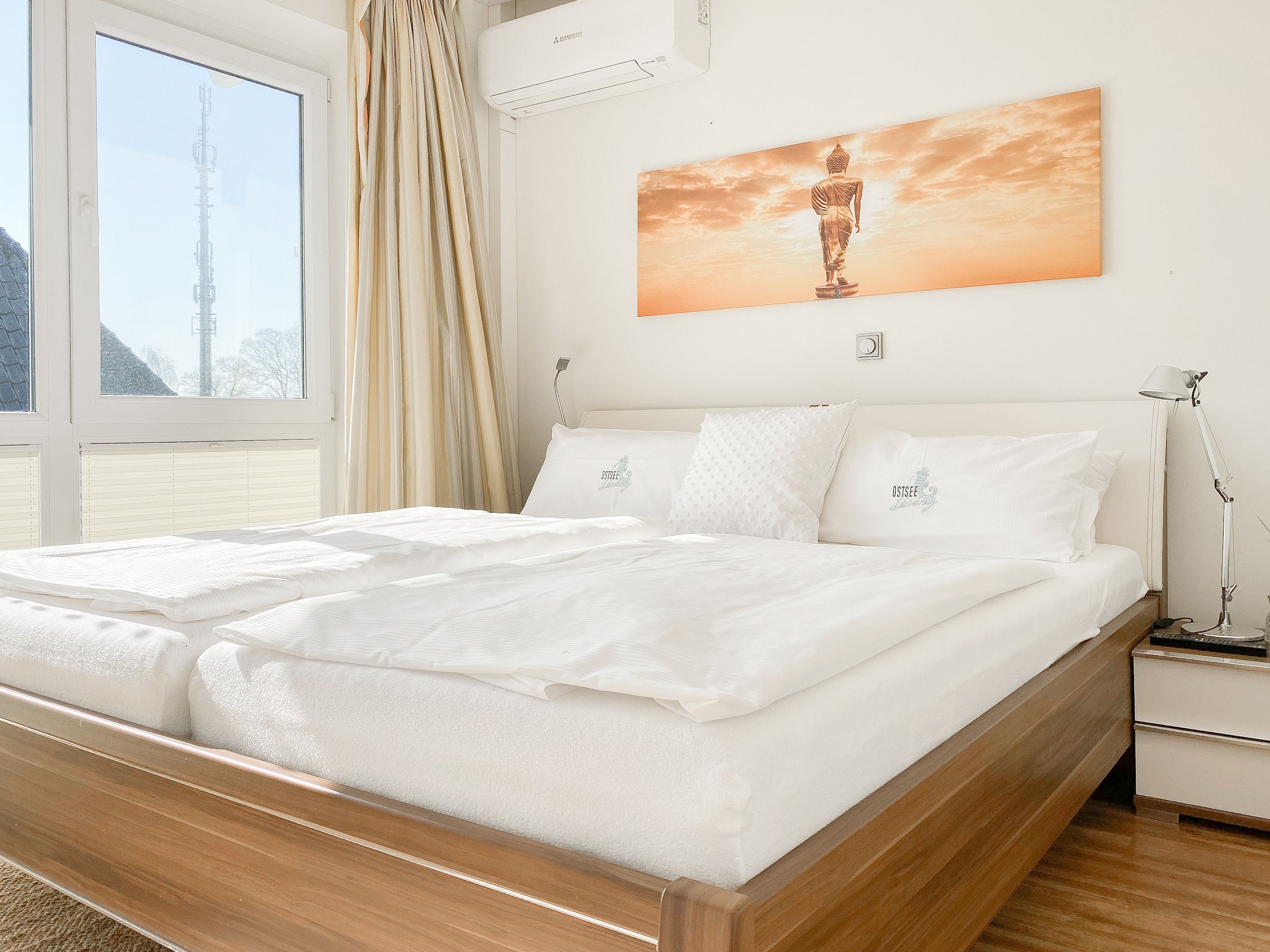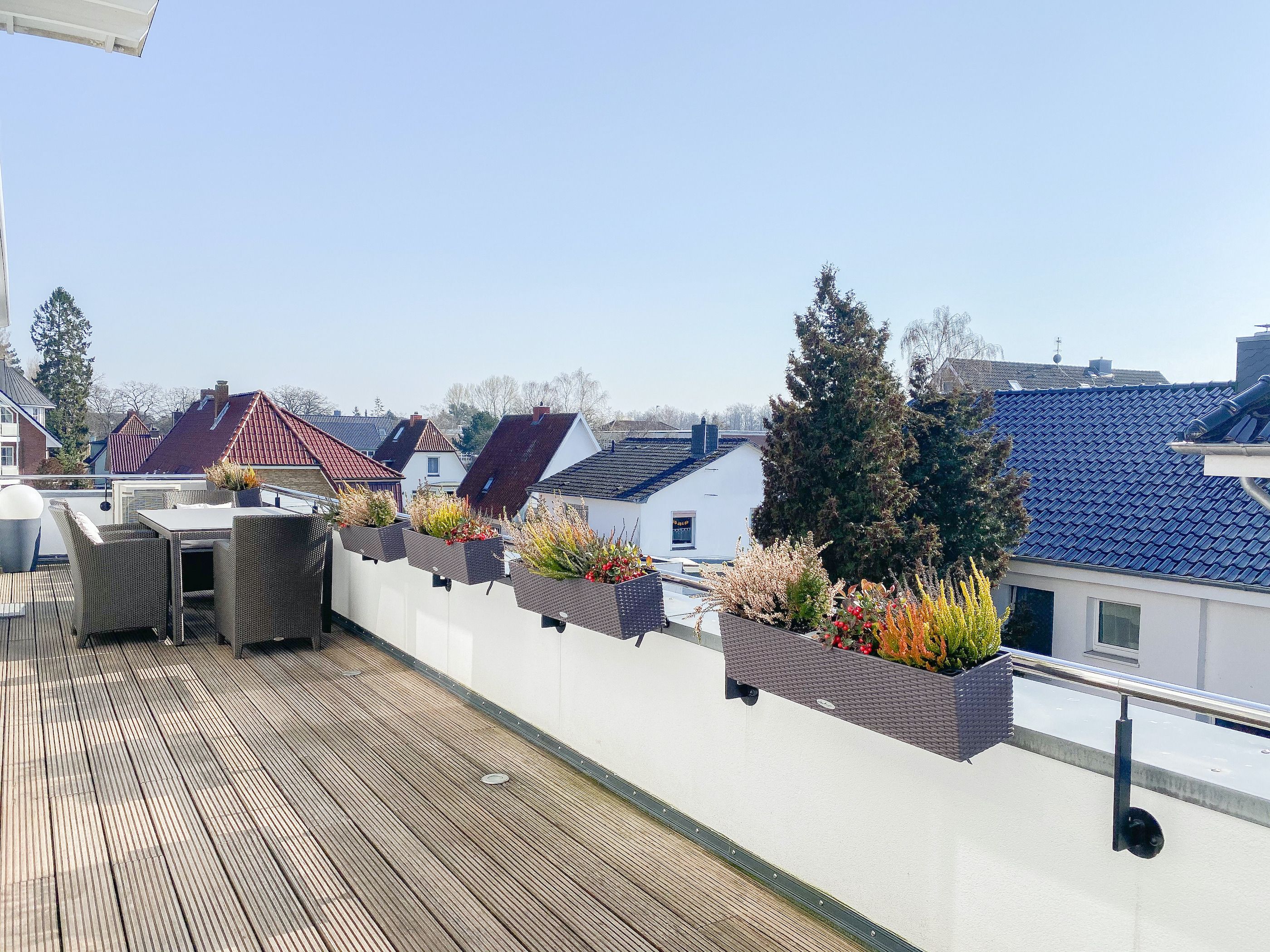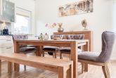 Das bestens ausgestattete Penthouse präsentiert sich als lichtdurchflutetes Loft über 2 Ebenen und bietet auf 100 qm Wohnfläche mit 3 Schlafzimmern und 2 Bädern ausreichend Raum für 6 Personen. Verbringen Sie zwanglose Urlaubstage auf der riesigen Dachterrasse in Südausrichtung, die mit Gartenmöbeln, Sonnenliegen und einer elektrischen Markise ausgestattet ist oder entspannen Sie in der großzügig angelegten Sauna, die auf der zweiten Wohnebene untergebracht ist. Eine Klimaanlage und Insektenschutzgitter sorgen zu jeder Jahreszeit für erholsamen Schlaf. Den Mittelpunkt des Objektes bildet der großzügige Wohn- Essbereich mit vielen Fenstern und äußerst hohen Decken sowie die offene, perfekt ausgestattete Küche. Zwei separate Schlafzimmer (Doppelbett 160x200 und Einzelbett mit Auszug) und ein äußerst hochwertig ausgestattetes Bad mit Walk In Dusche und Badewanne sind ebenfalls auf der unteren Ebene untergebracht. Das dritte Schlafzimmer (Doppelbett 180x200), ein weiteres Duschbad mit integriertem Waschtrockner und die Sauna sind über eine Treppe vom Wohnbereich zu erreichen. Alle Schlafzimmer sind mit einem TV und Verdunkelungsvorhängen ausgestattet. Insgesamt 4 TV, Radio, Bluetooth und WLAN gehören zum Entertainment-Paket. Ein fester PKW Stellplatz befindet sich auf dem Grundstück.