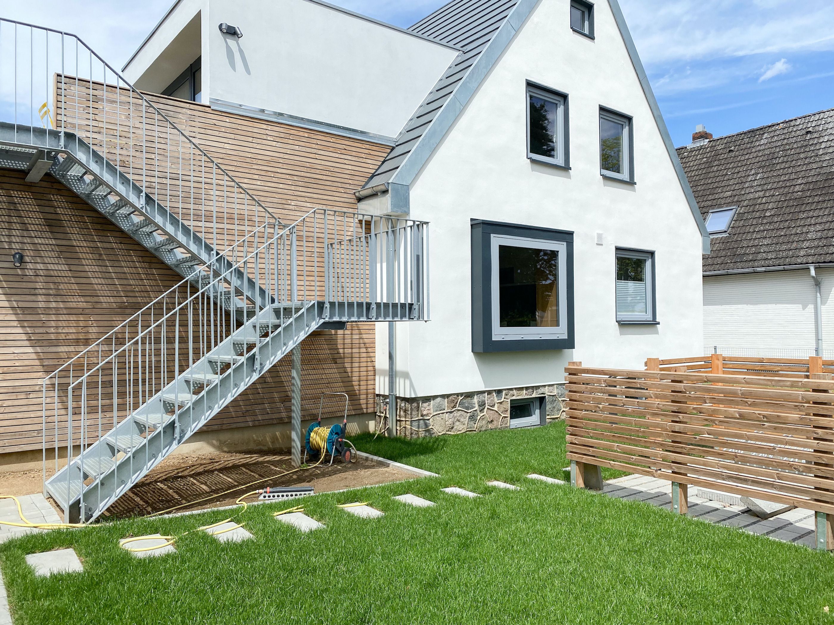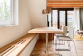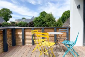 Über eine Außentreppe gelangt man über die Holzveranda zum privaten Eingang der Ferienwohnung. Ein Parkplatz befindet sich auf dem Grundstück direkt am Haus, ebenso ein Fahrradständer. Im Erdgeschoss des Doppelhauses befindet sich die Ferienwohnung Fuchsbau mit 2 Schlafzimmern. Eine gute Möglichkeit mit Freunden in einem Objekt zu urlauben oder eine Großfamilie unter zu bringen.