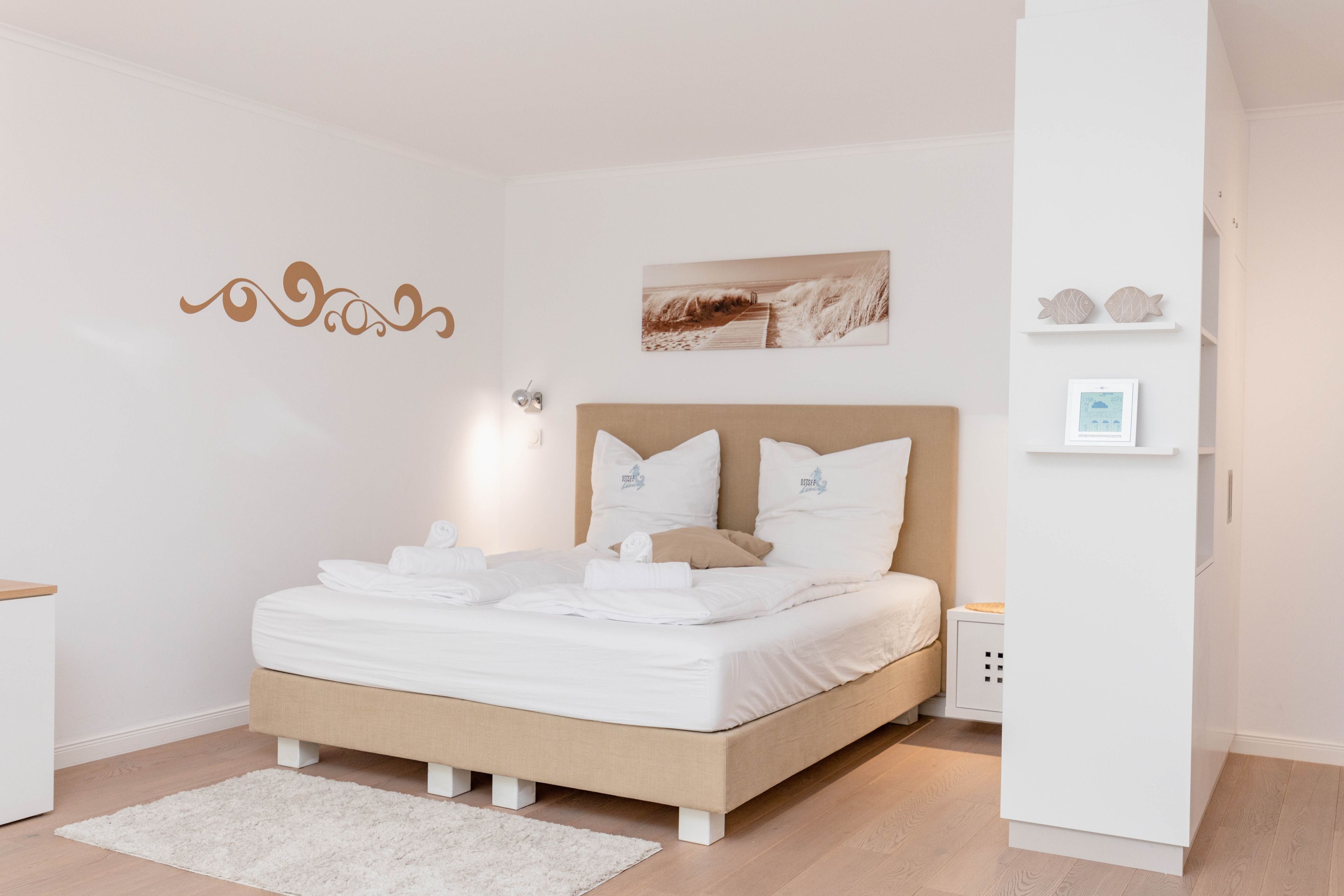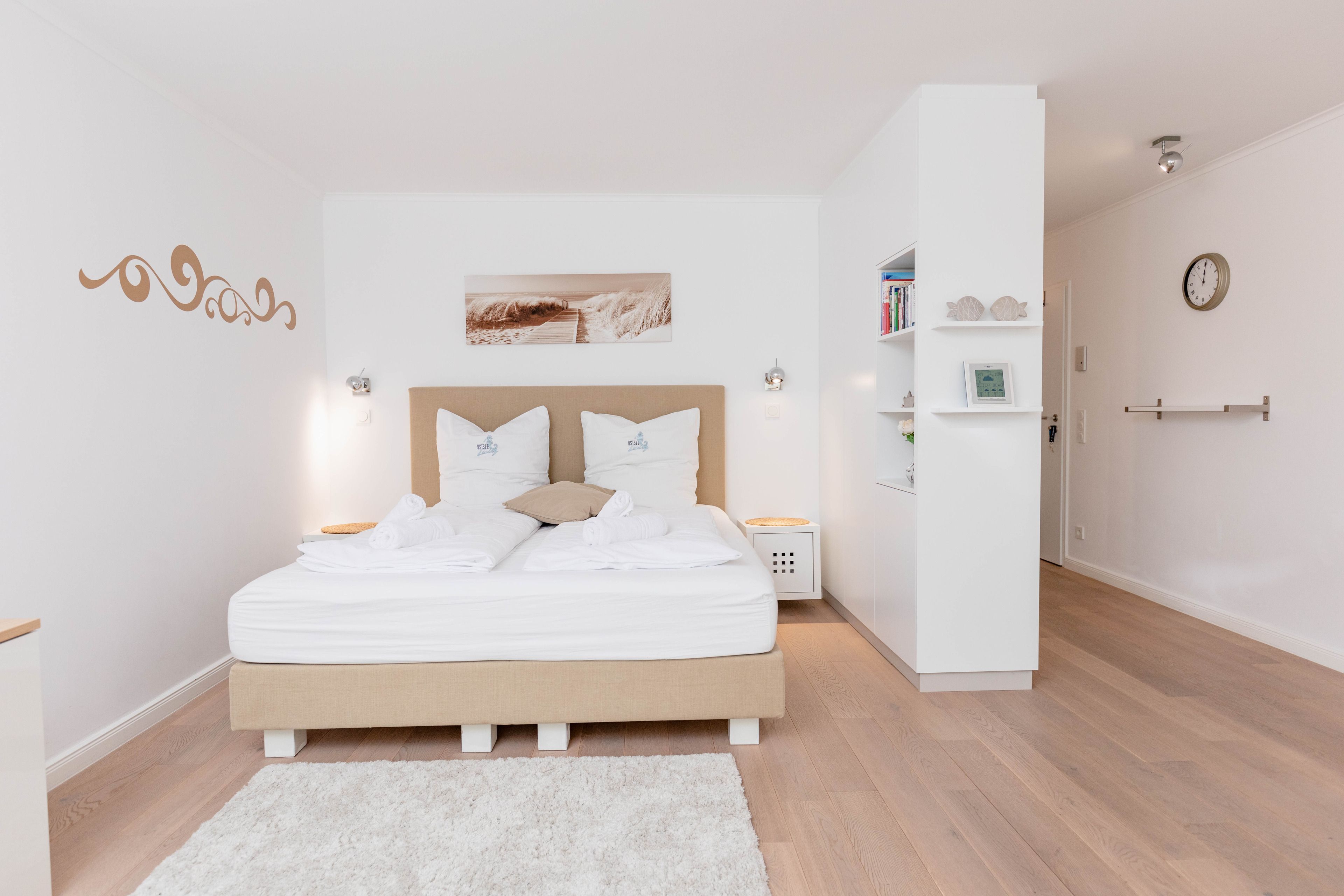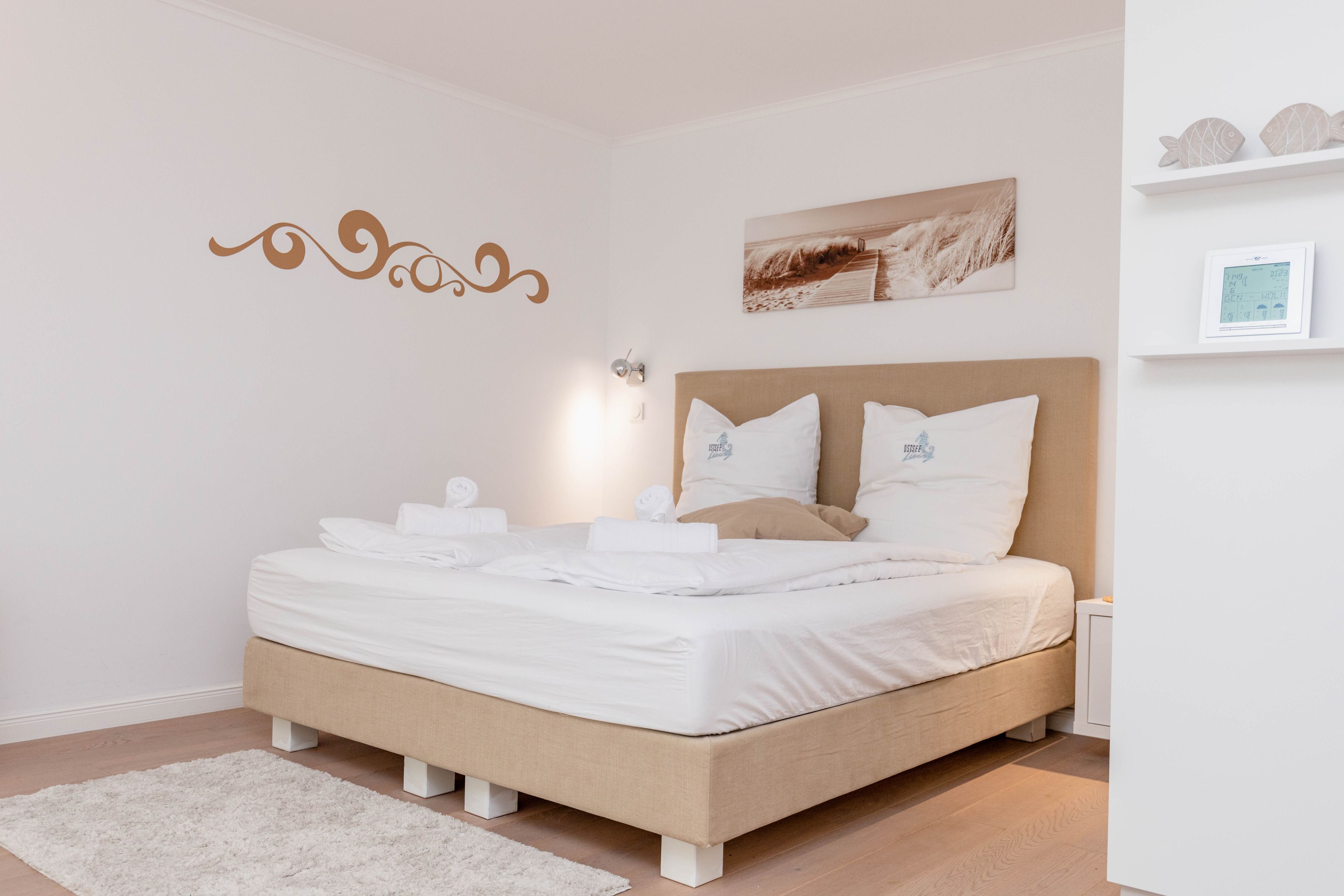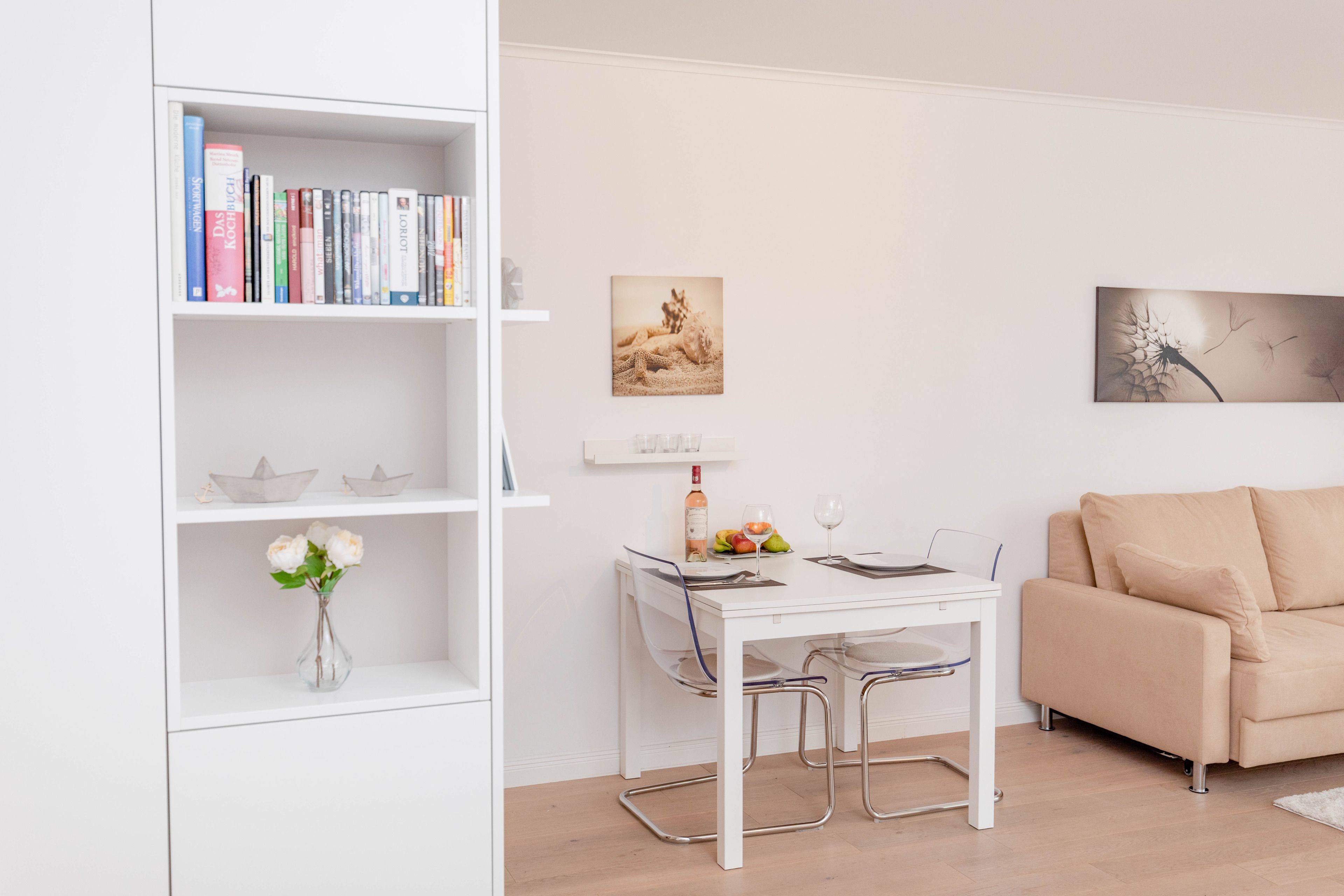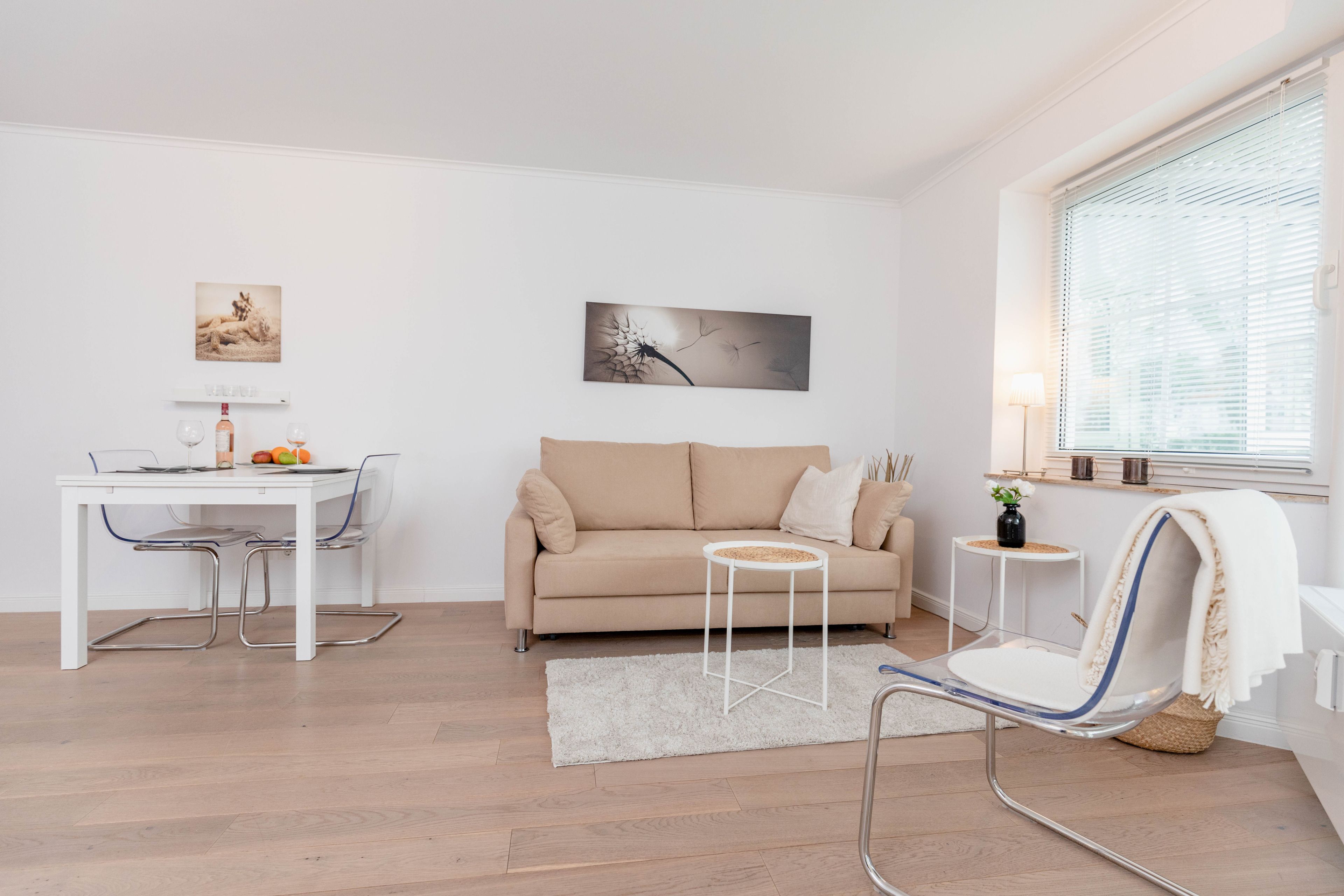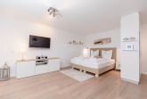 Bodentiefe Fensterelemente, Echtholzparkett und die hochwertige Einrichtung schaffen eine helle und freundliche Wohnatmosphäre. Die 42 qm wurden optimal genutzt und bieten ausreichend Platz für 2 Personen. Es steht ein geschmackvoller, großzügiger Wohn- Schlafbereich mit einem bequemen Sofa  und ein Essbereich für 2 Personen zur Verfügung. Das hochwertige Luxusbett aus der Bettenmanufaktur Sleep&Dream superior in Hotelqualität (180x200) ist besonders hervorzuheben und Garant für einen erholsamen Schlaf. Unterhaltung bieten der Sony TV 50 Zoll (127 cm) schwenkbar mit USB Anschluß, Blue-Ray Player, Hifi-Anlage mit Bluetooth und kostenloser Internetzugang über WLAN. Die moderne individuell eingerichtete Küchenzeile ist bestens ausgestattet und verfügt über Geschirrspülmaschine und Mikrowelle mit Backfunktion.  Das moderne, geräumige Bad verfügt über eine Dusche, Waschtisch, WC, Handtuchwärmer und Fön. Tiefgaragenstellplatz (Einfahrtshöhe 1,75 m), Aufzug, Fahrradkeller (eine Platzgarantie für Ihre Fahrräder besteht nicht) sowie Waschmaschine und Trockner (Münzgeräte) sind vorhanden.
