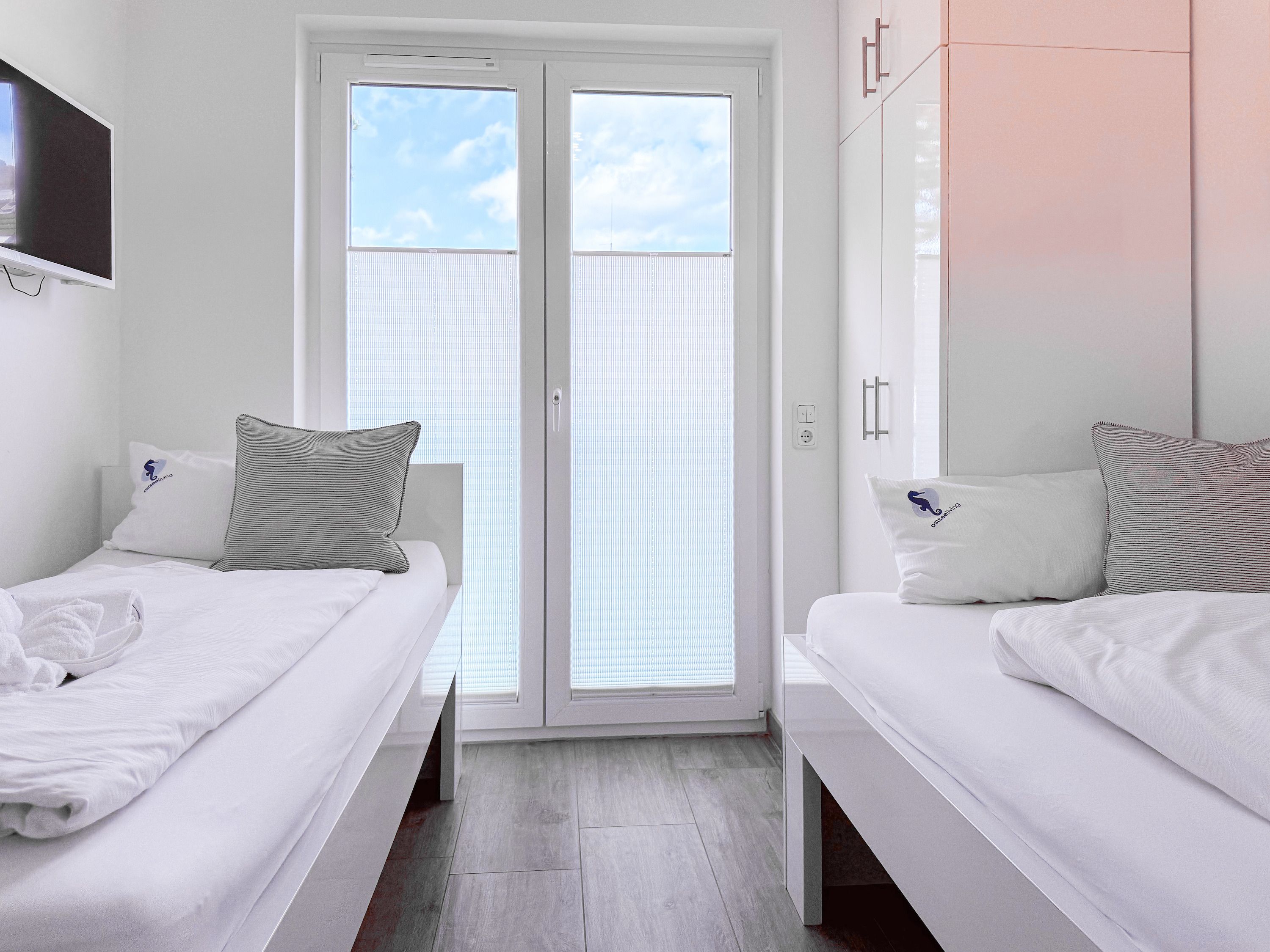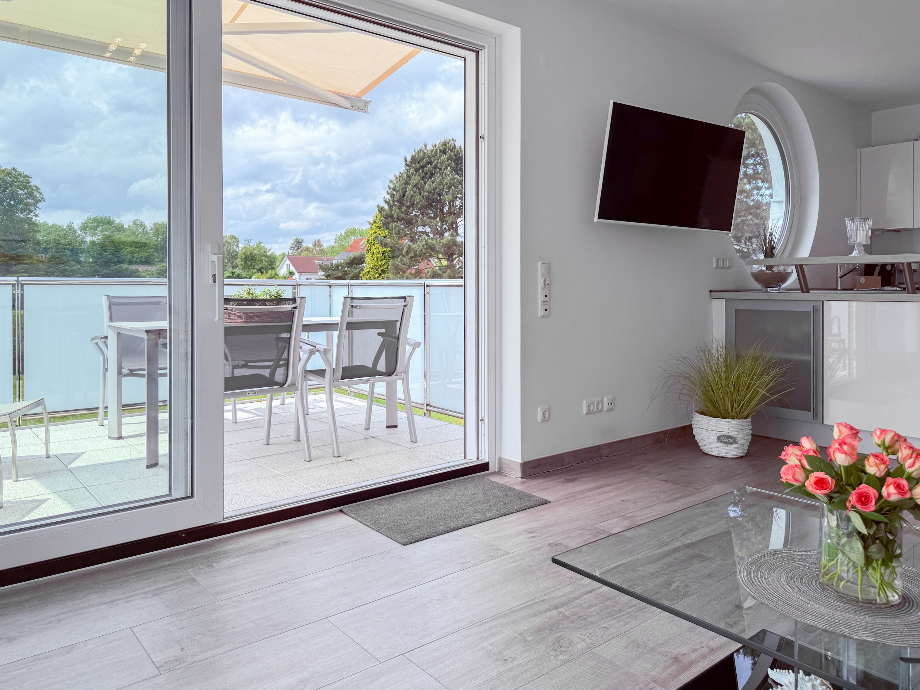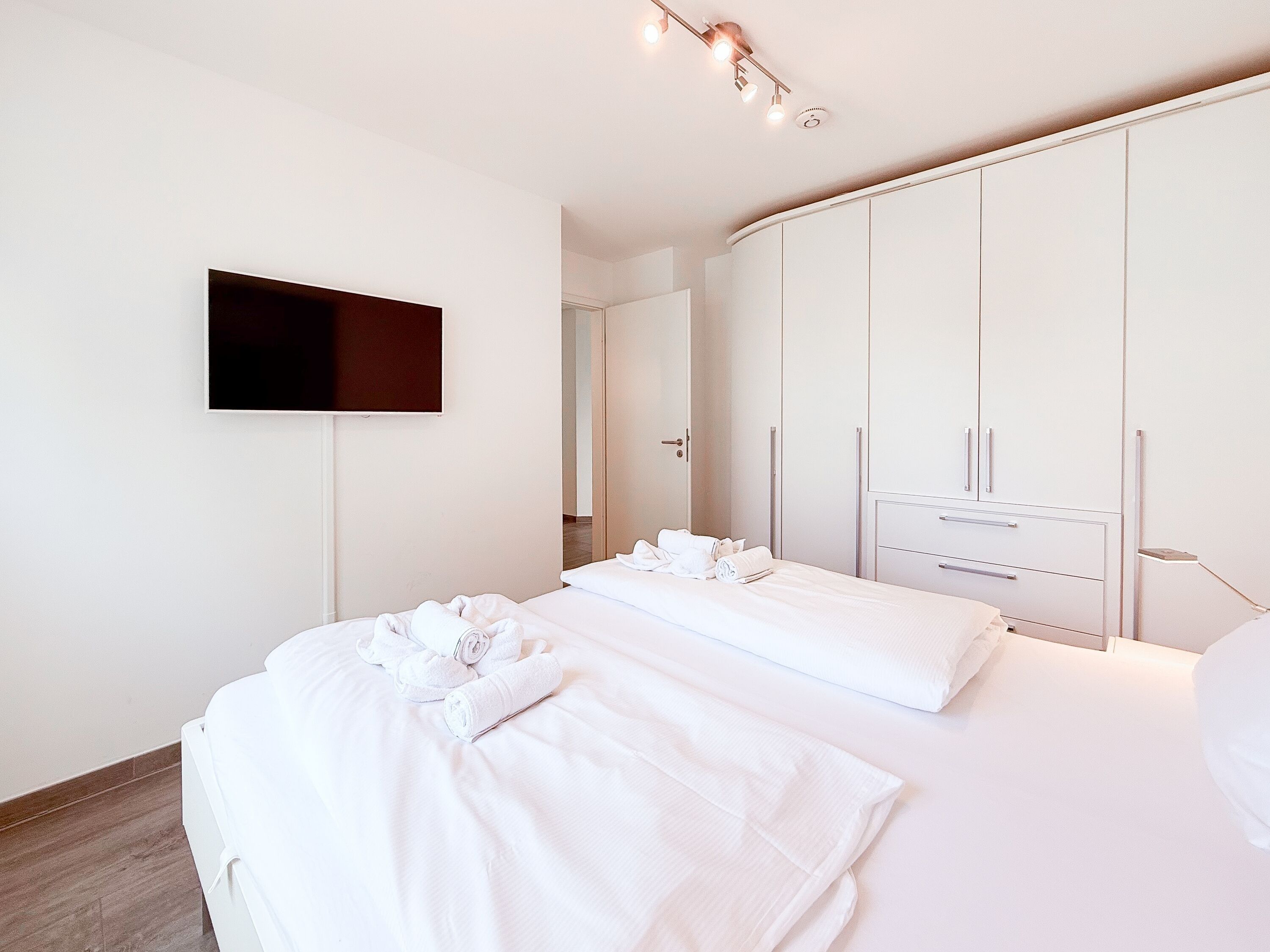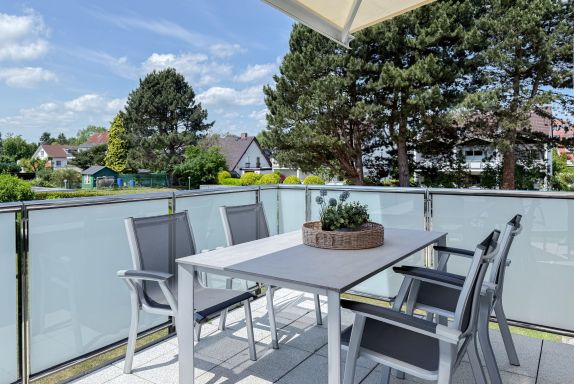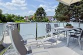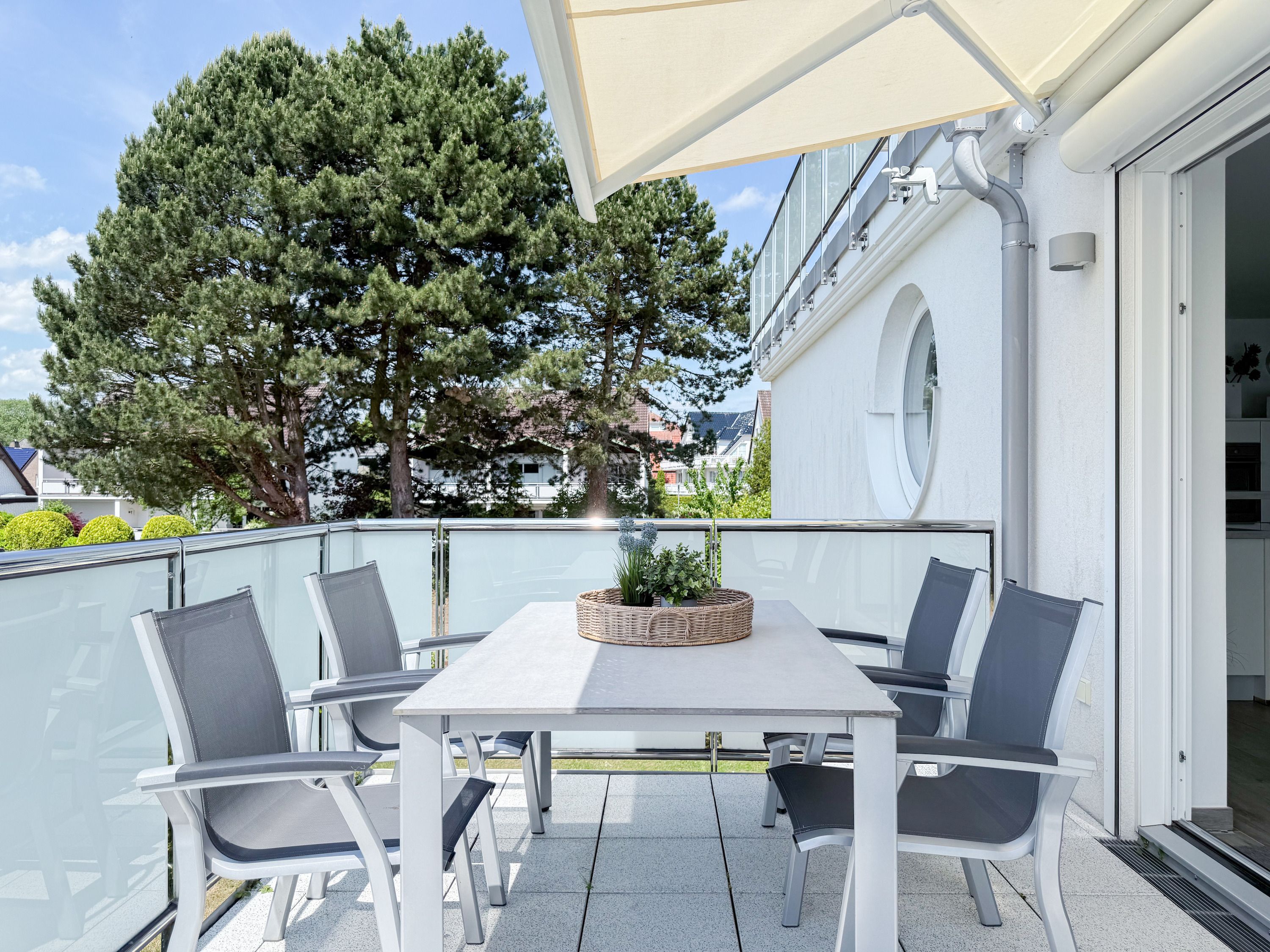 Die luxuriöse Ferienwohnung bietet mit 2 separaten Schlafzimmern ausreichend Platz für 4 Personen, um einen schönen Urlaub zu verleben. Es stehen ein Doppelbett (180x200) und zwei Einzelbetten (80x200) zur Verfügung. Beide Schlafzimmer sind mit einem TV ausgestattet. Bei der Einrichtung und Ausstattung der Immobilie wurde nicht gespart und sehr viel Wert auf hochwertige Materialien gelegt. 3 TV, Hifi-Anlage, Bose Bluetooth Anlage, kostenloser Internetzugang über WLAN, Fußbodenheizung, elektrische Außenjalousien, modernes Duschbad mit viel Tageslicht und integrierter Waschmaschine. Die hochwertige, moderne Einbauküche mit angrenzendem Essbereich ist bestens mit allen technischen Geräten ausgestattet und genügt höchsten Ansprüchen. Sehr charmant ist der Blick ins Grüne durch das große Bullauge. Übergroße Fensterelemente sorgen für einen lichtdurchfluteten Wohnbereich mit Blick zur ruhigen Gartenseite und auf den großzügig angelegten Südwestbalkon mit Dachterrassen Charakter, selbstverständlich komfortabel möbliert mit Sitzgruppe, Sonnenliegen und elektrischer Außenmarkise.