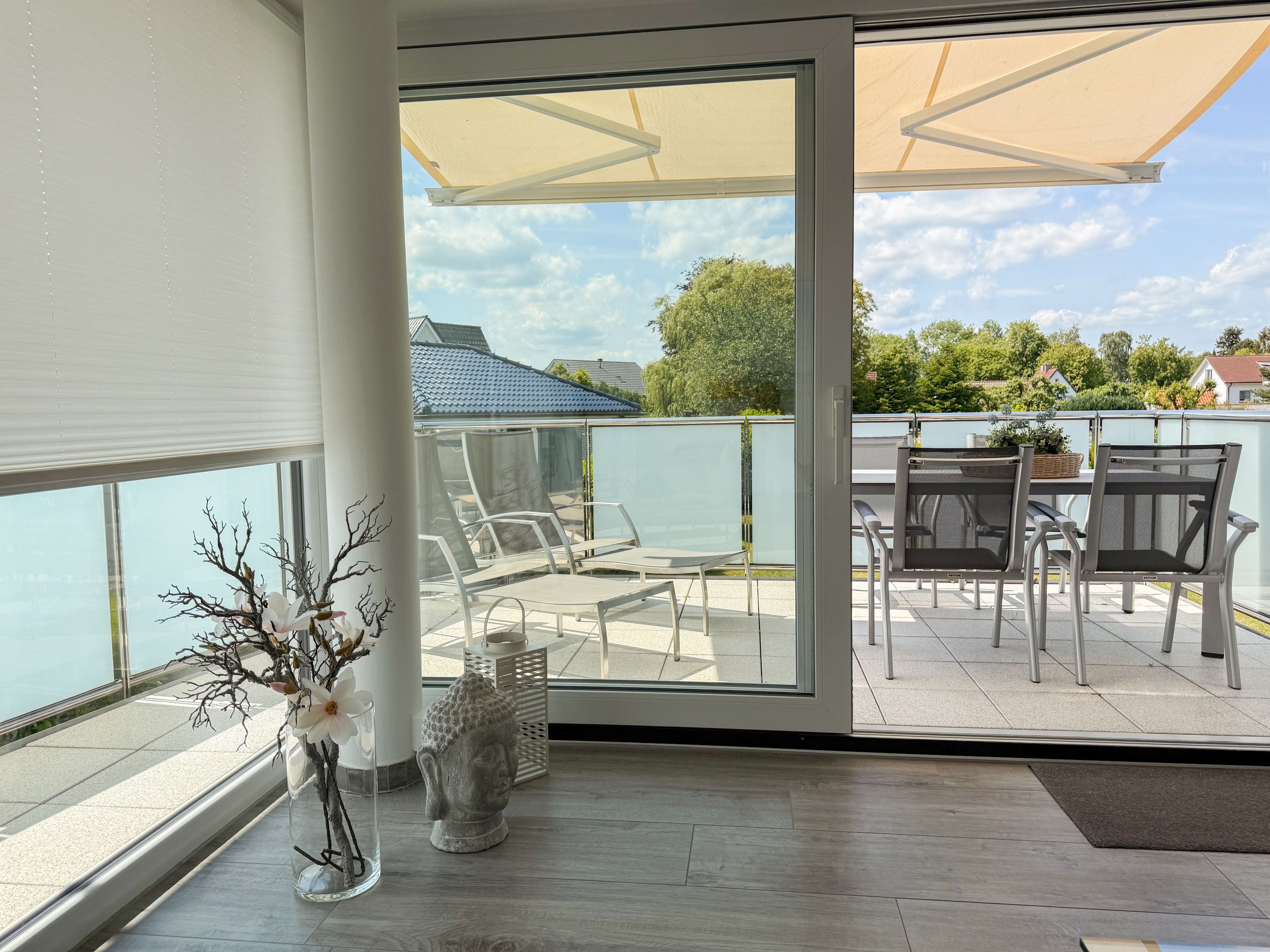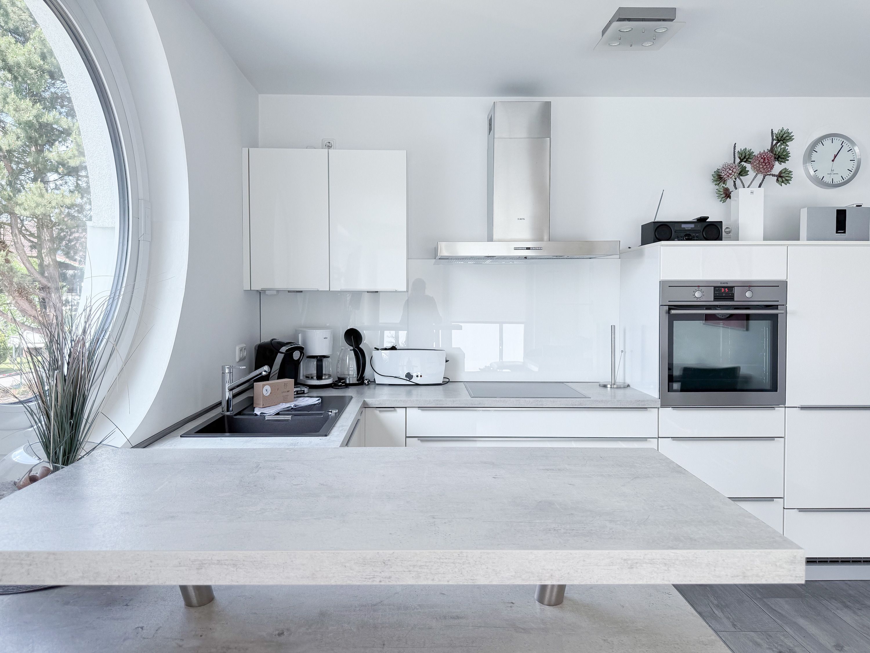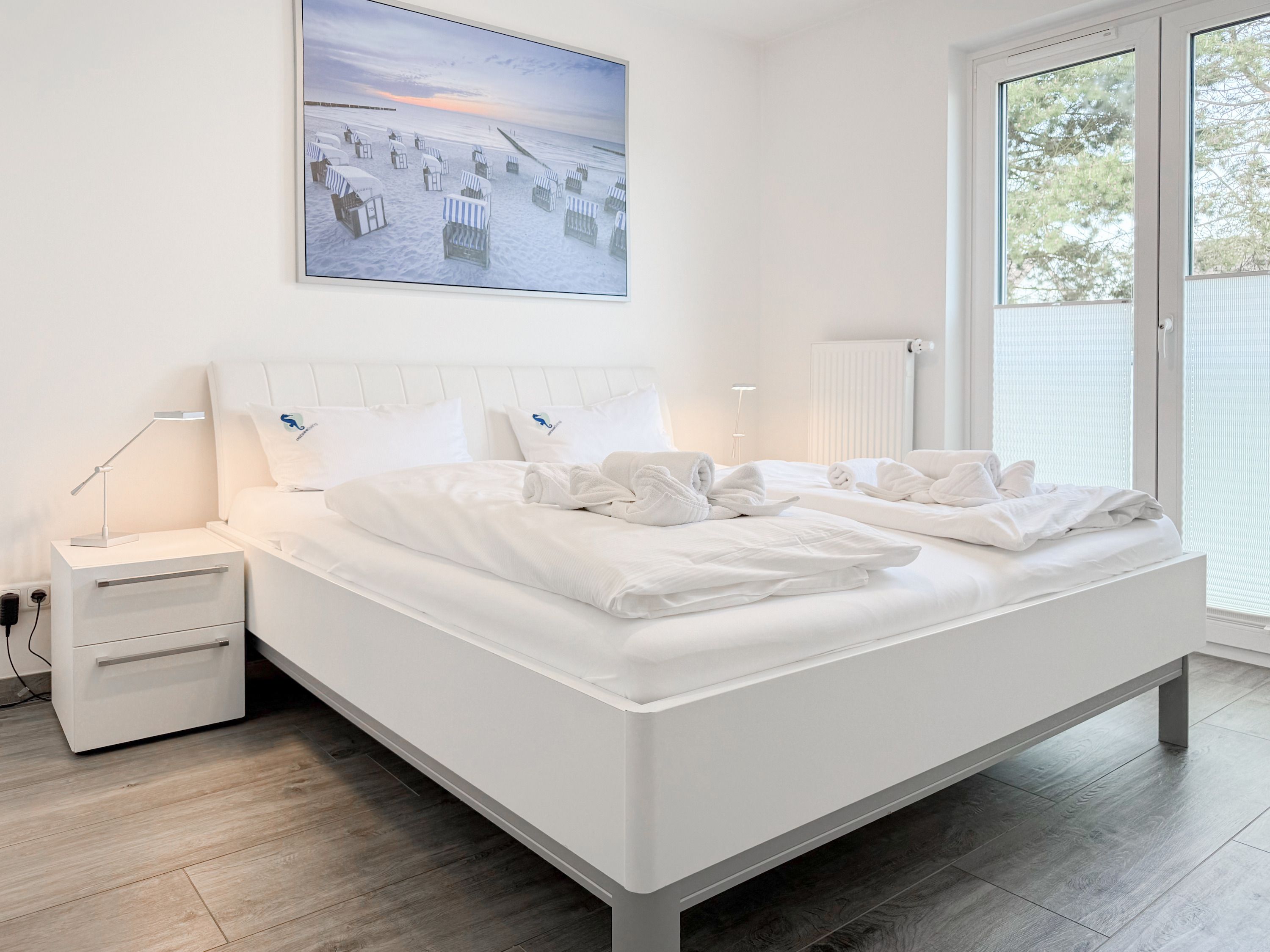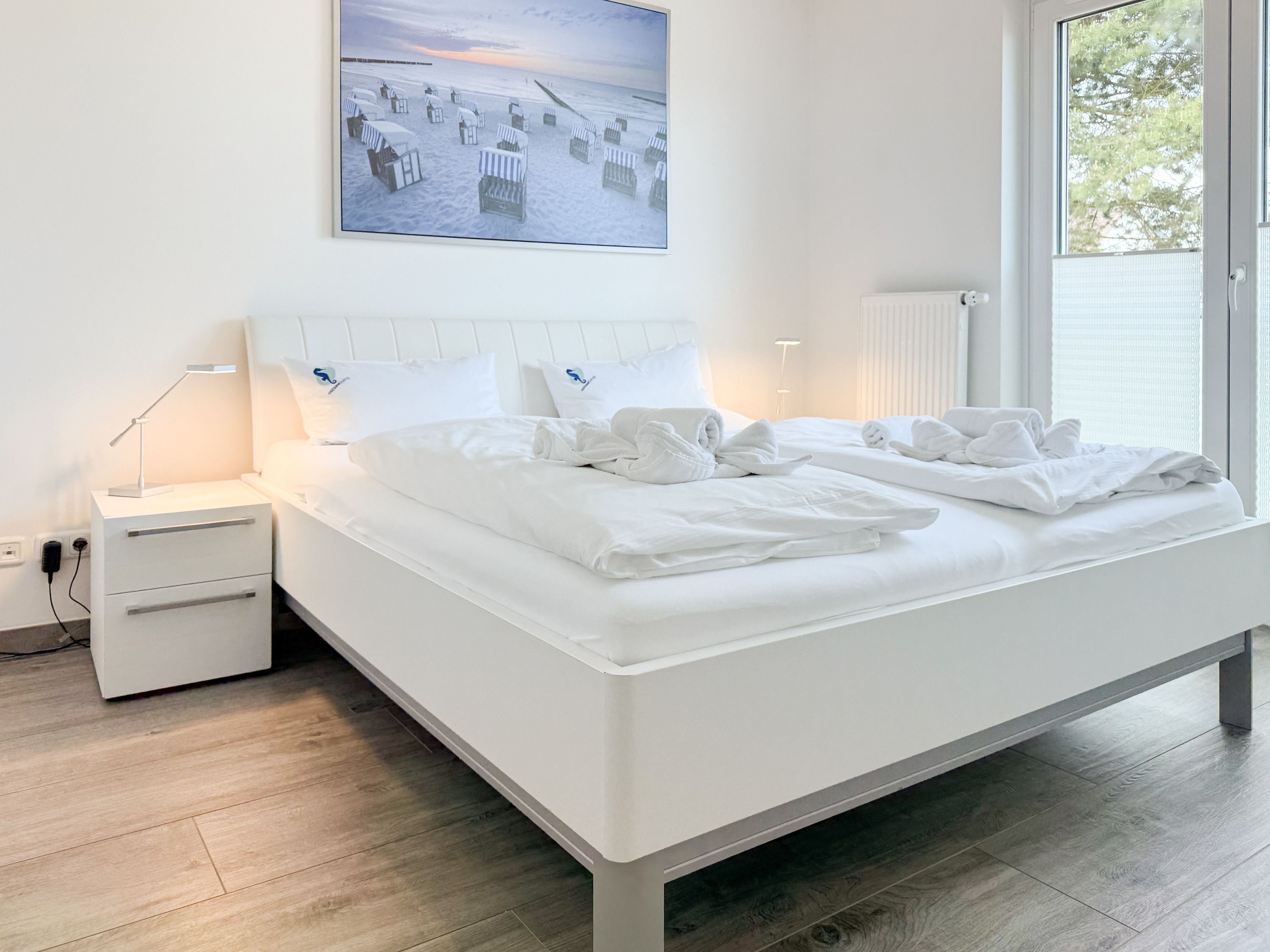 Die luxuriöse Ferienwohnung bietet mit 2 separaten Schlafzimmern ausreichend Platz für 4 Personen, um einen schönen Urlaub zu verleben. Es stehen ein Doppelbett (180x200) und zwei Einzelbetten (80x200) zur Verfügung. Beide Schlafzimmer sind mit einem TV ausgestattet. Bei der Einrichtung und Ausstattung der Immobilie wurde nicht gespart und sehr viel Wert auf hochwertige Materialien gelegt. 3 TV, Hifi-Anlage, Bose Bluetooth Anlage, kostenloser Internetzugang über WLAN, Fußbodenheizung, elektrische Außenjalousien, modernes Duschbad mit viel Tageslicht und integrierter Waschmaschine. Die hochwertige, moderne Einbauküche mit angrenzendem Essbereich ist bestens mit allen technischen Geräten ausgestattet und genügt höchsten Ansprüchen. Sehr charmant ist der Blick ins Grüne durch das große Bullauge. Übergroße Fensterelemente sorgen für einen lichtdurchfluteten Wohnbereich mit Blick zur ruhigen Gartenseite und auf den großzügig angelegten Südwestbalkon mit Dachterrassen Charakter, selbstverständlich komfortabel möbliert mit Sitzgruppe, Sonnenliegen und elektrischer Außenmarkise.